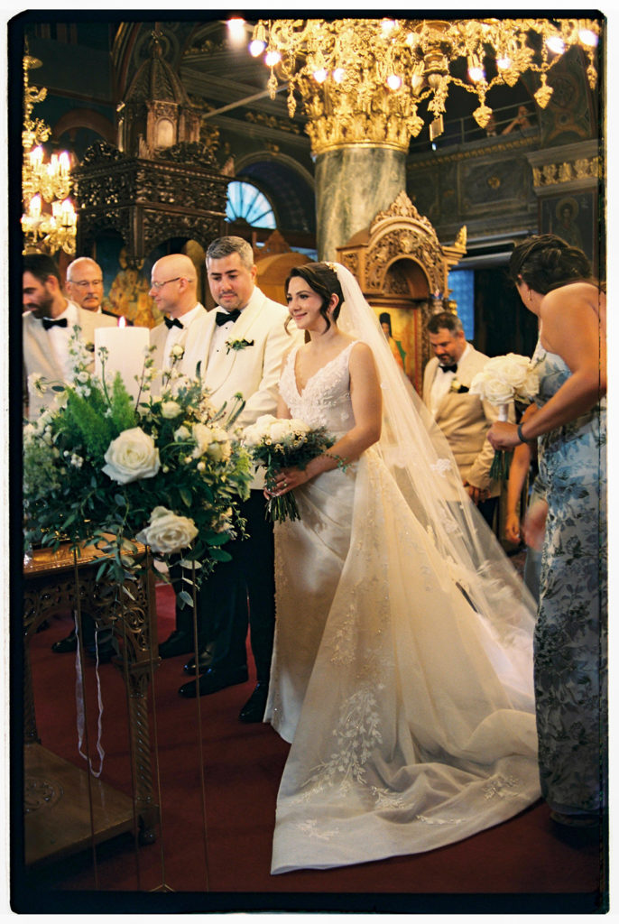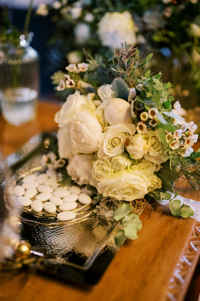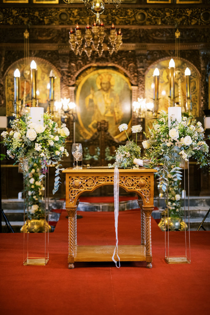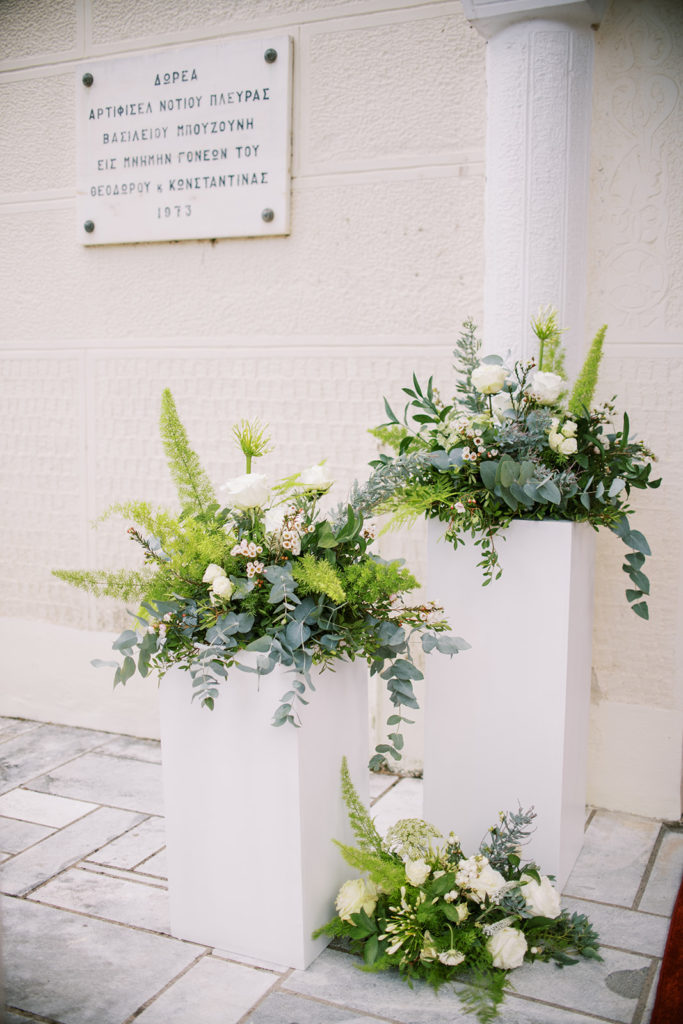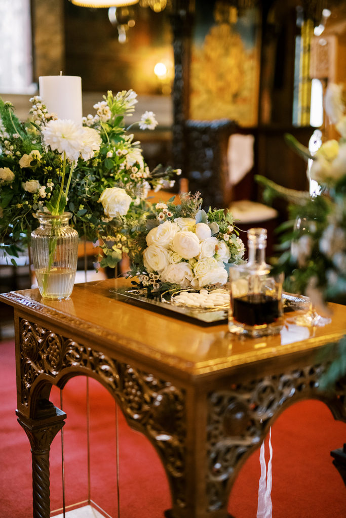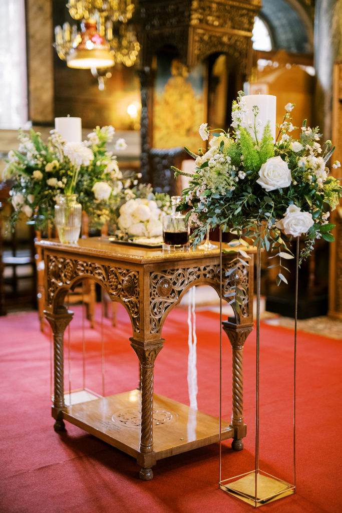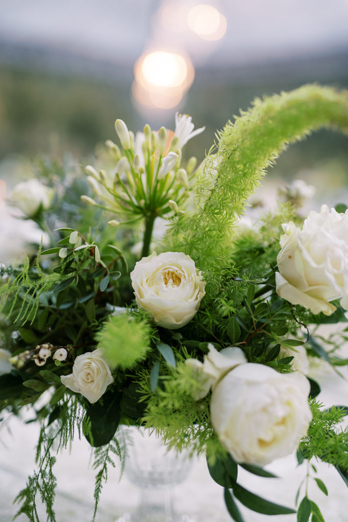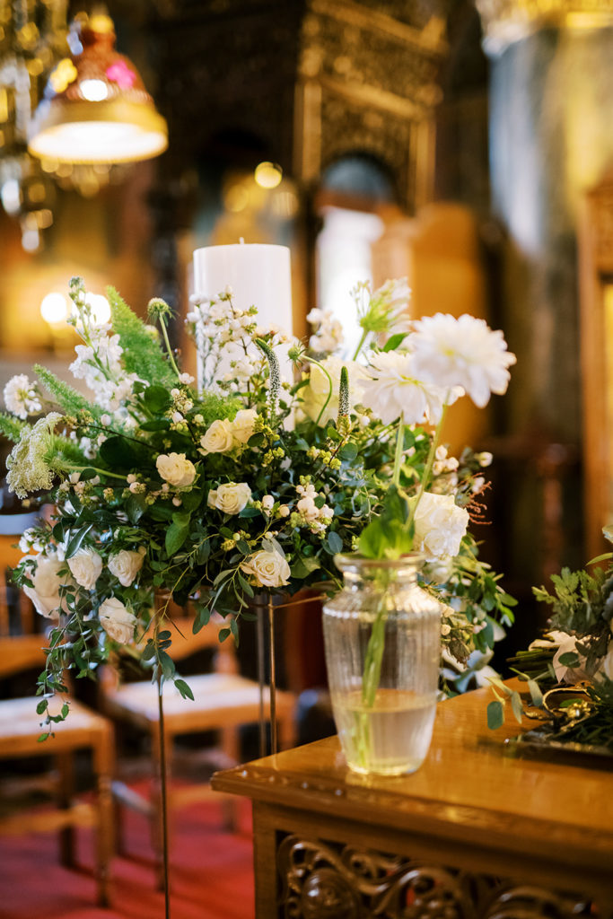 The floral palette embraced soothing greens and soft whites, bringing the beauty of nature into every detail. Elegant arrangements of roses, delphinium, hydrangeas, and wild greenery adorned the ceremony and reception spaces, echoing the surrounding forest. Inside the stone-clad chapel, lush florals framed the traditional Greek wedding ritual with a delicate yet refined aesthetic, perfectly matching the bride’s timeless style.