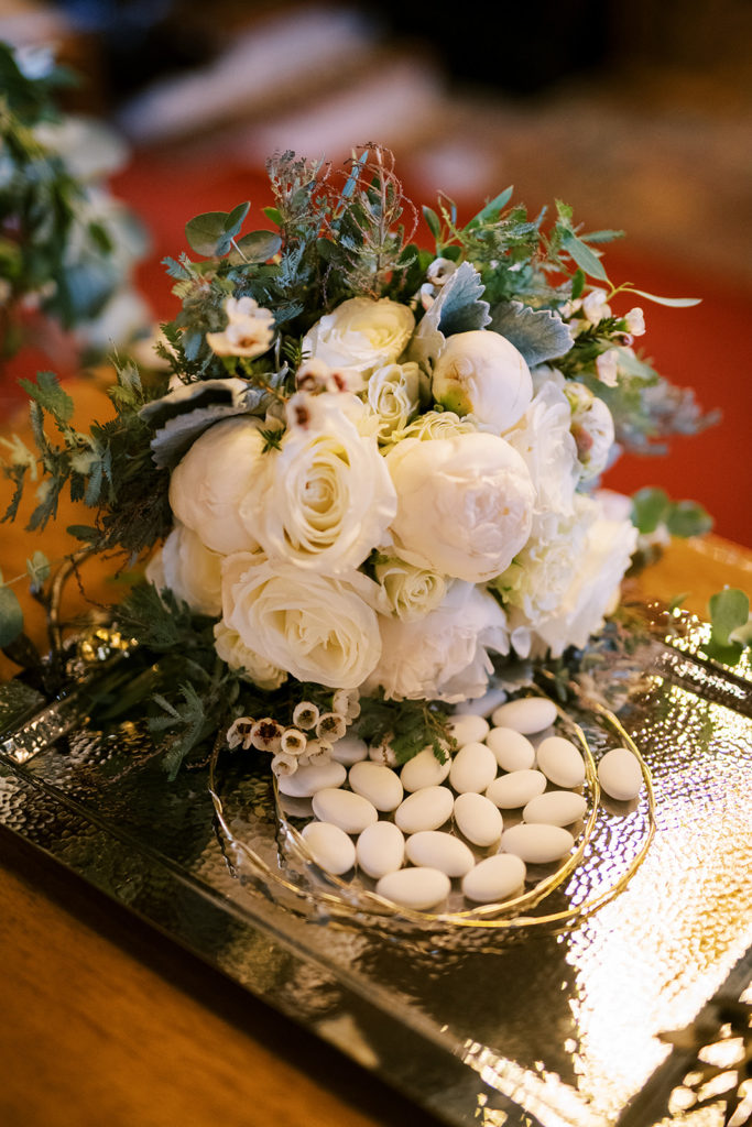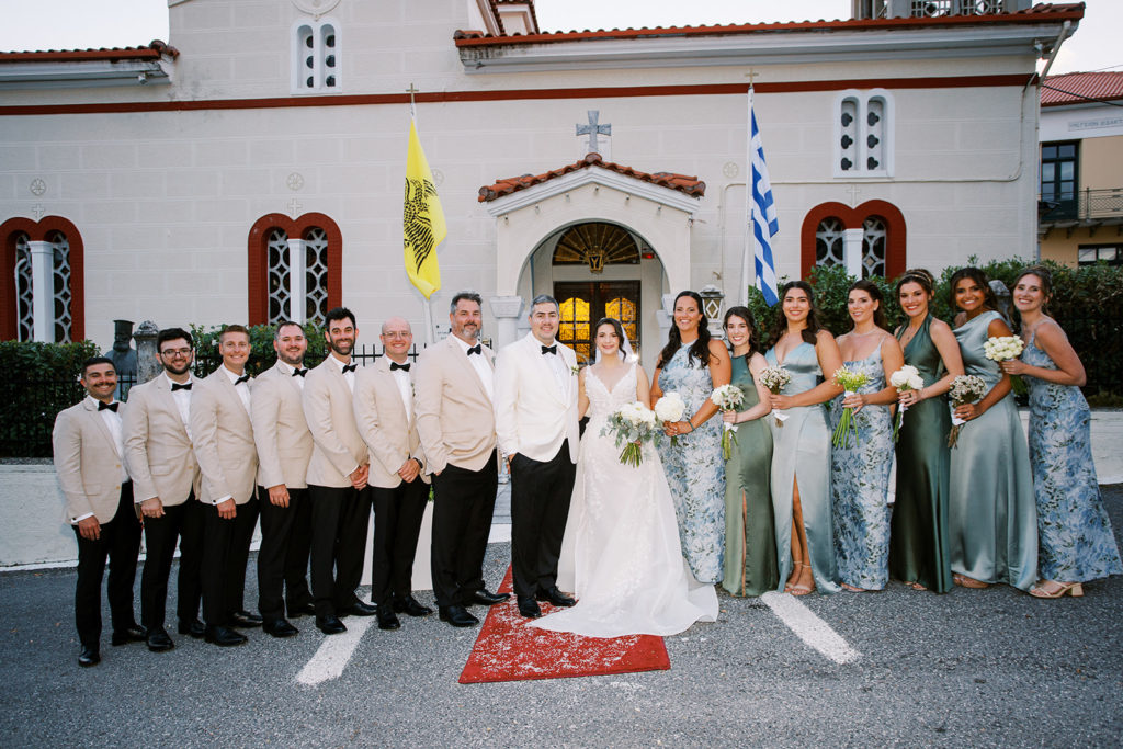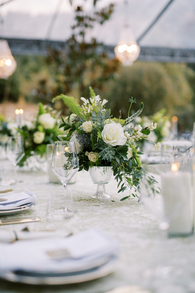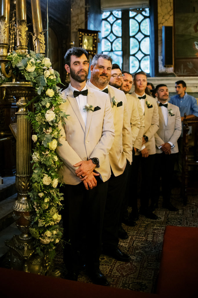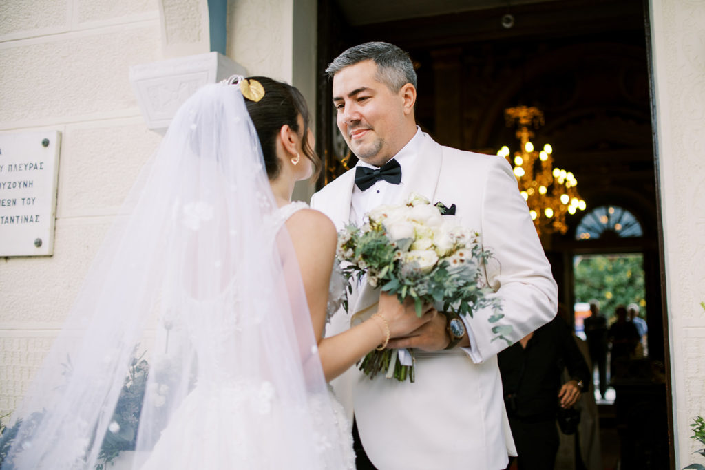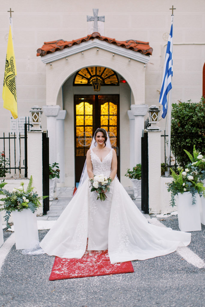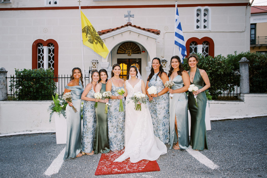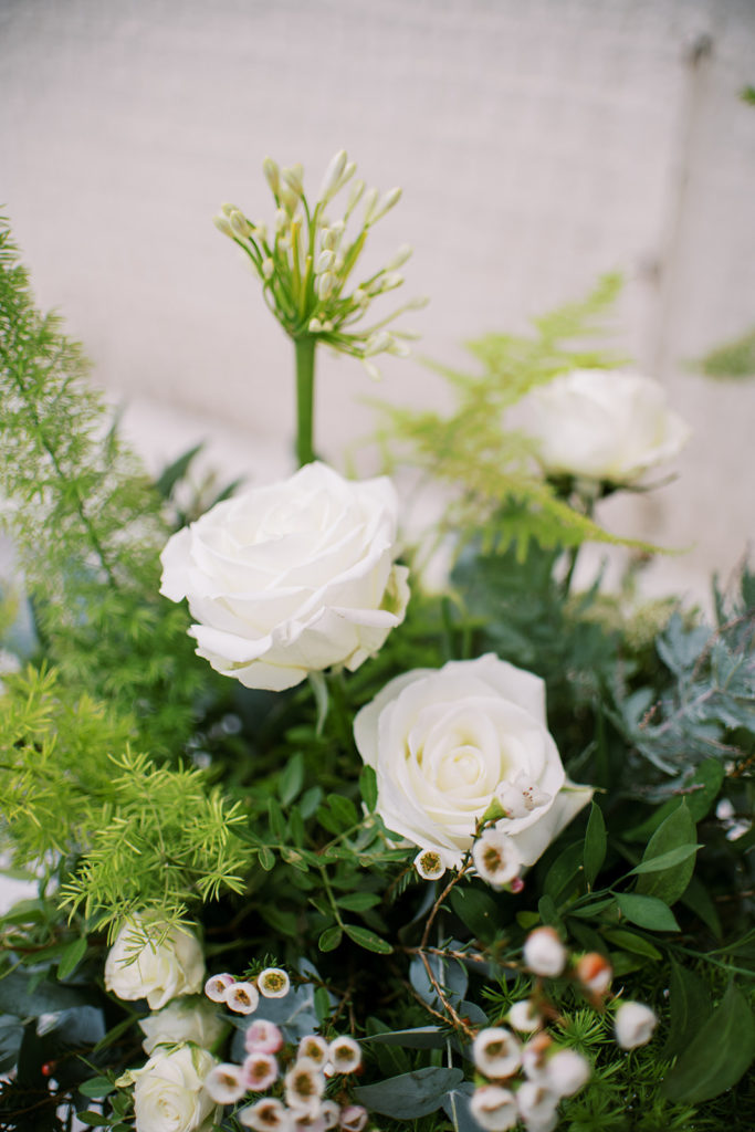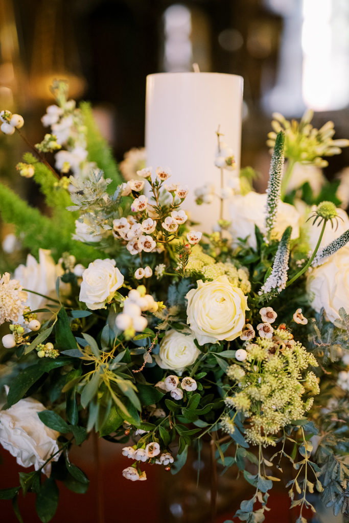 The floral palette embraced soothing greens and soft whites, bringing the beauty of nature into every detail. Elegant arrangements of roses, delphinium, hydrangeas, and wild greenery adorned the ceremony and reception spaces, echoing the surrounding forest. Inside the stone-clad chapel, lush florals framed the traditional Greek wedding ritual with a delicate yet refined aesthetic, perfectly matching the bride’s timeless style.