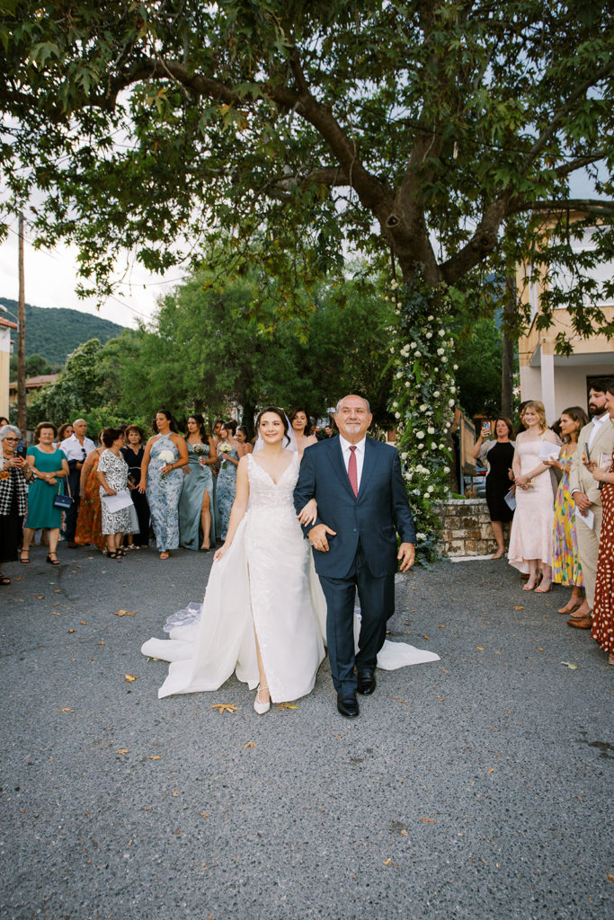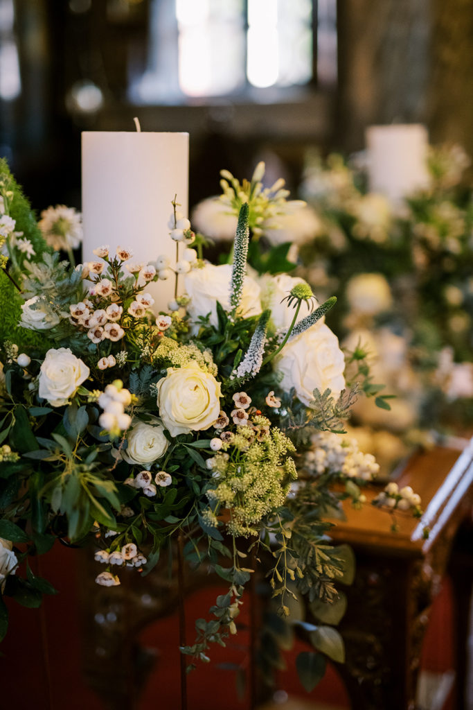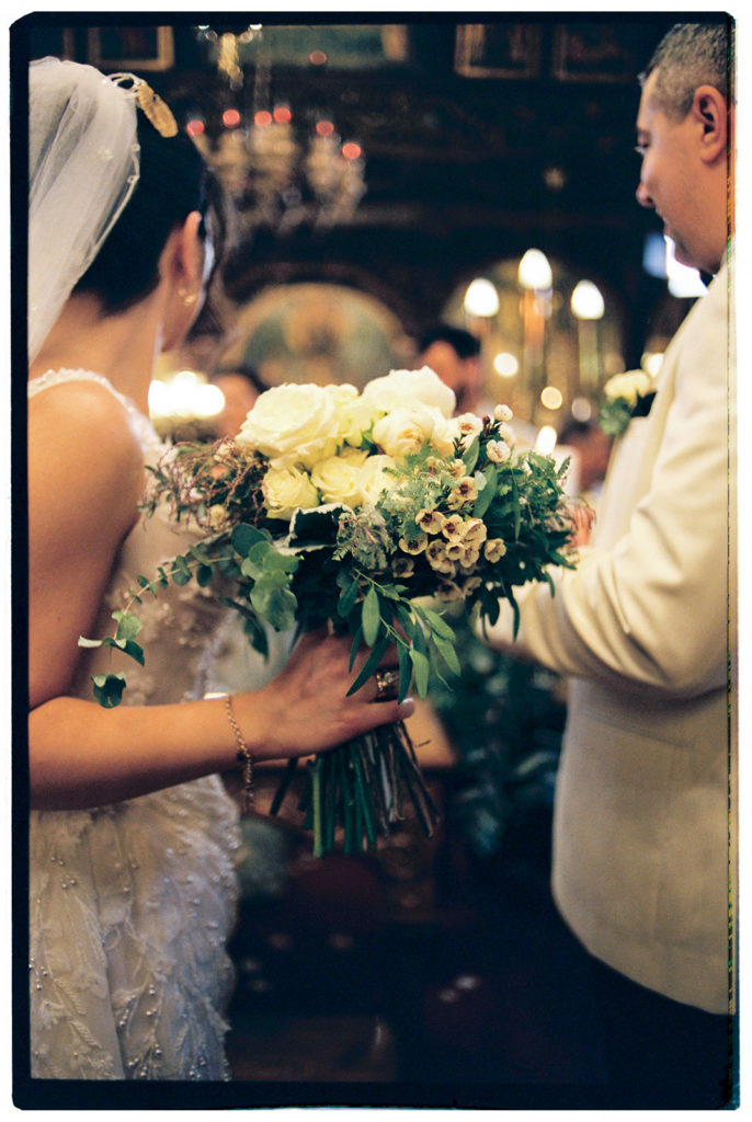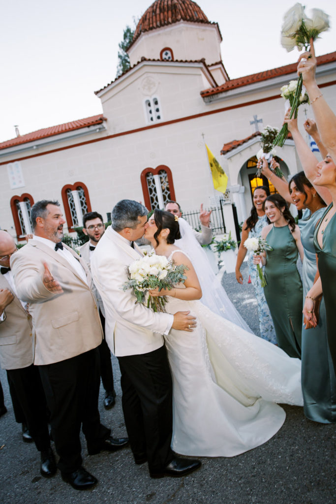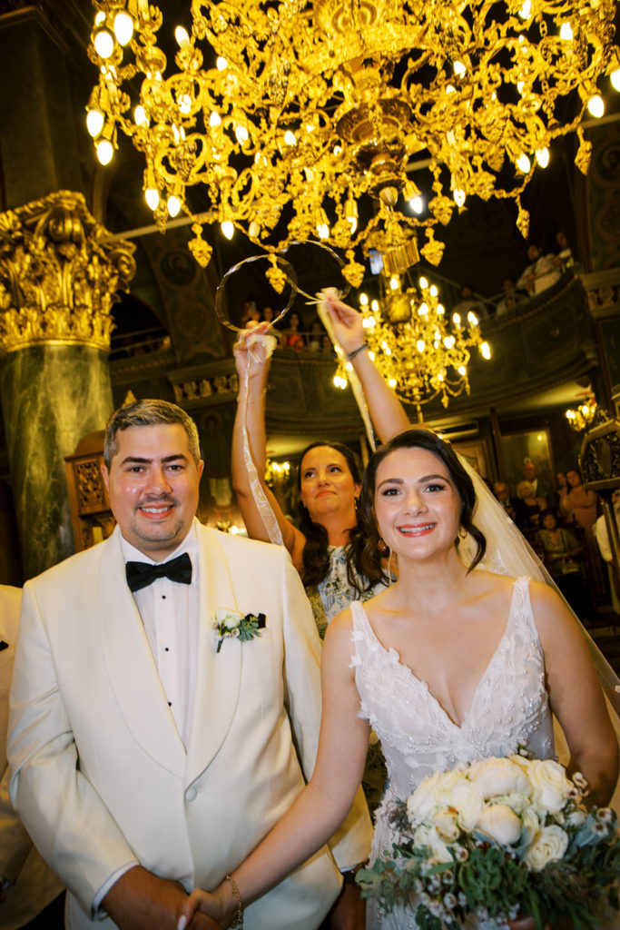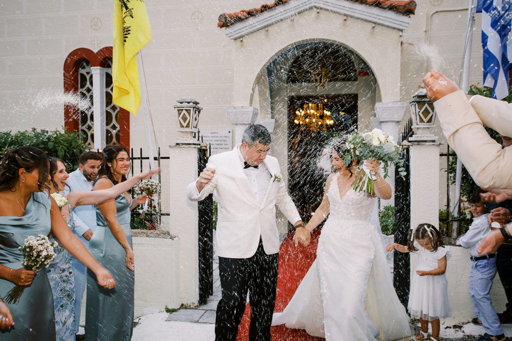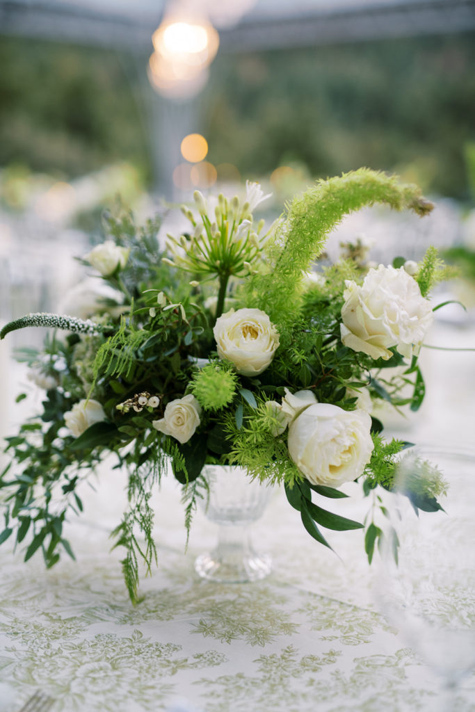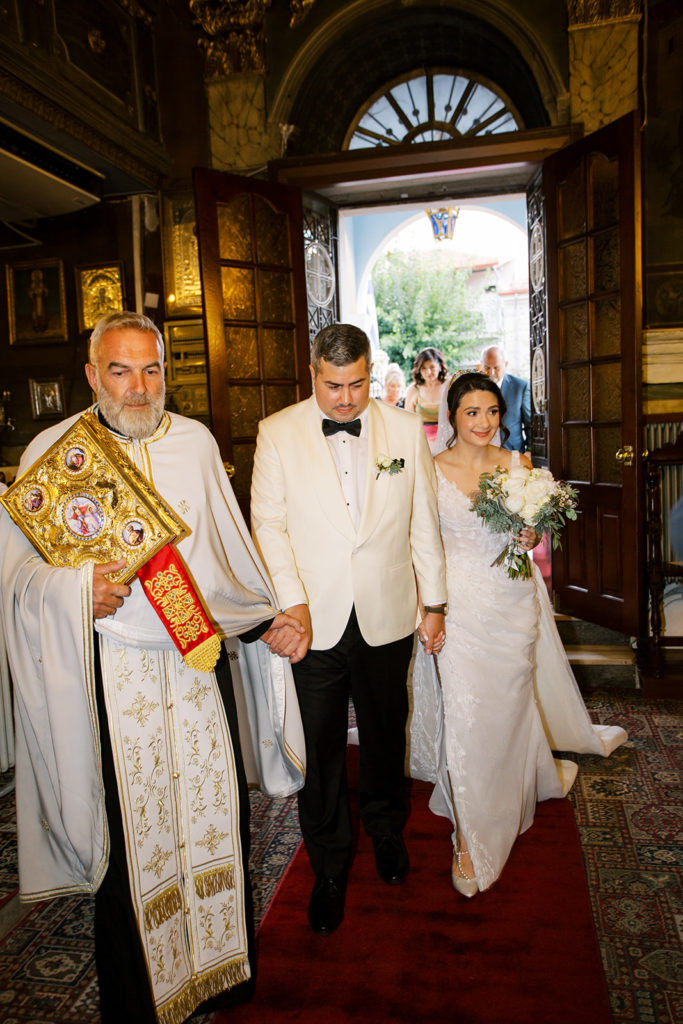 The floral palette embraced soothing greens and soft whites, bringing the beauty of nature into every detail. Elegant arrangements of roses, delphinium, hydrangeas, and wild greenery adorned the ceremony and reception spaces, echoing the surrounding forest. Inside the stone-clad chapel, lush florals framed the traditional Greek wedding ritual with a delicate yet refined aesthetic, perfectly matching the bride’s timeless style.