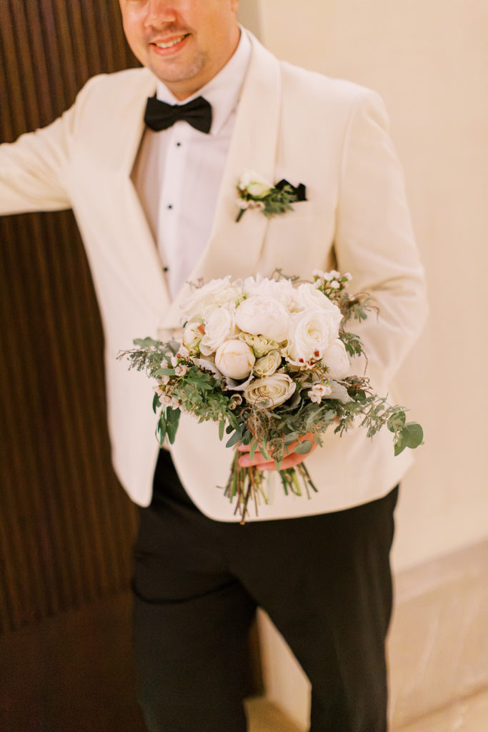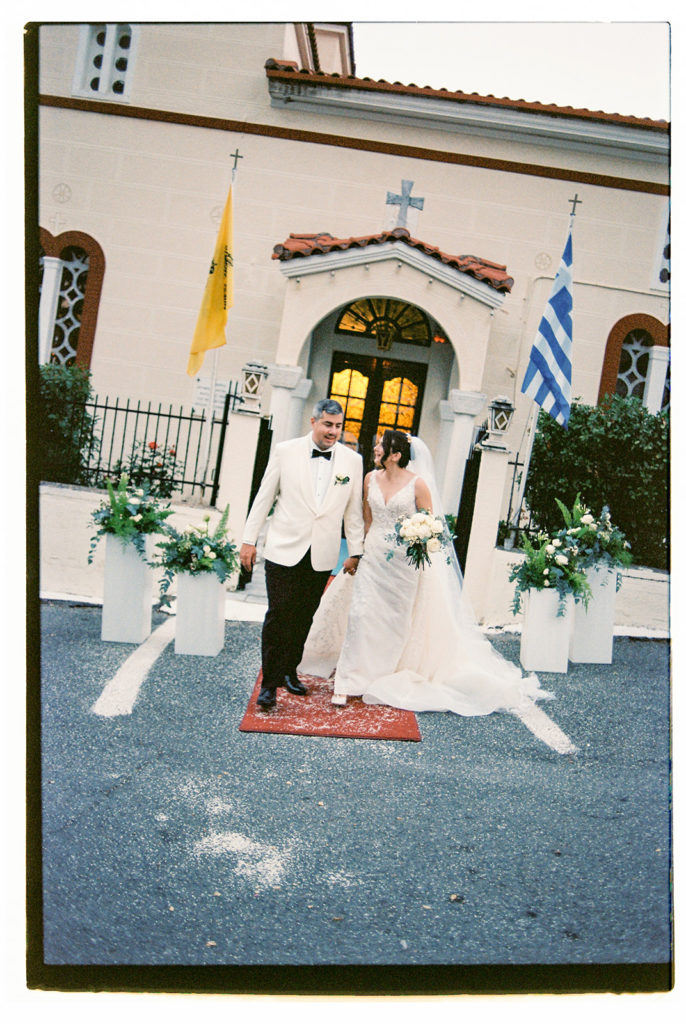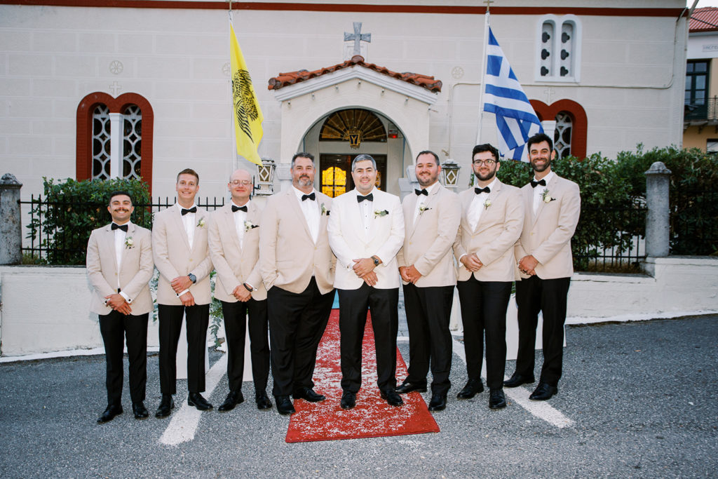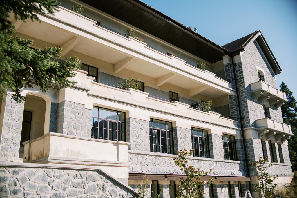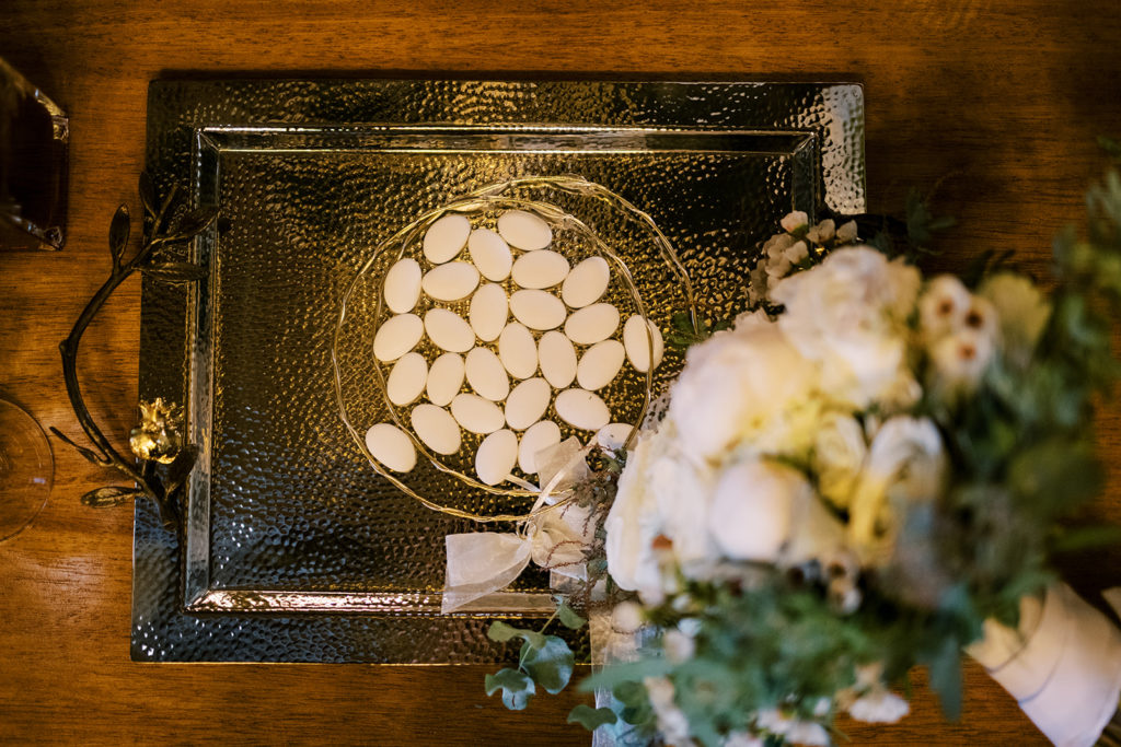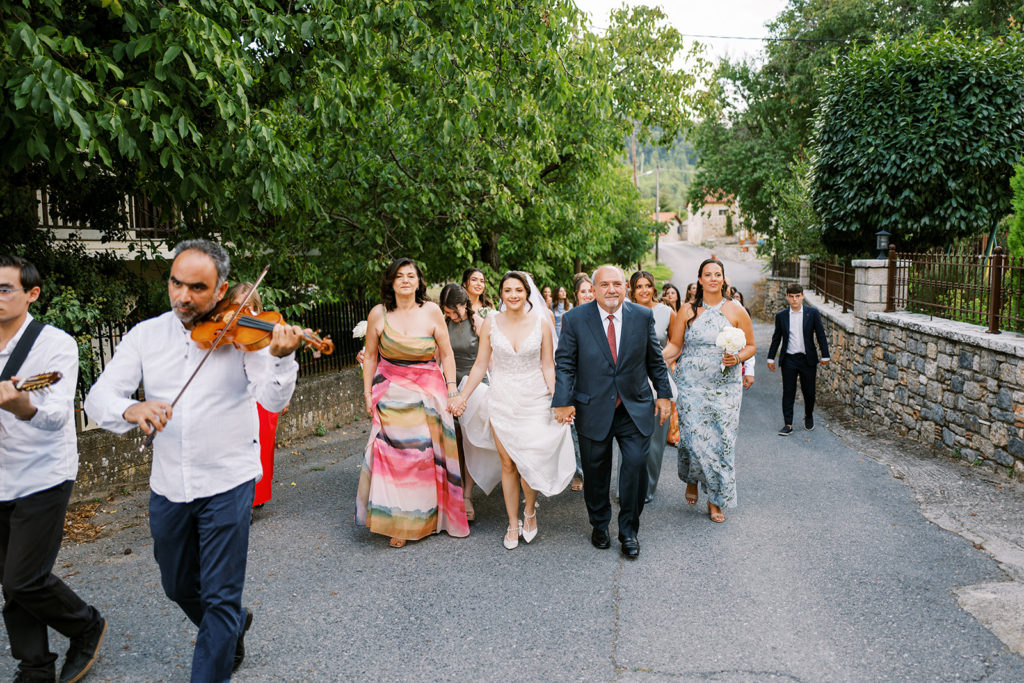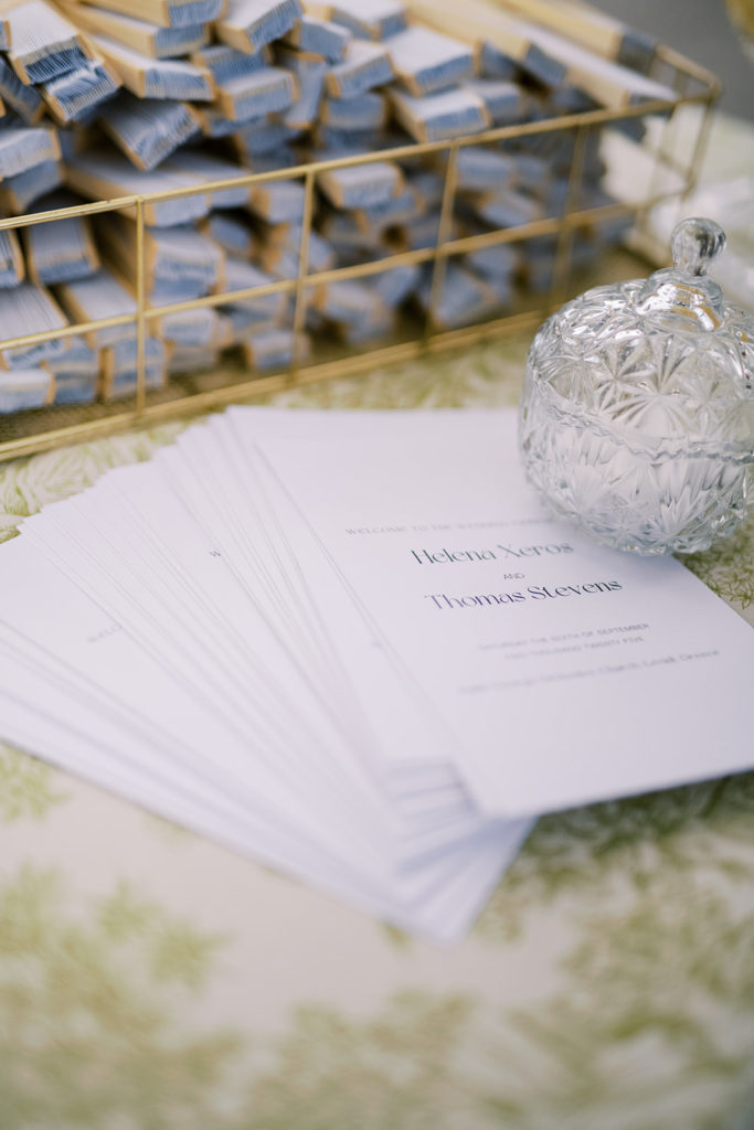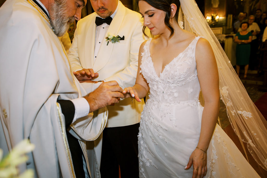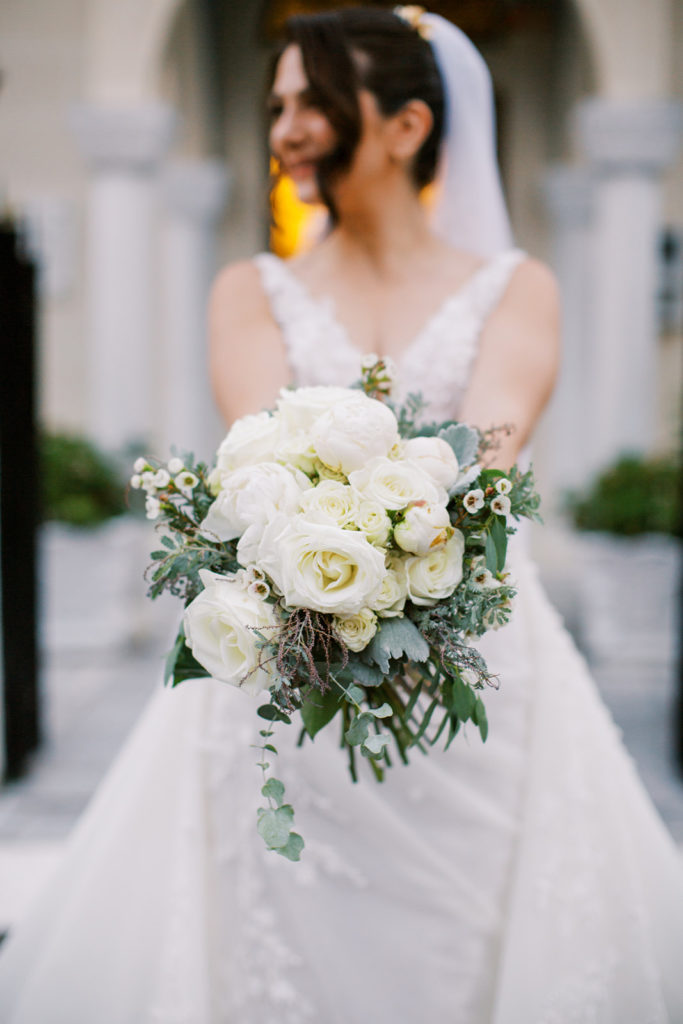 The floral palette embraced soothing greens and soft whites, bringing the beauty of nature into every detail. Elegant arrangements of roses, delphinium, hydrangeas, and wild greenery adorned the ceremony and reception spaces, echoing the surrounding forest. Inside the stone-clad chapel, lush florals framed the traditional Greek wedding ritual with a delicate yet refined aesthetic, perfectly matching the bride’s timeless style.