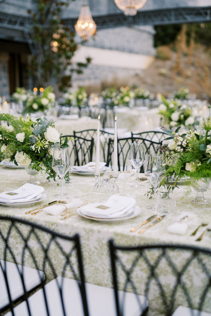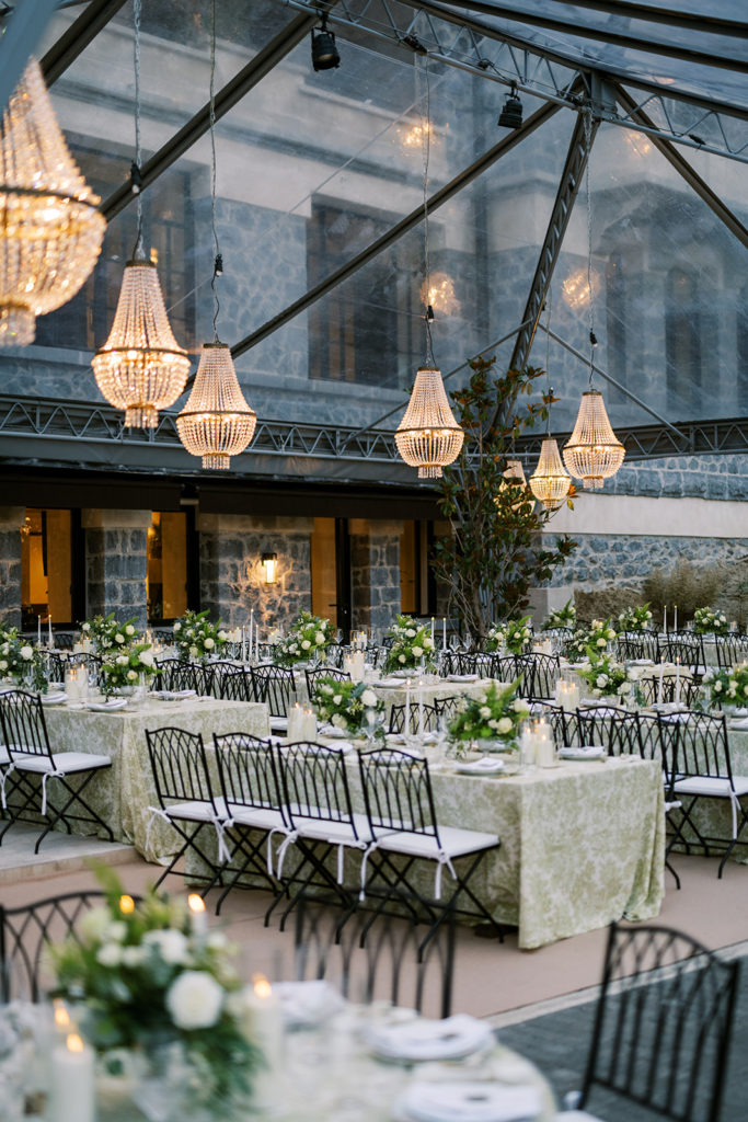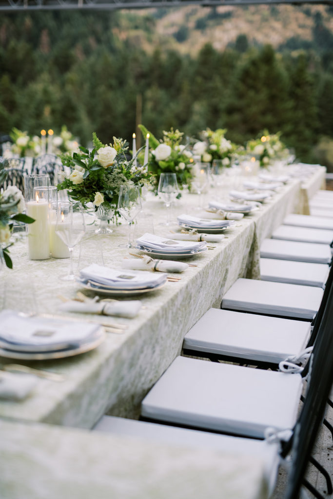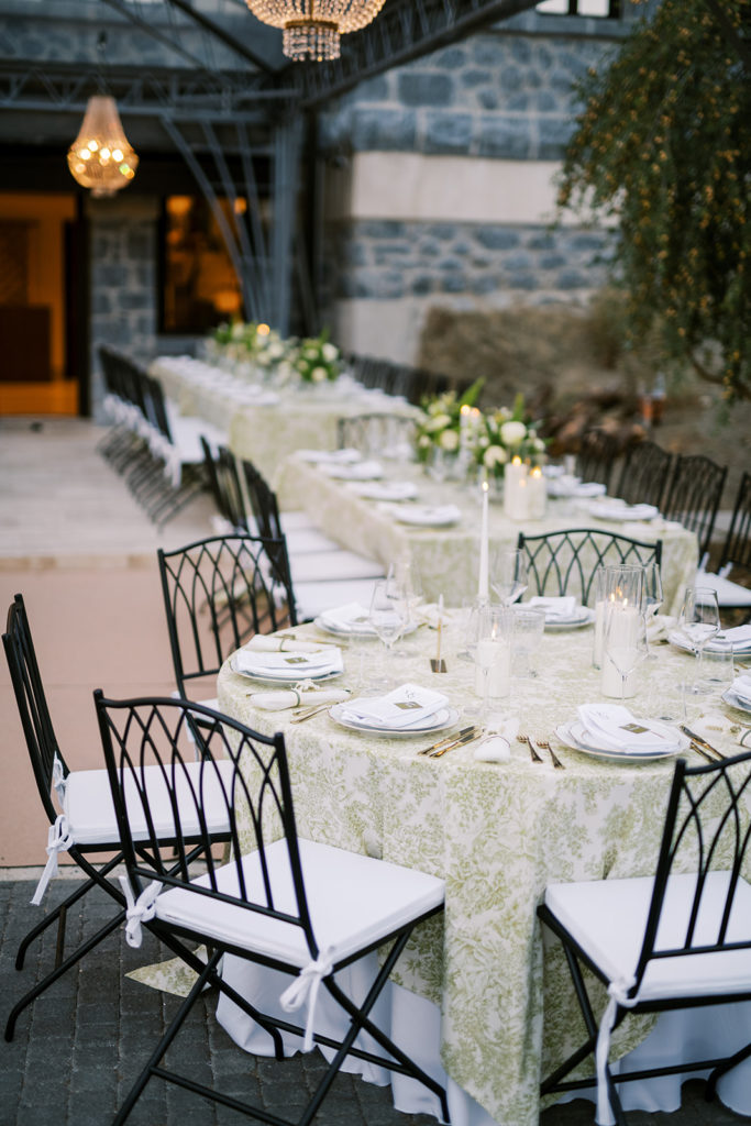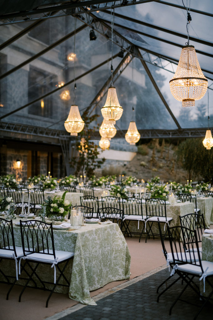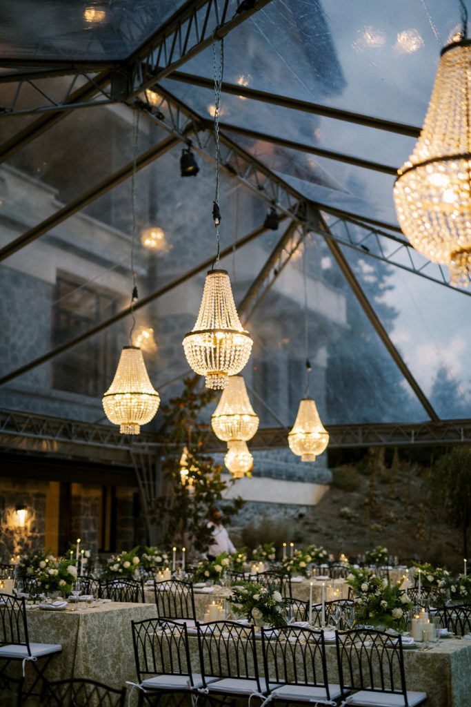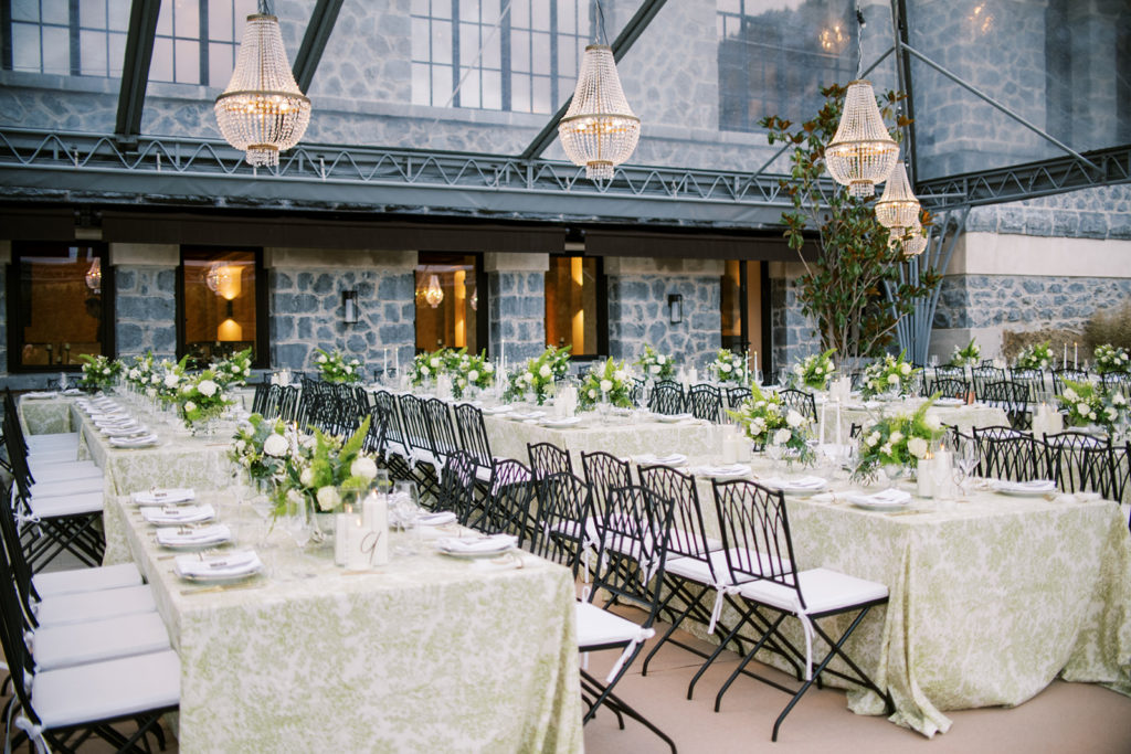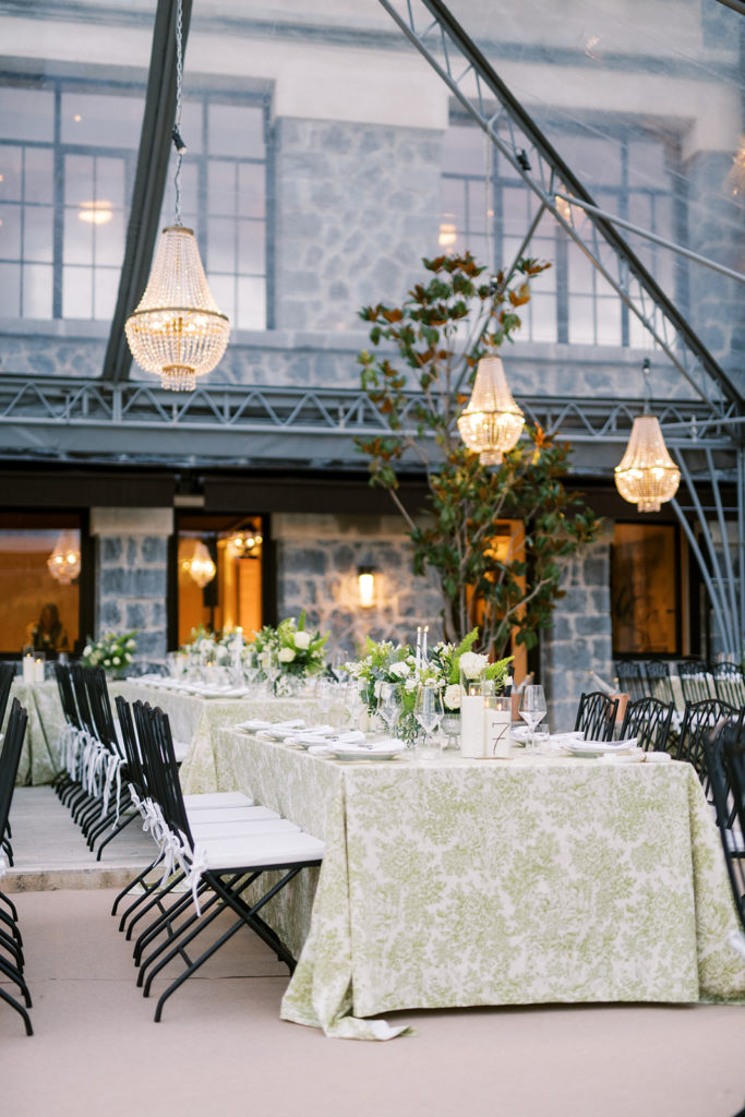 For the reception, guests gathered under sparkling chandeliers inside a transparent tent that revealed the mountain views at dusk. Tables dressed in patterned sage-green linens and gold accents offered a sophisticated, romantic chic atmosphere. Candlelit centerpieces, curated place settings, and lush florals transformed the mountain hotel into a luxurious destination wedding retreat—an unforgettable blend of nature, elegance, and heartfelt celebration.