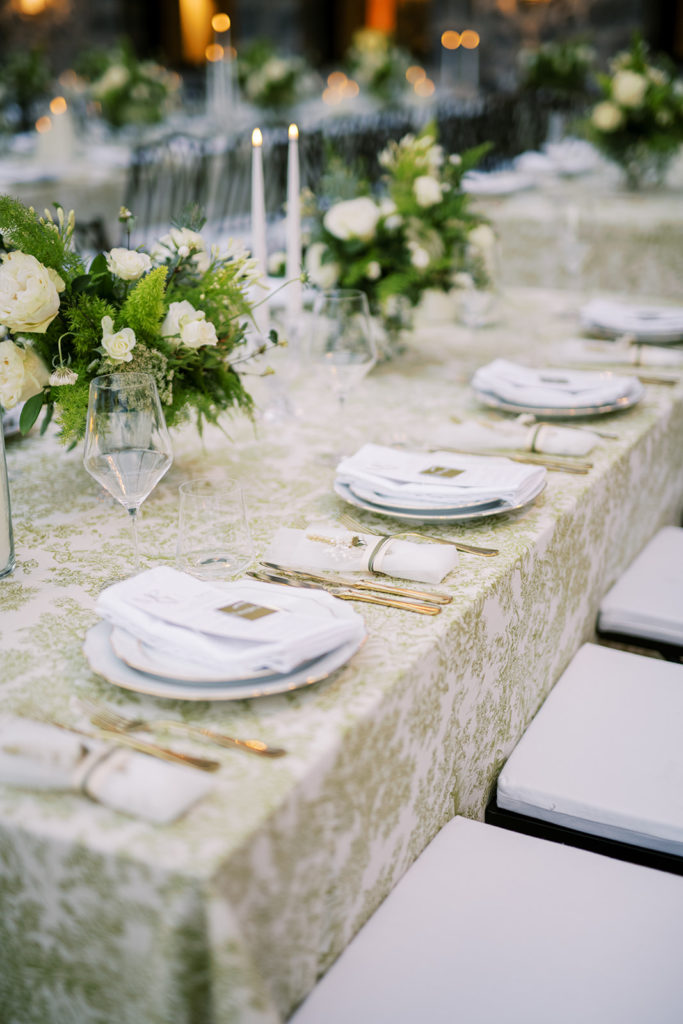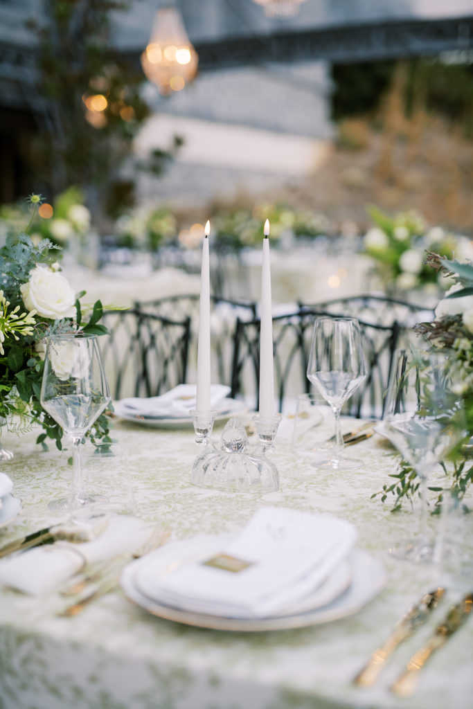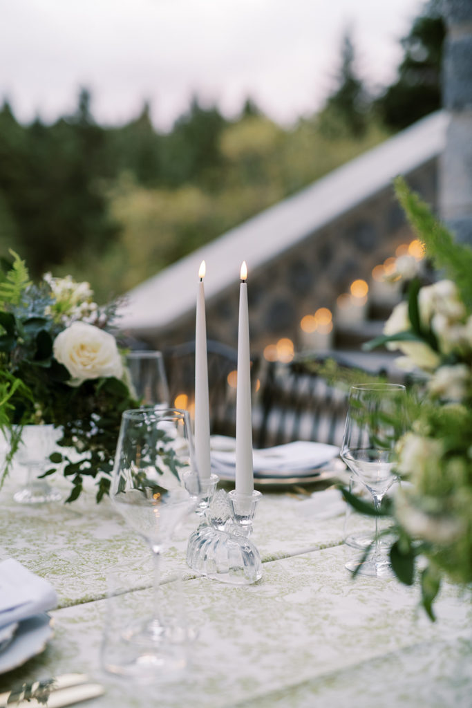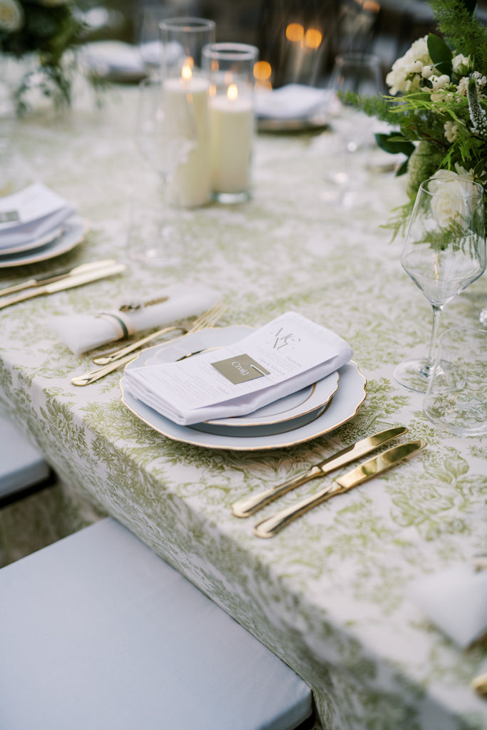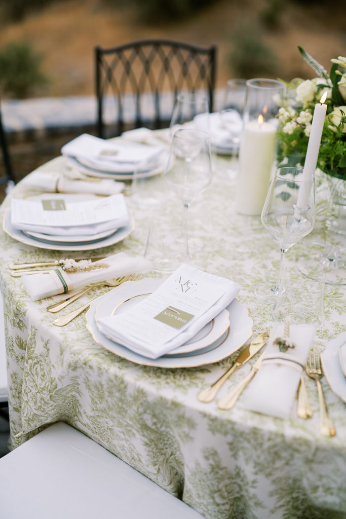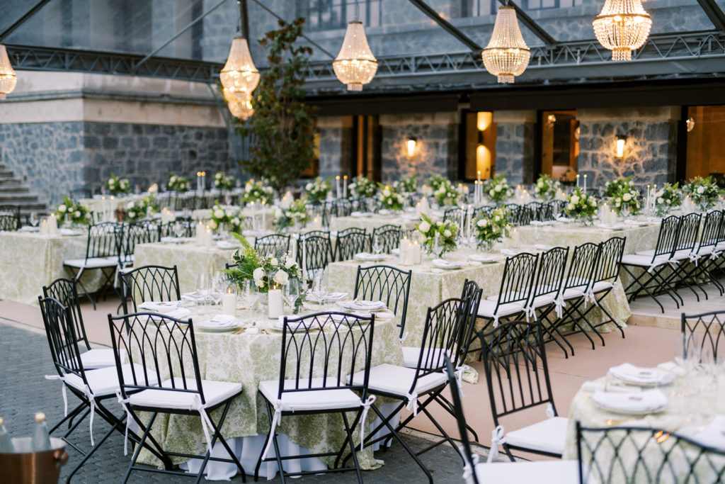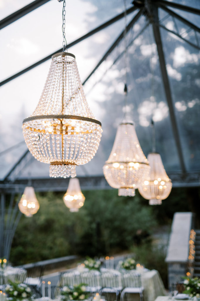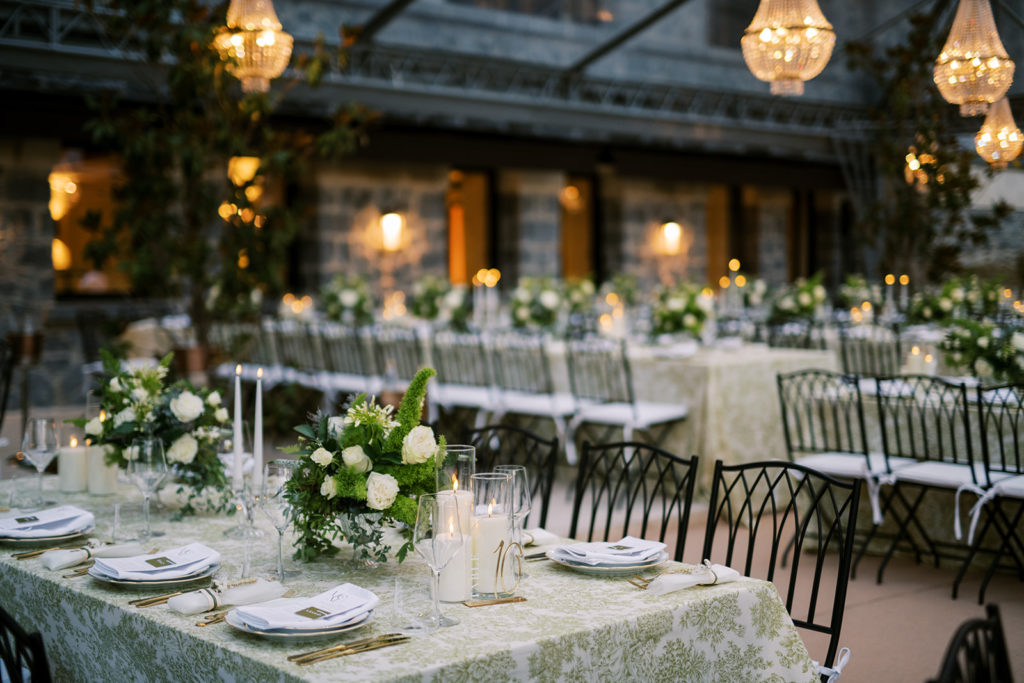 For the reception, guests gathered under sparkling chandeliers inside a transparent tent that revealed the mountain views at dusk. Tables dressed in patterned sage-green linens and gold accents offered a sophisticated, romantic chic atmosphere. Candlelit centerpieces, curated place settings, and lush florals transformed the mountain hotel into a luxurious destination wedding retreat—an unforgettable blend of nature, elegance, and heartfelt celebration.
