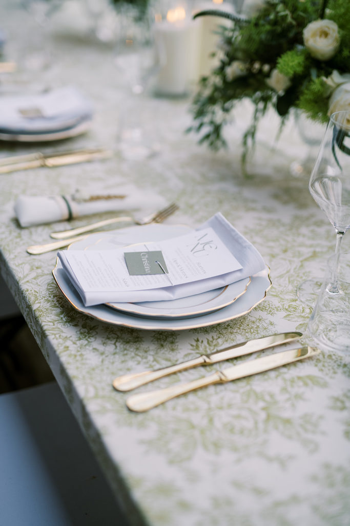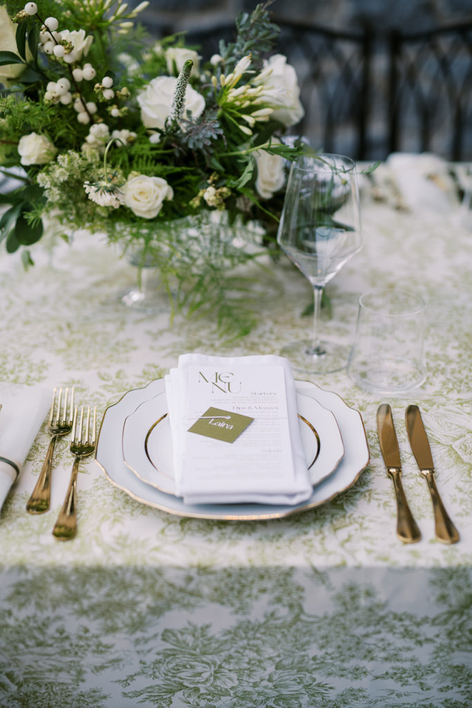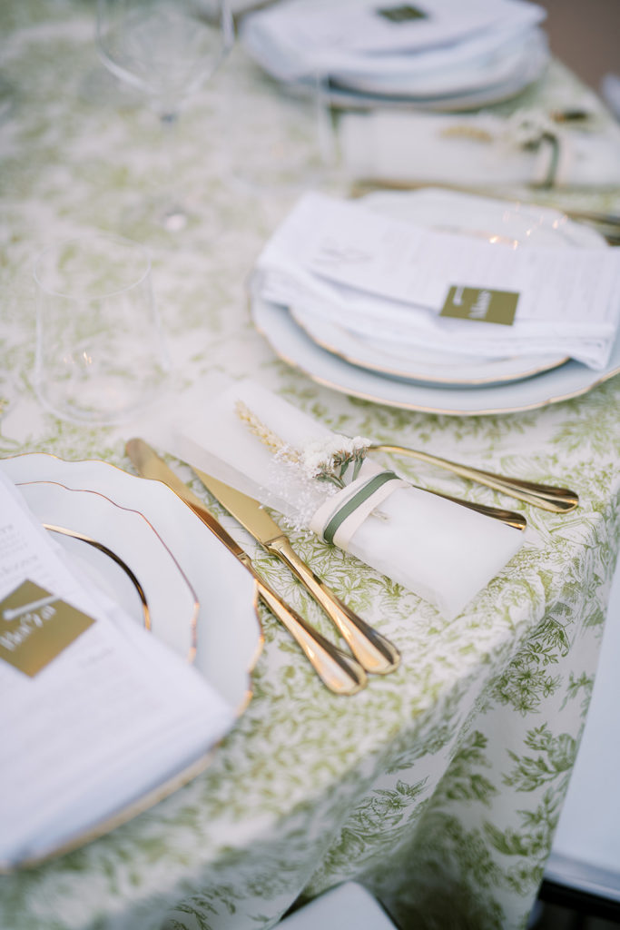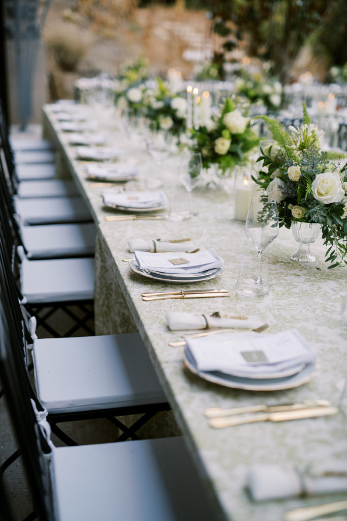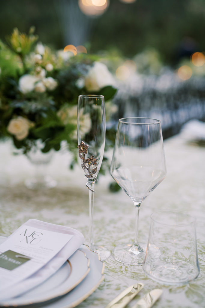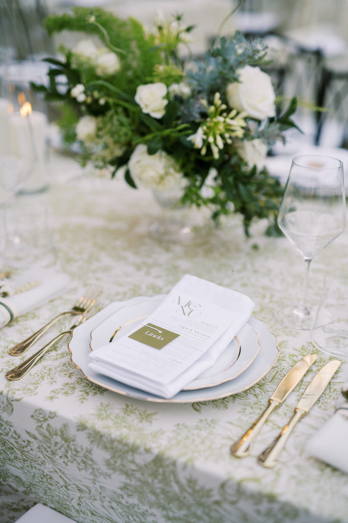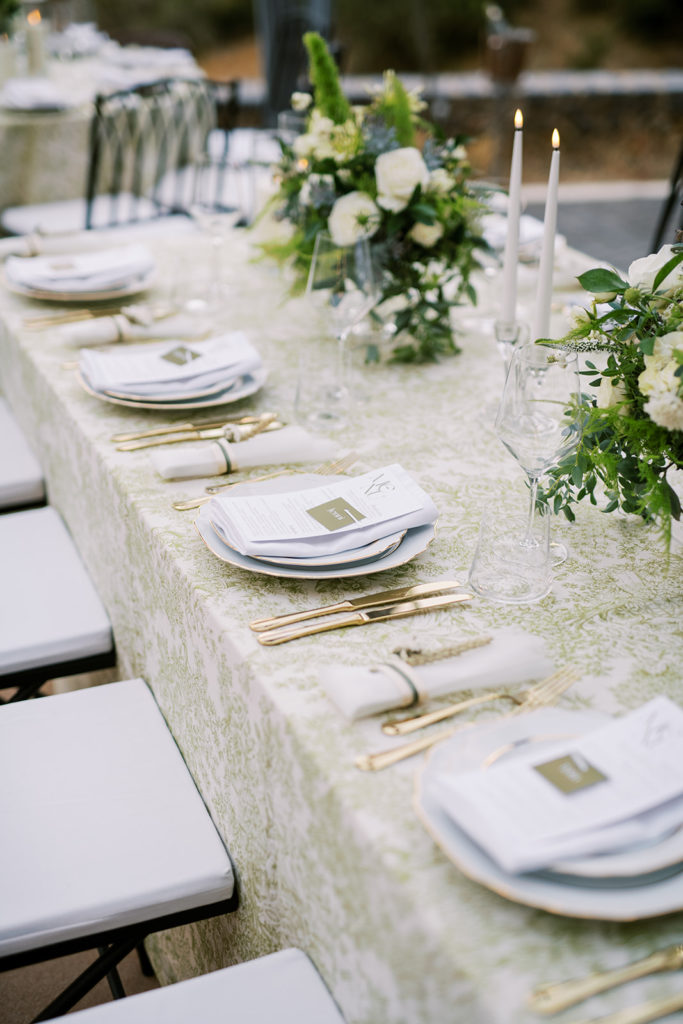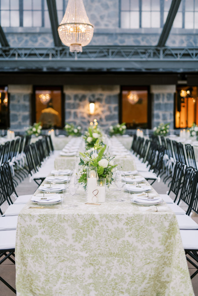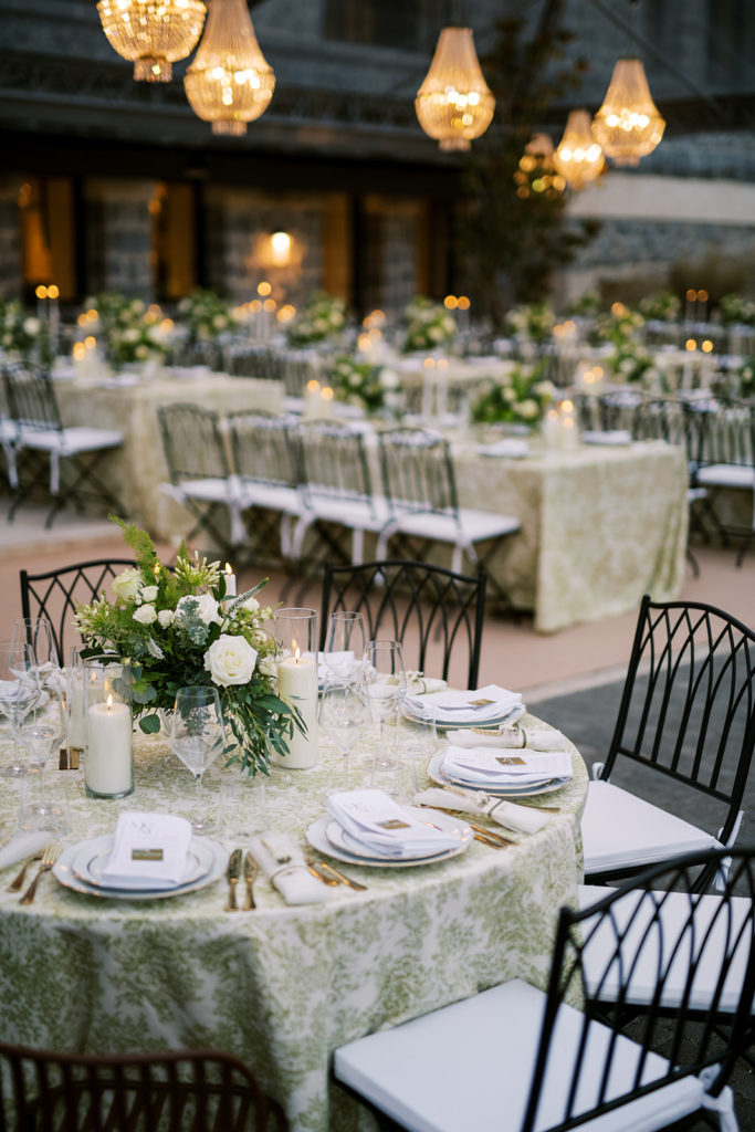 For the reception, guests gathered under sparkling chandeliers inside a transparent tent that revealed the mountain views at dusk. Tables dressed in patterned sage-green linens and gold accents offered a sophisticated, romantic chic atmosphere. Candlelit centerpieces, curated place settings, and lush florals transformed the mountain hotel into a luxurious destination wedding retreat—an unforgettable blend of nature, elegance, and heartfelt celebration.