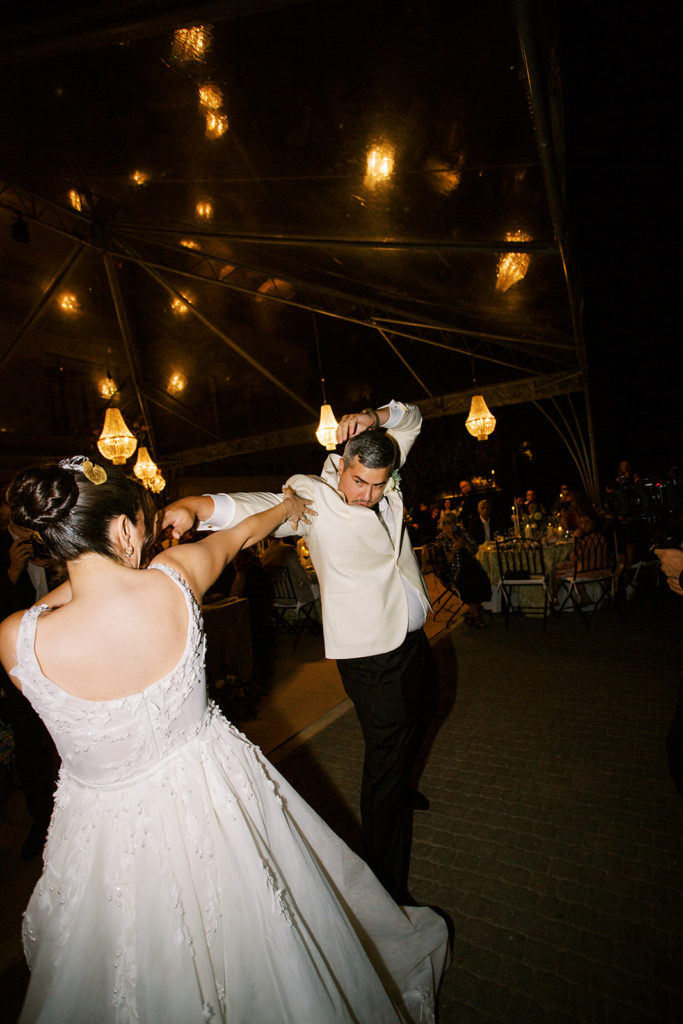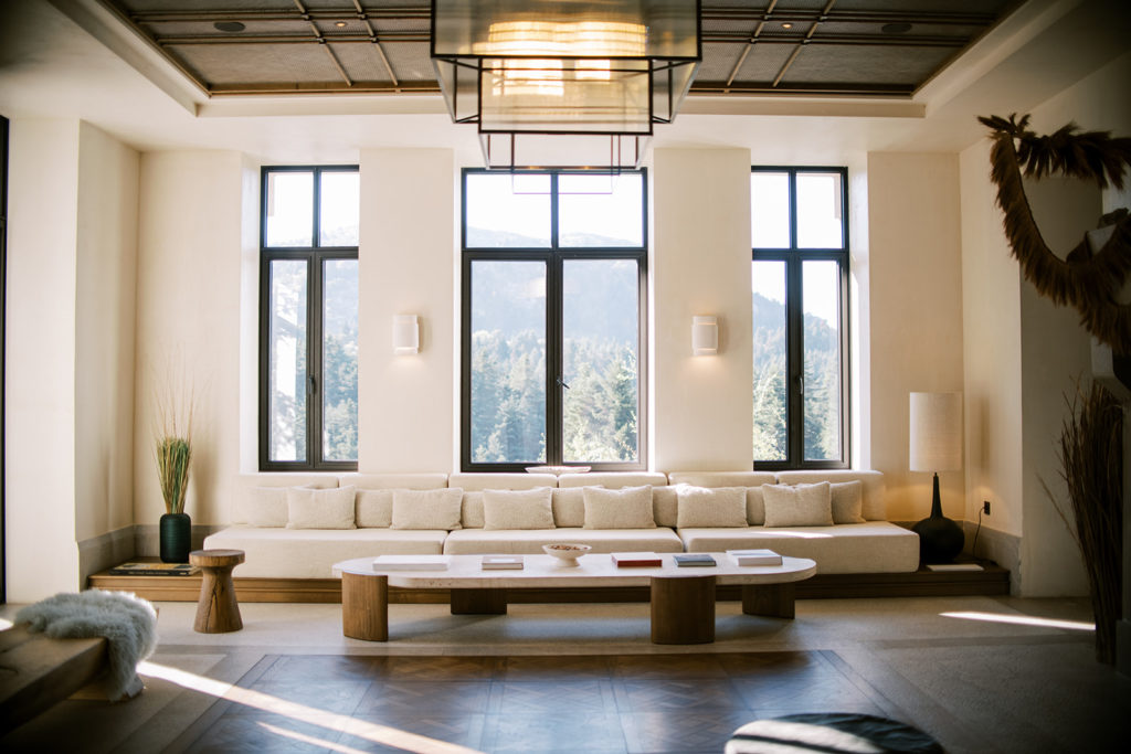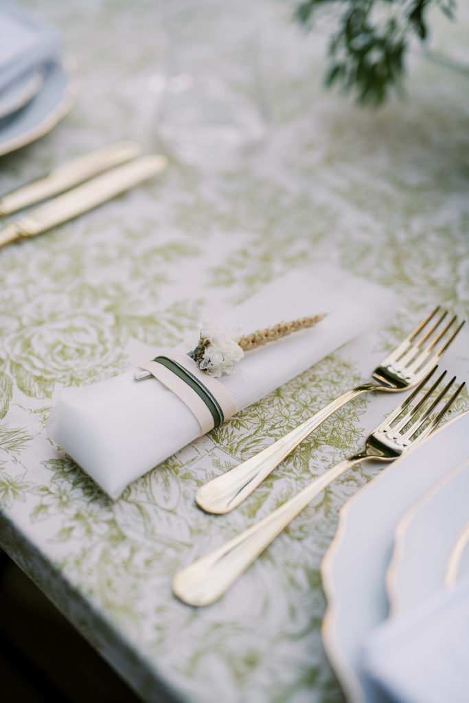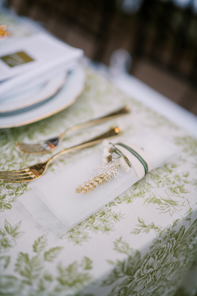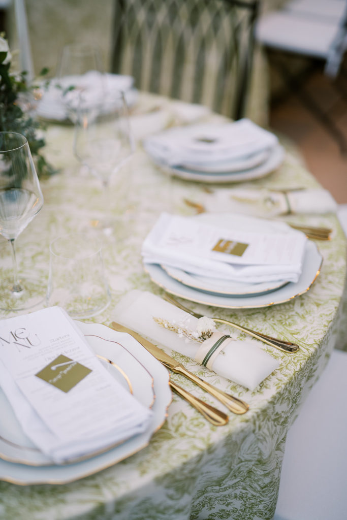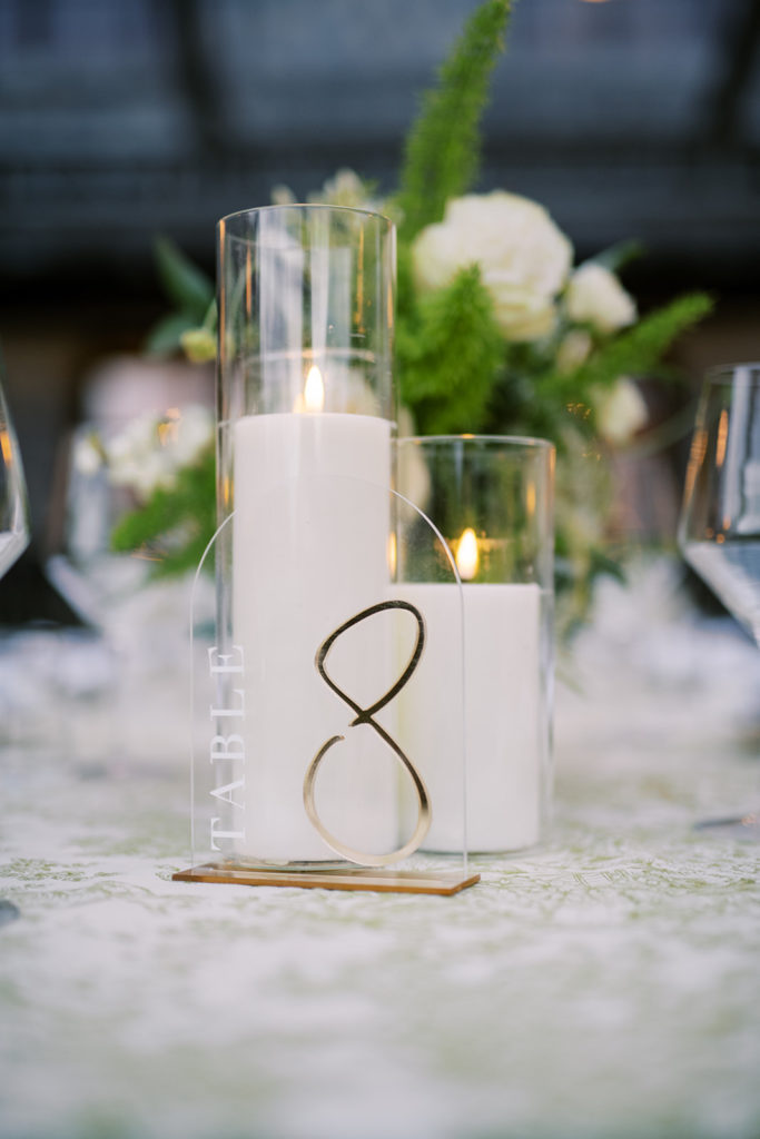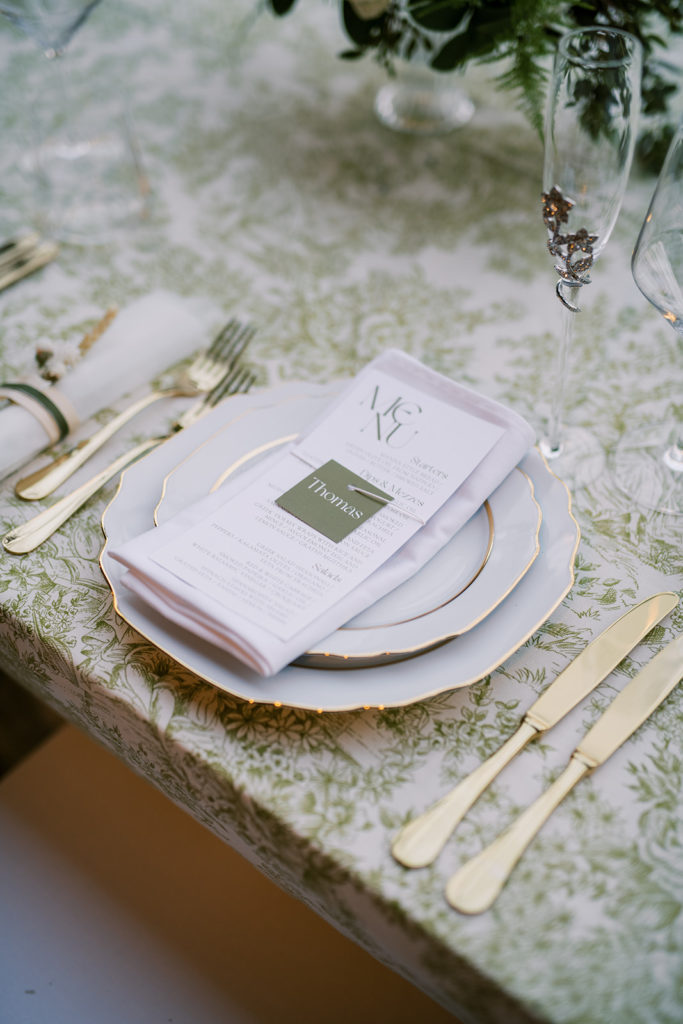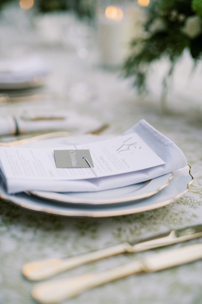 For the reception, guests gathered under sparkling chandeliers inside a transparent tent that revealed the mountain views at dusk. Tables dressed in patterned sage-green linens and gold accents offered a sophisticated, romantic chic atmosphere. Candlelit centerpieces, curated place settings, and lush florals transformed the mountain hotel into a luxurious destination wedding retreat—an unforgettable blend of nature, elegance, and heartfelt celebration.