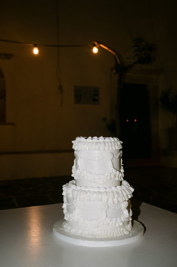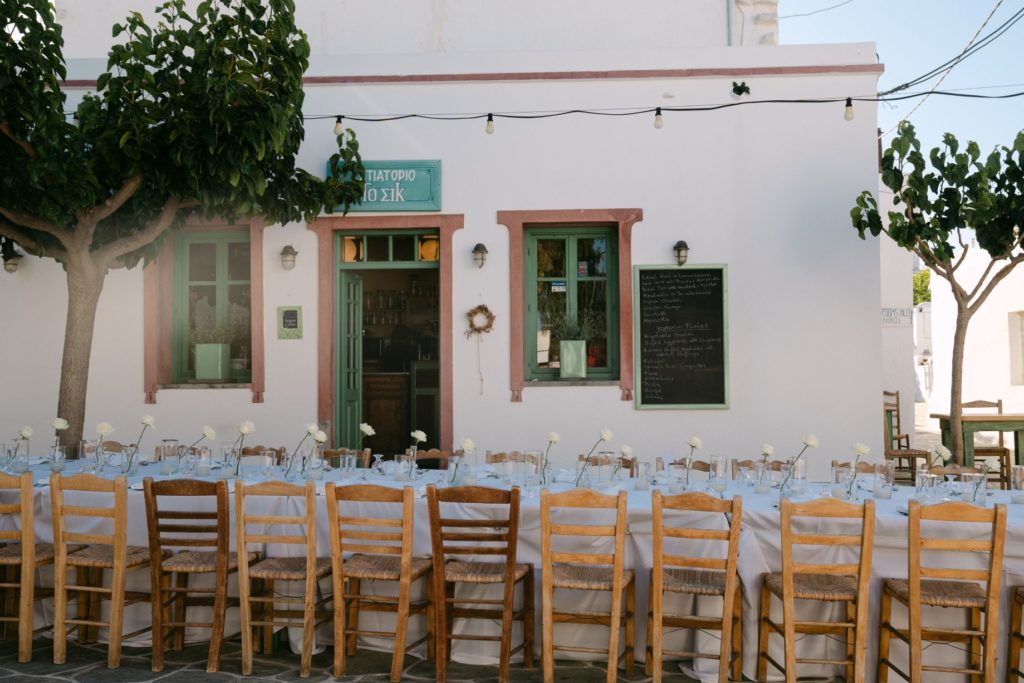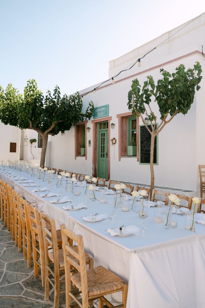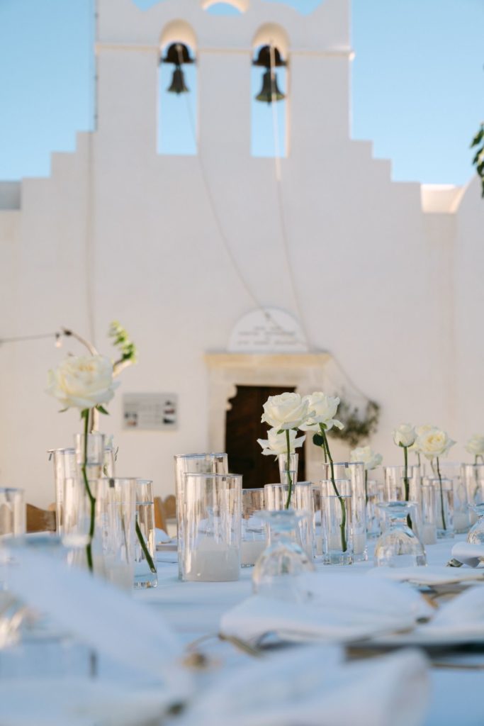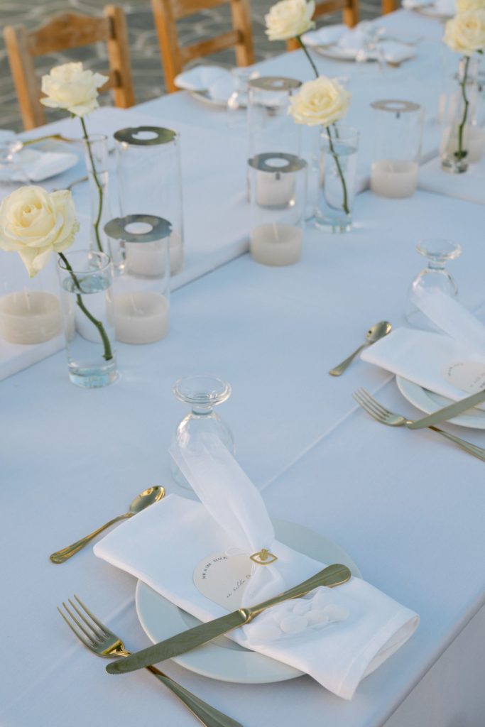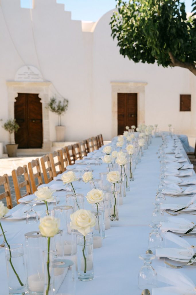 The décor reflected a sophisticated palette of pure white tones, enhancing the natural charm of the island. Single-stem white roses in delicate glass vases lined a long banquet table, creating a minimalist yet luxurious reception design. Wooden chairs, crisp white linens, soft candlelight, and a classic white wedding cake added understated refinement, offering beautiful inspiration for couples dreaming of a minimalist destination wedding in Greece or a romantic Cycladic celebration.