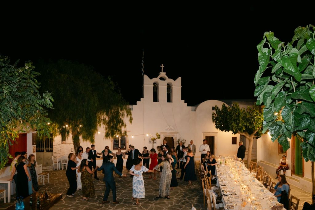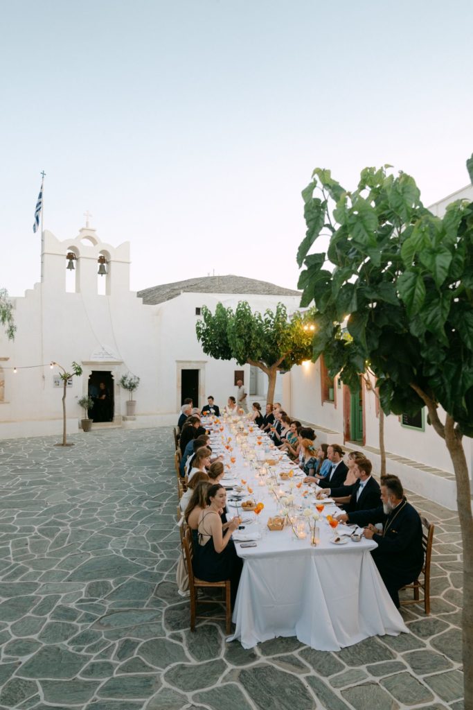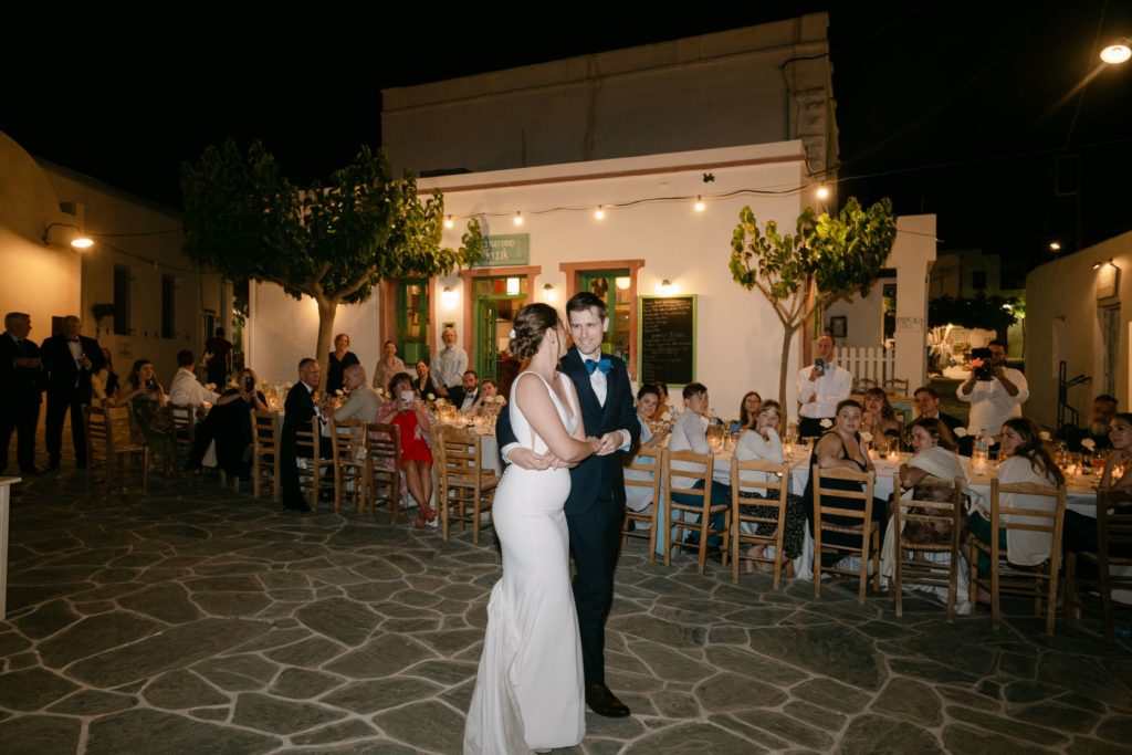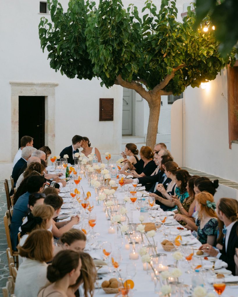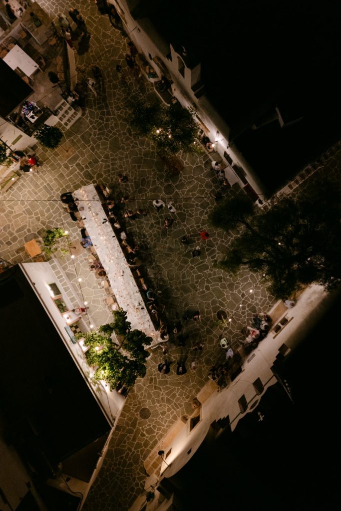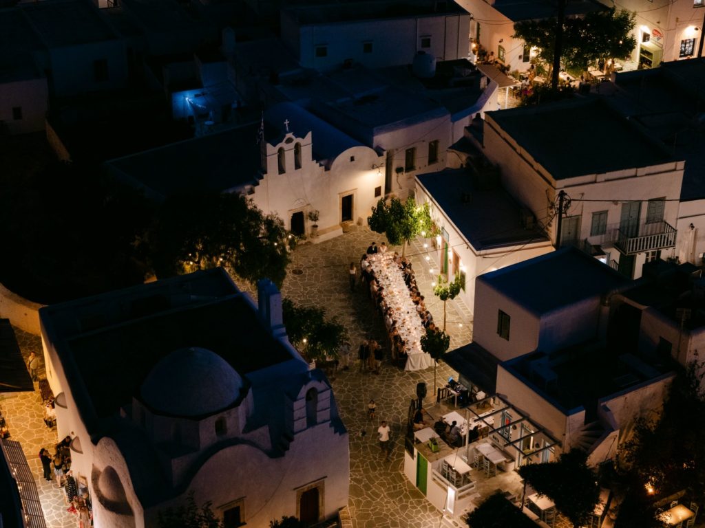 As night fell, the village courtyard transformed into a glowing oasis beneath the stars. The candlelit reception table stretched across the stone square, surrounded by traditional Cycladic houses and the gentle hum of celebration. This Folegandros wedding perfectly captures the essence of an intimate Greece destination wedding planned by an expert wedding planner, blending authenticity, elegance, and timeless Mediterranean romance.
