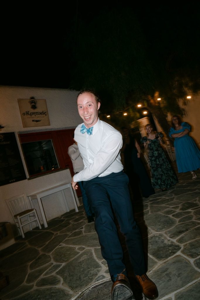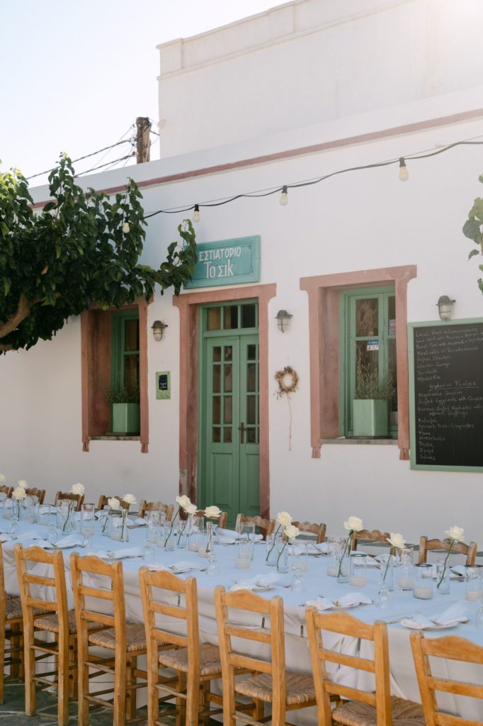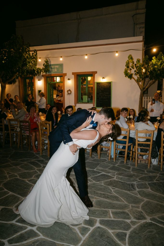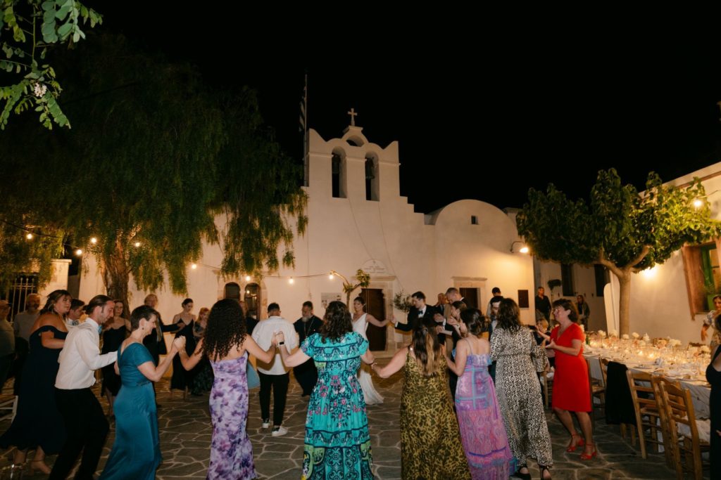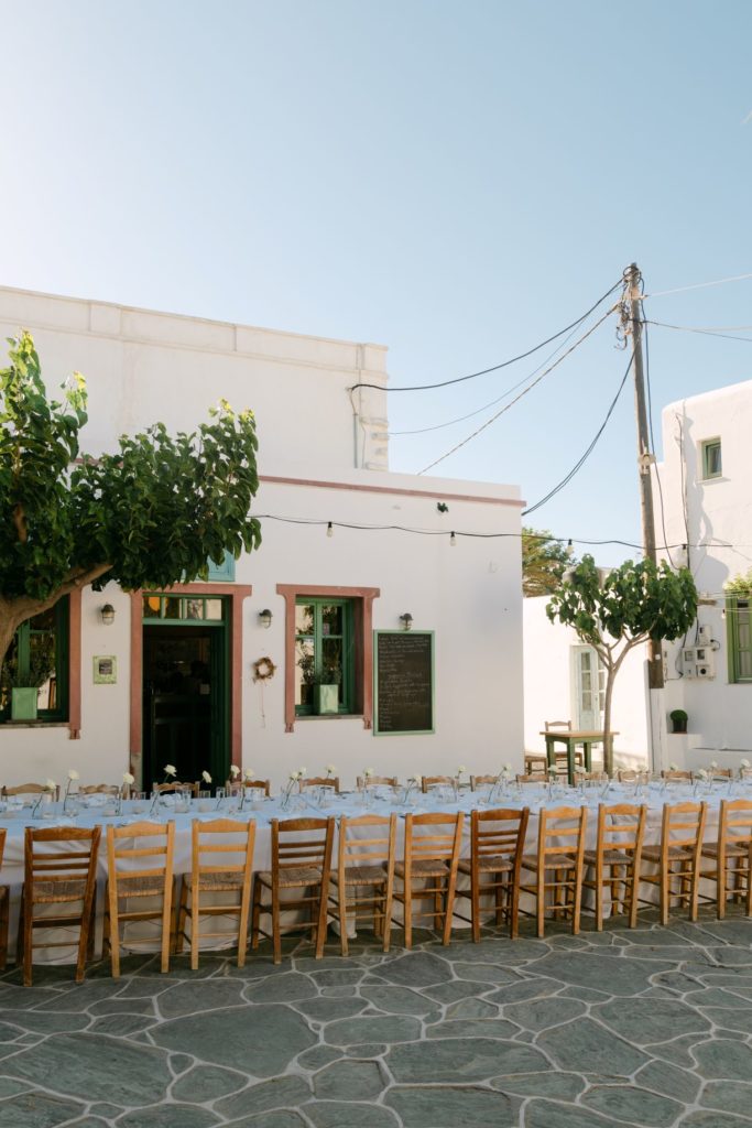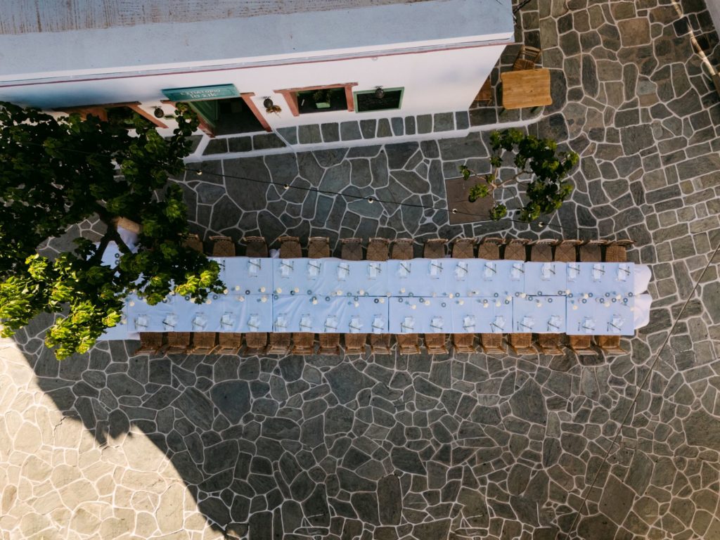 As night fell, the village courtyard transformed into a glowing oasis beneath the stars. The candlelit reception table stretched across the stone square, surrounded by traditional Cycladic houses and the gentle hum of celebration. This Folegandros wedding perfectly captures the essence of an intimate Greece destination wedding planned by an expert wedding planner, blending authenticity, elegance, and timeless Mediterranean romance.
