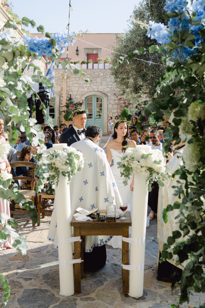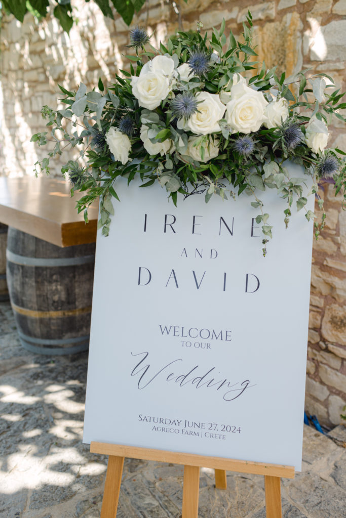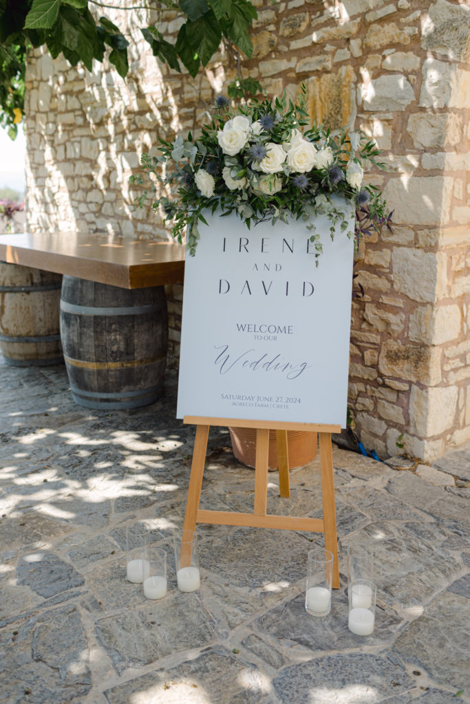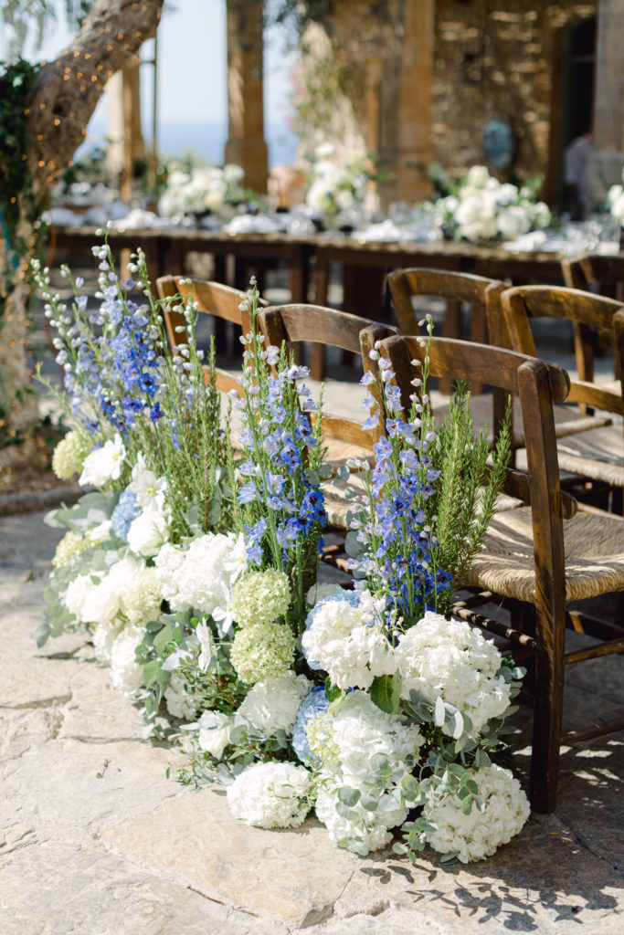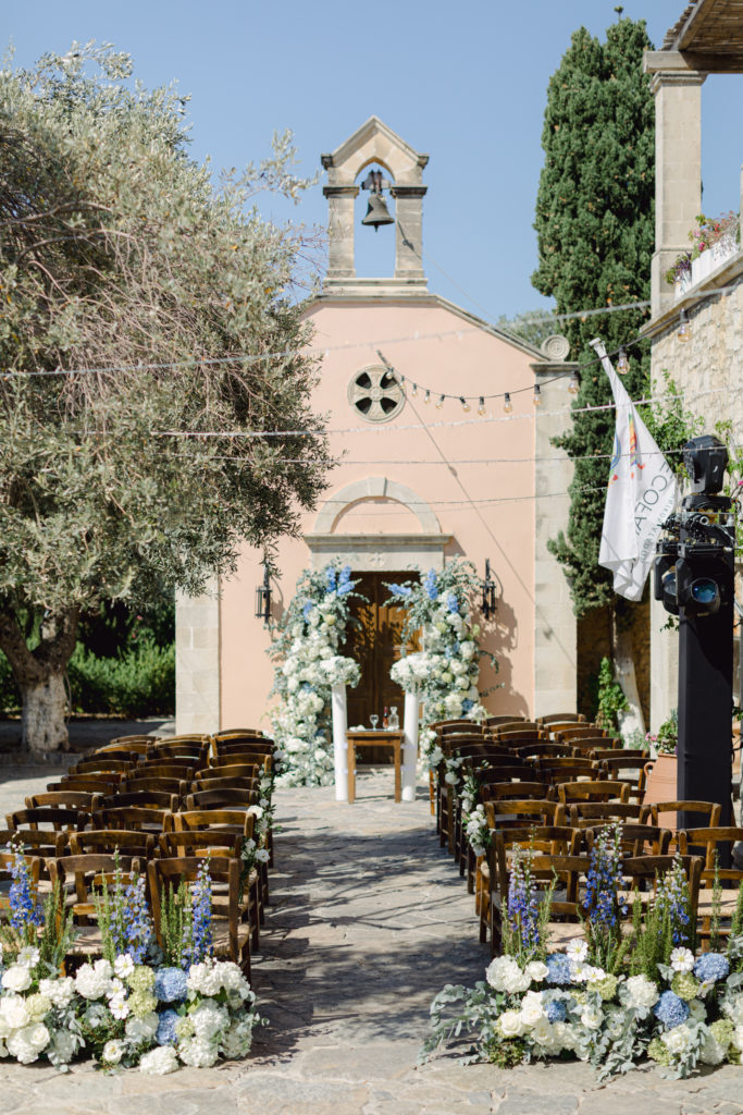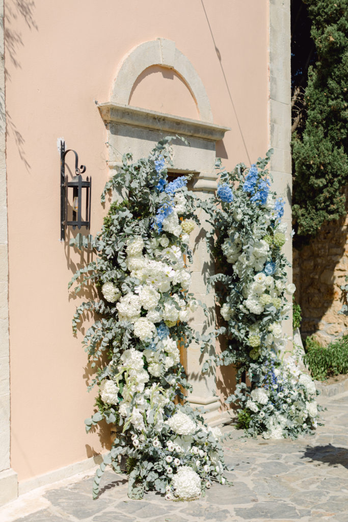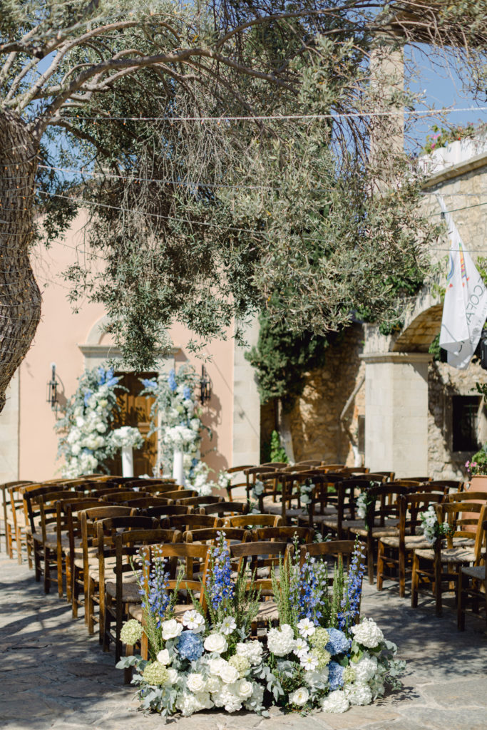 In the heart of Crete, where olive trees sway like storytellers and the horizon melts into soft Mediterranean blue, a love story blossomed into a fairytale celebration. The couple chose this historic estate for its timeless beauty, surrounded by groves that seemed to hold centuries of whispered blessings. White, blue, and green florals cascaded like living poetry, setting the scene for a ceremony woven with emotion, sunlight, and the gentle hum of nature.