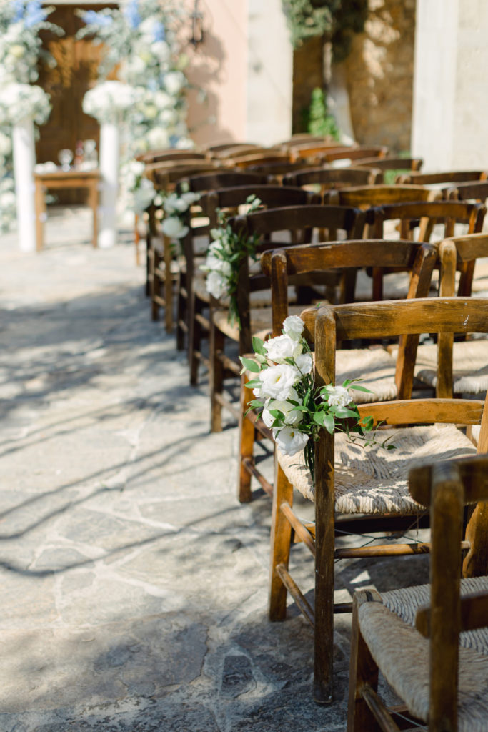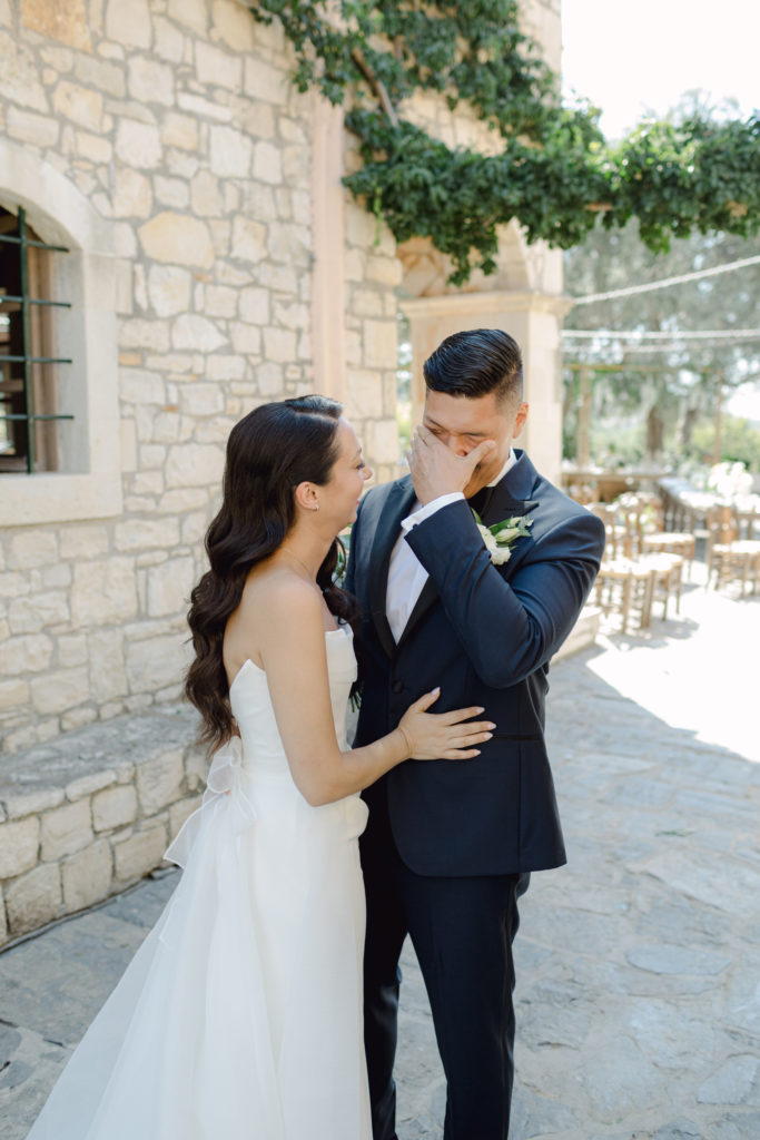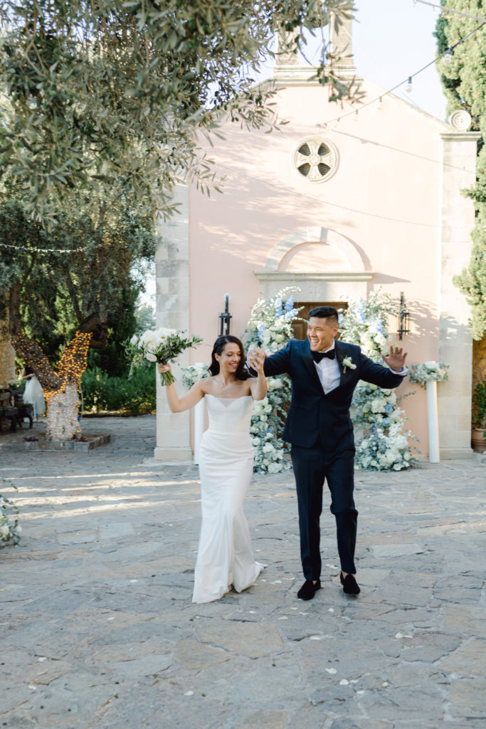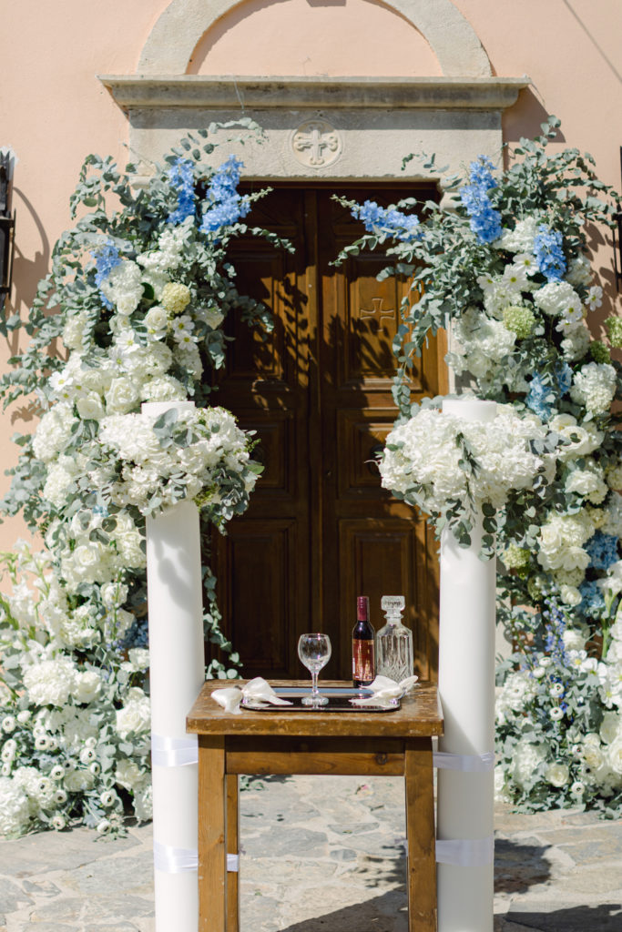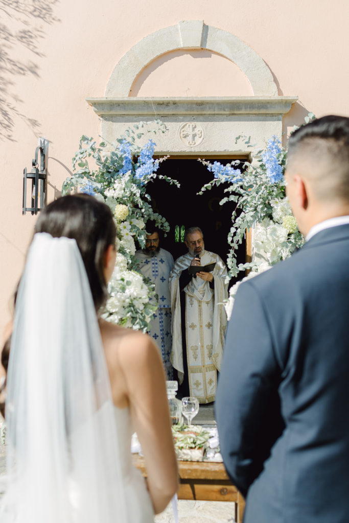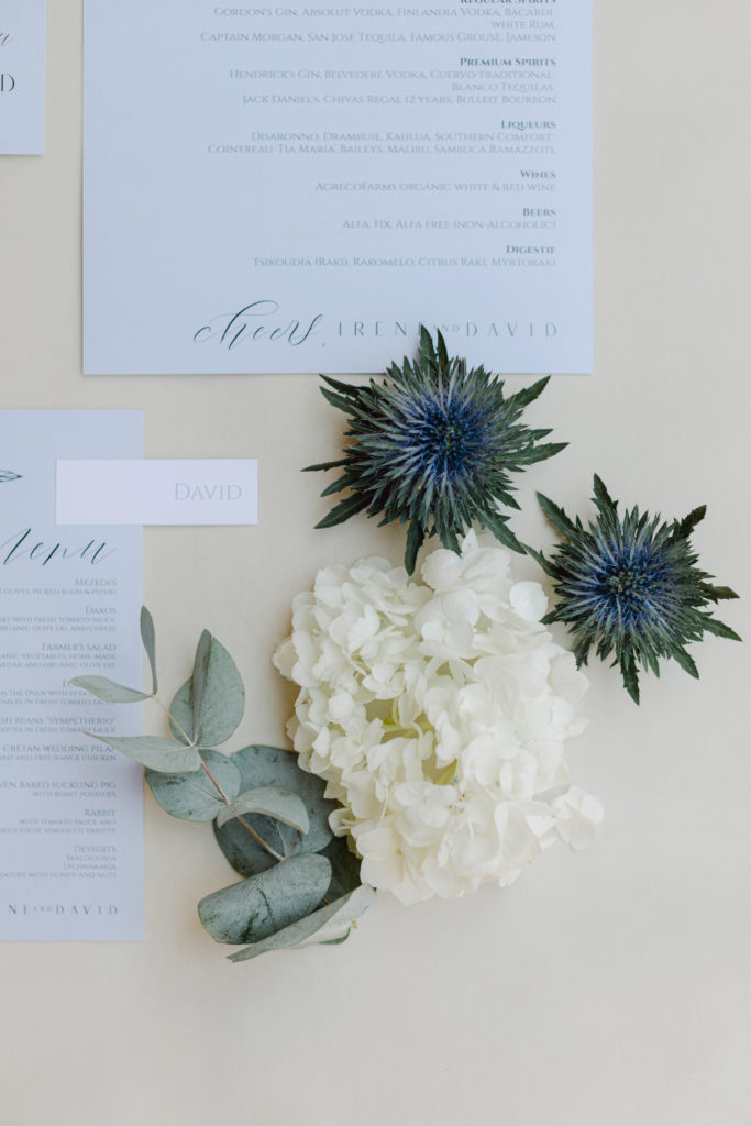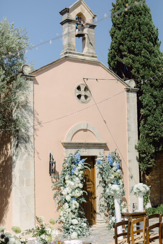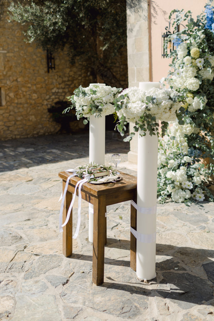 In the heart of Crete, where olive trees sway like storytellers and the horizon melts into soft Mediterranean blue, a love story blossomed into a fairytale celebration. The couple chose this historic estate for its timeless beauty, surrounded by groves that seemed to hold centuries of whispered blessings. White, blue, and green florals cascaded like living poetry, setting the scene for a ceremony woven with emotion, sunlight, and the gentle hum of nature.