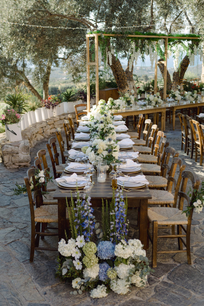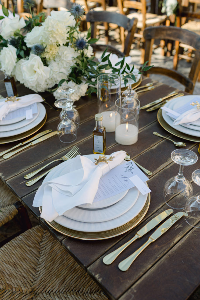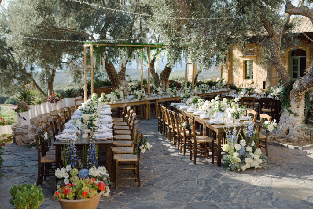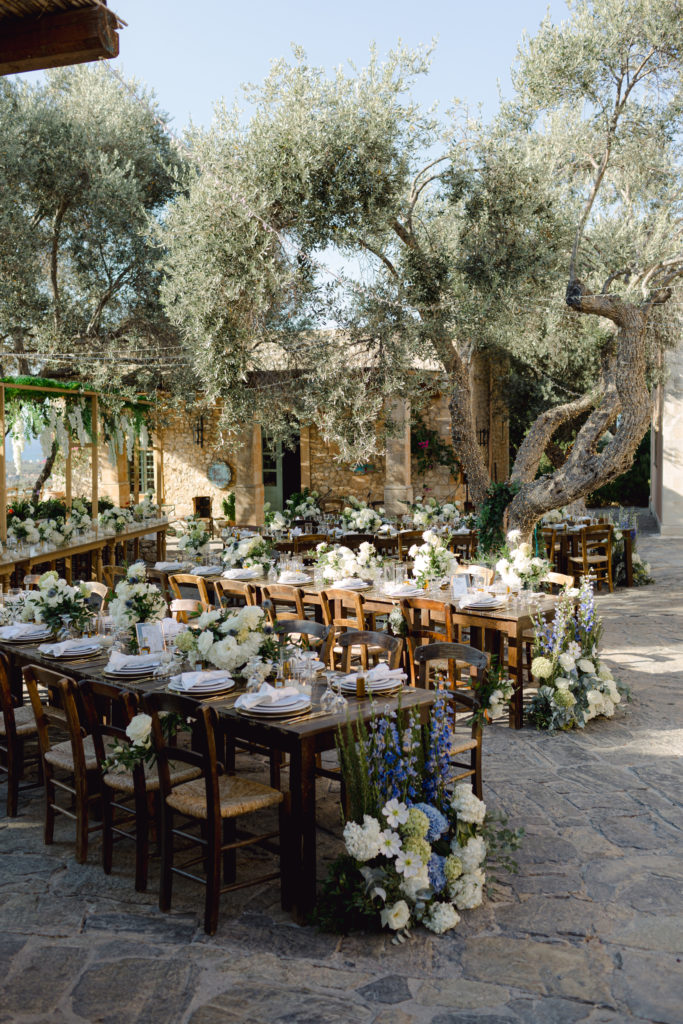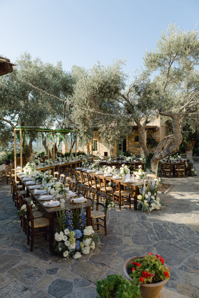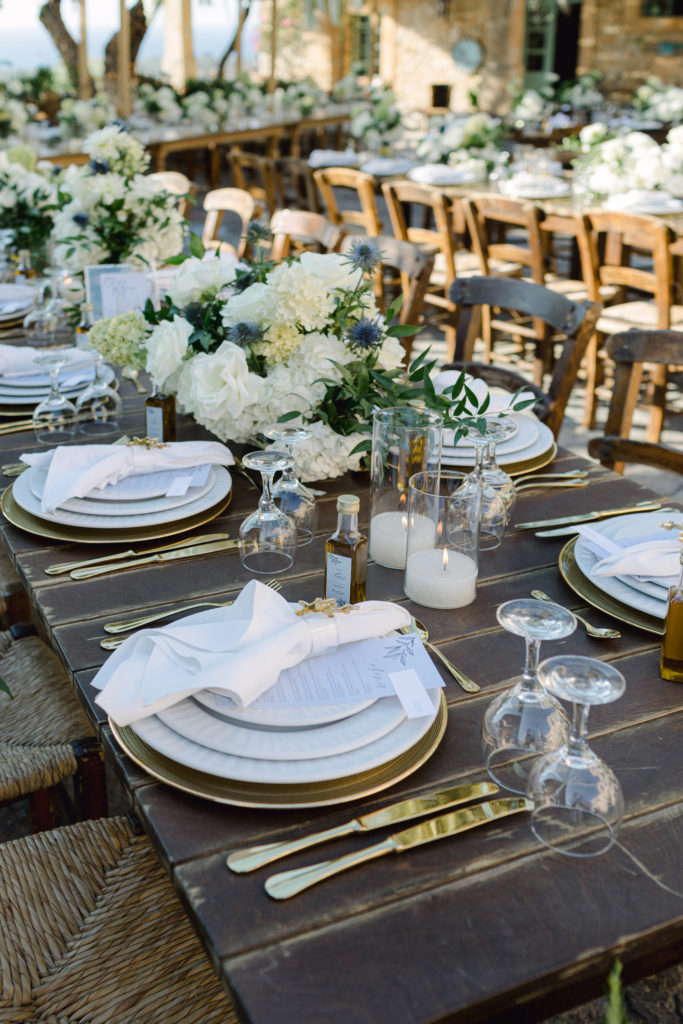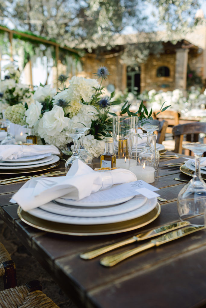 As the day unfolded, the estate transformed into a rustic dreamscape. Wooden tables stretched beneath the olive branches, dressed in lush floral runners, flickering candles, and elegant gold chargers that caught the warm evening light. Every detail—gold cutlery, handcrafted olive-oil favors, and airy blooms—reflected a celebration rooted in authenticity yet elevated with refined artistry. The soft palette of whites, greens, and delicate blues created a serene atmosphere, echoing the calm devotion between the couple.