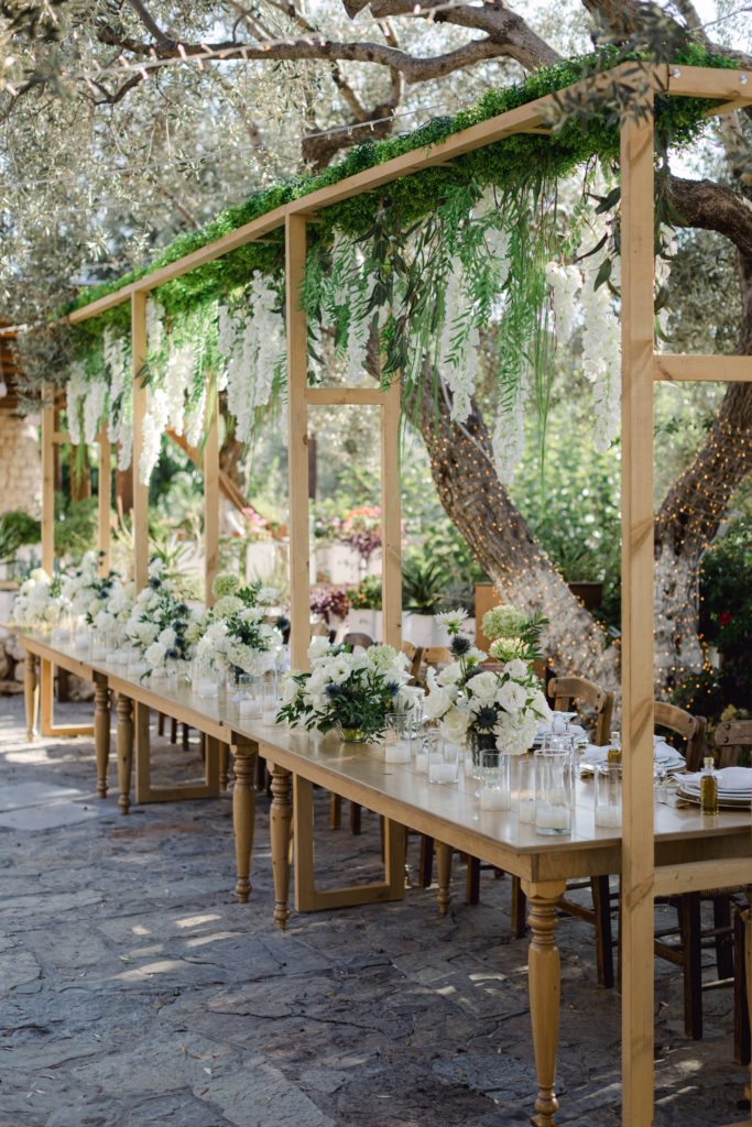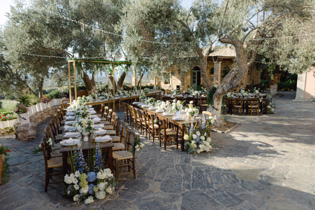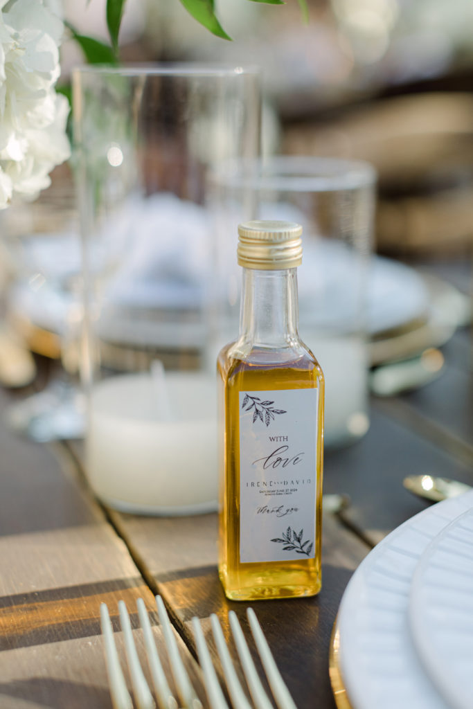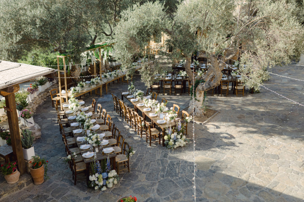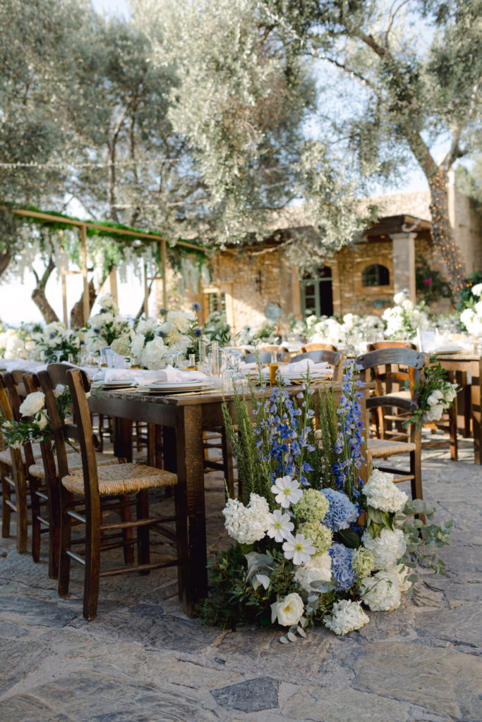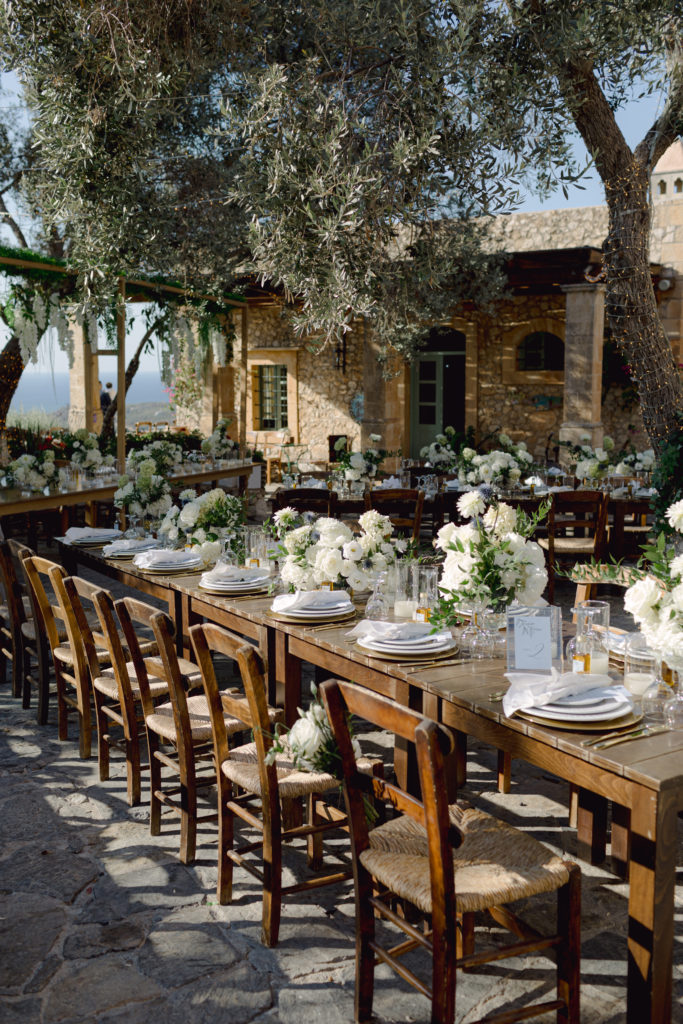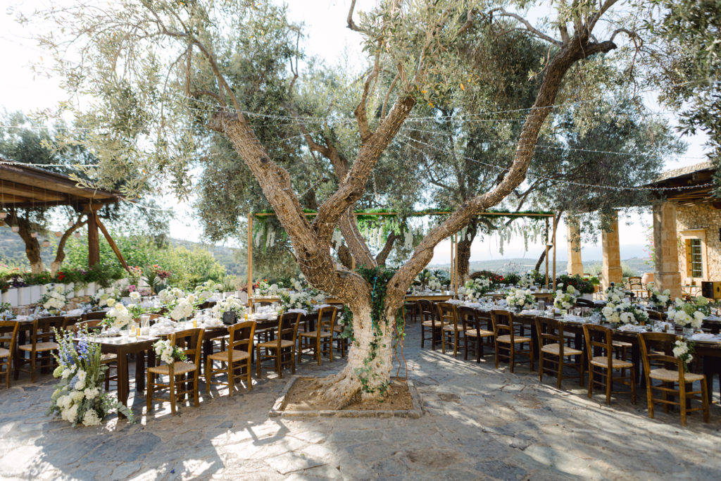 As the day unfolded, the estate transformed into a rustic dreamscape. Wooden tables stretched beneath the olive branches, dressed in lush floral runners, flickering candles, and elegant gold chargers that caught the warm evening light. Every detail—gold cutlery, handcrafted olive-oil favors, and airy blooms—reflected a celebration rooted in authenticity yet elevated with refined artistry. The soft palette of whites, greens, and delicate blues created a serene atmosphere, echoing the calm devotion between the couple.