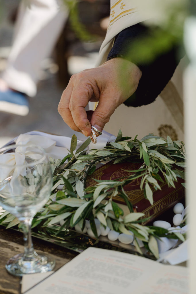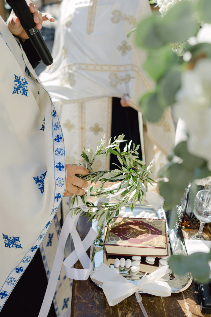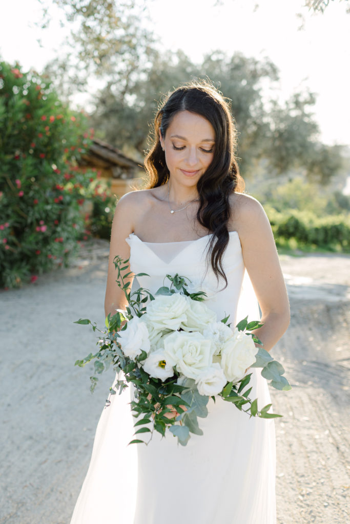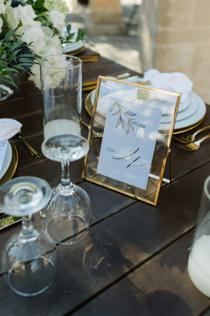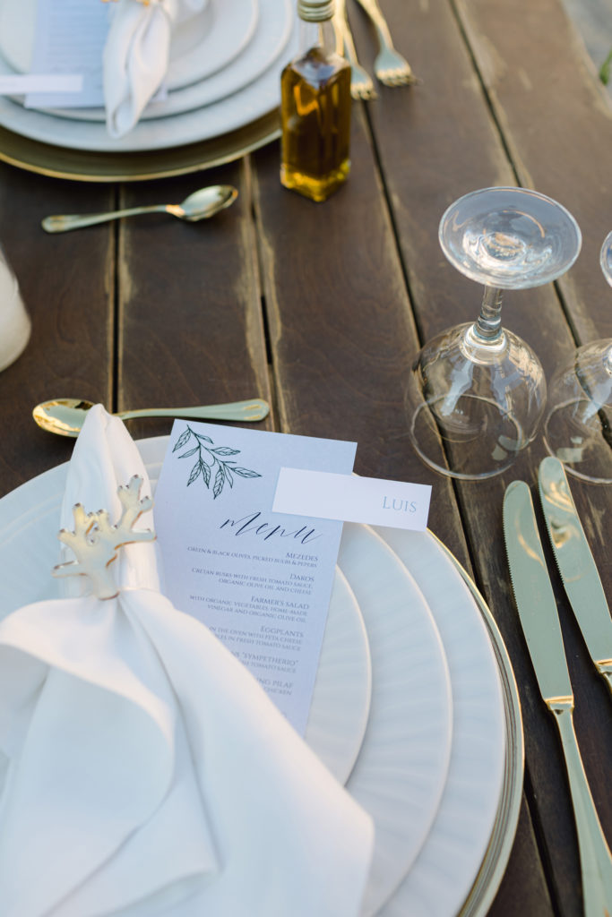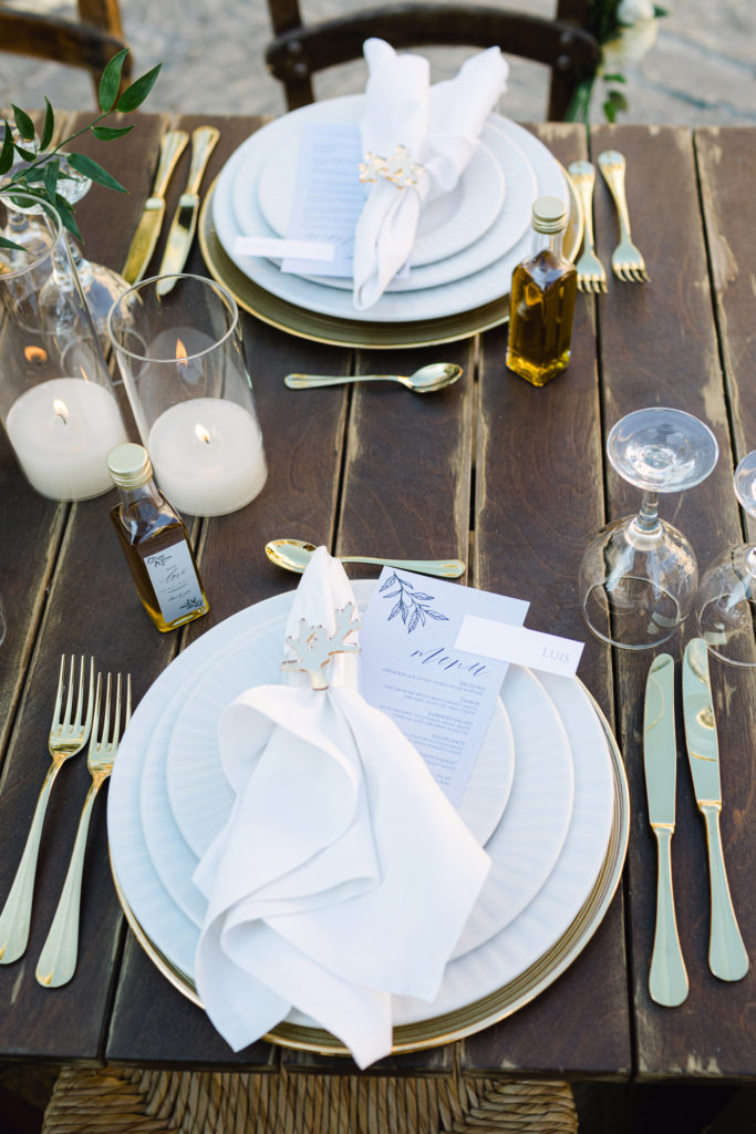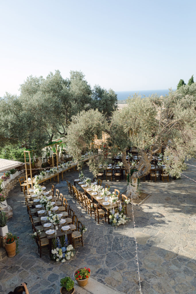 As the day unfolded, the estate transformed into a rustic dreamscape. Wooden tables stretched beneath the olive branches, dressed in lush floral runners, flickering candles, and elegant gold chargers that caught the warm evening light. Every detail—gold cutlery, handcrafted olive-oil favors, and airy blooms—reflected a celebration rooted in authenticity yet elevated with refined artistry. The soft palette of whites, greens, and delicate blues created a serene atmosphere, echoing the calm devotion between the couple.