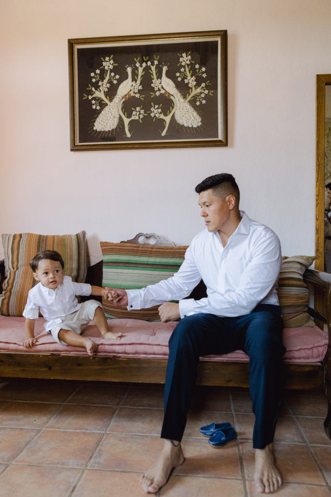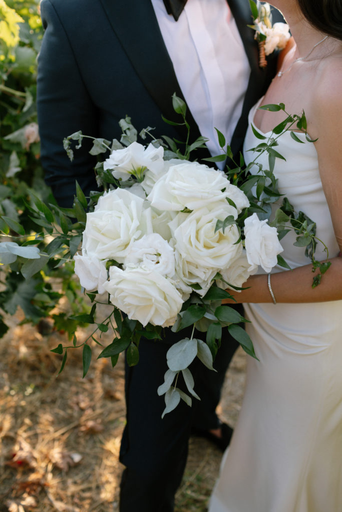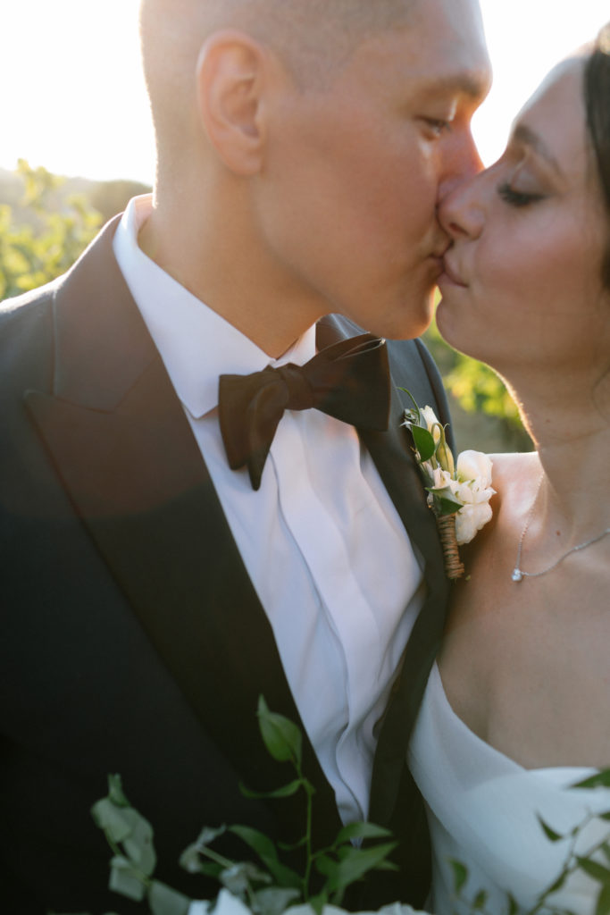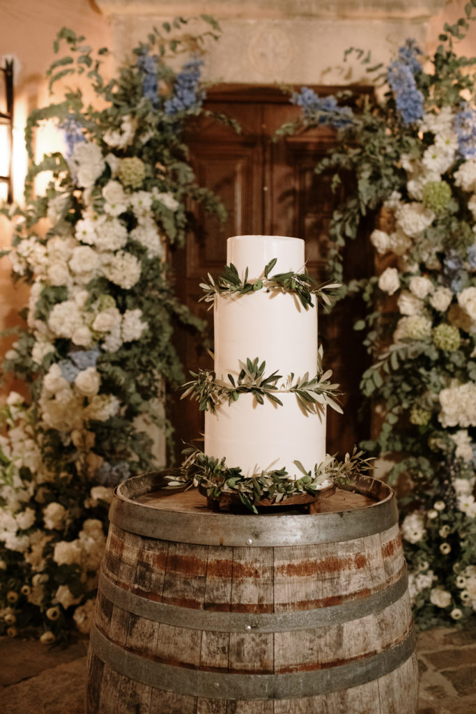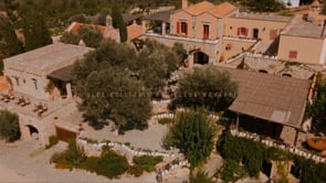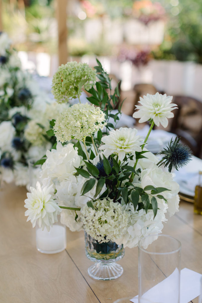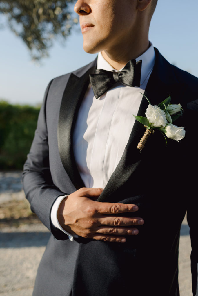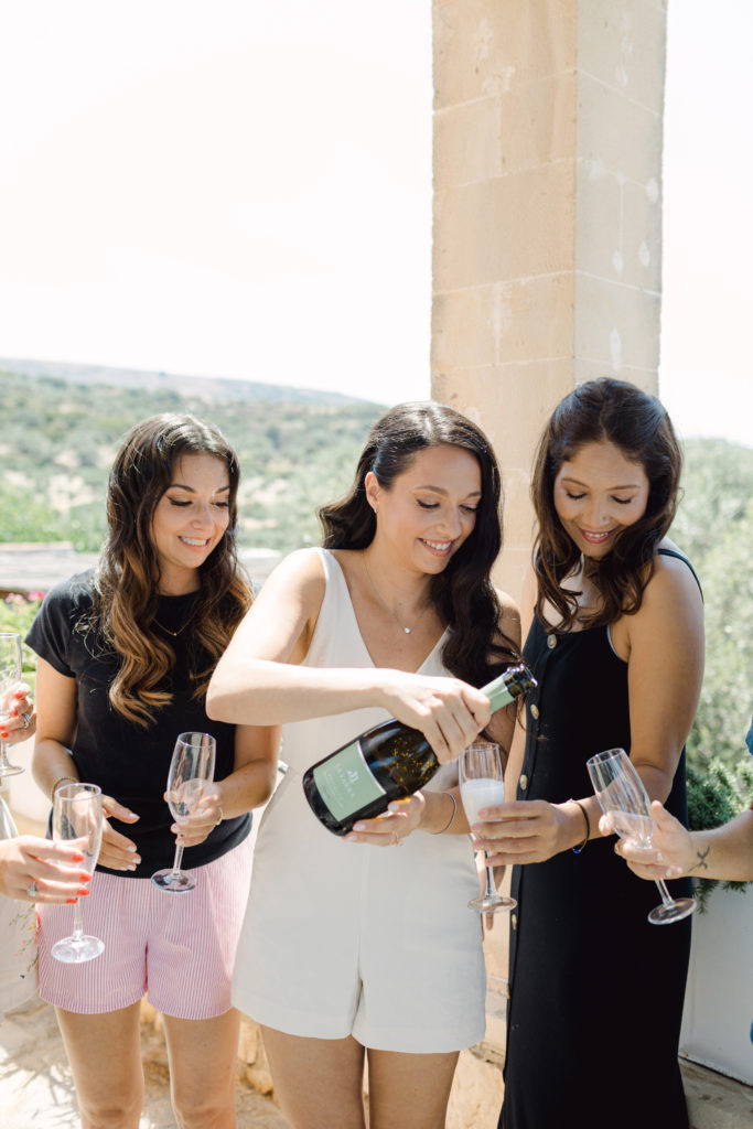 As the day unfolded, the estate transformed into a rustic dreamscape. Wooden tables stretched beneath the olive branches, dressed in lush floral runners, flickering candles, and elegant gold chargers that caught the warm evening light. Every detail—gold cutlery, handcrafted olive-oil favors, and airy blooms—reflected a celebration rooted in authenticity yet elevated with refined artistry. The soft palette of whites, greens, and delicate blues created a serene atmosphere, echoing the calm devotion between the couple.