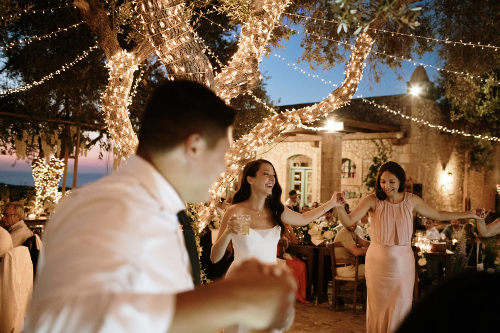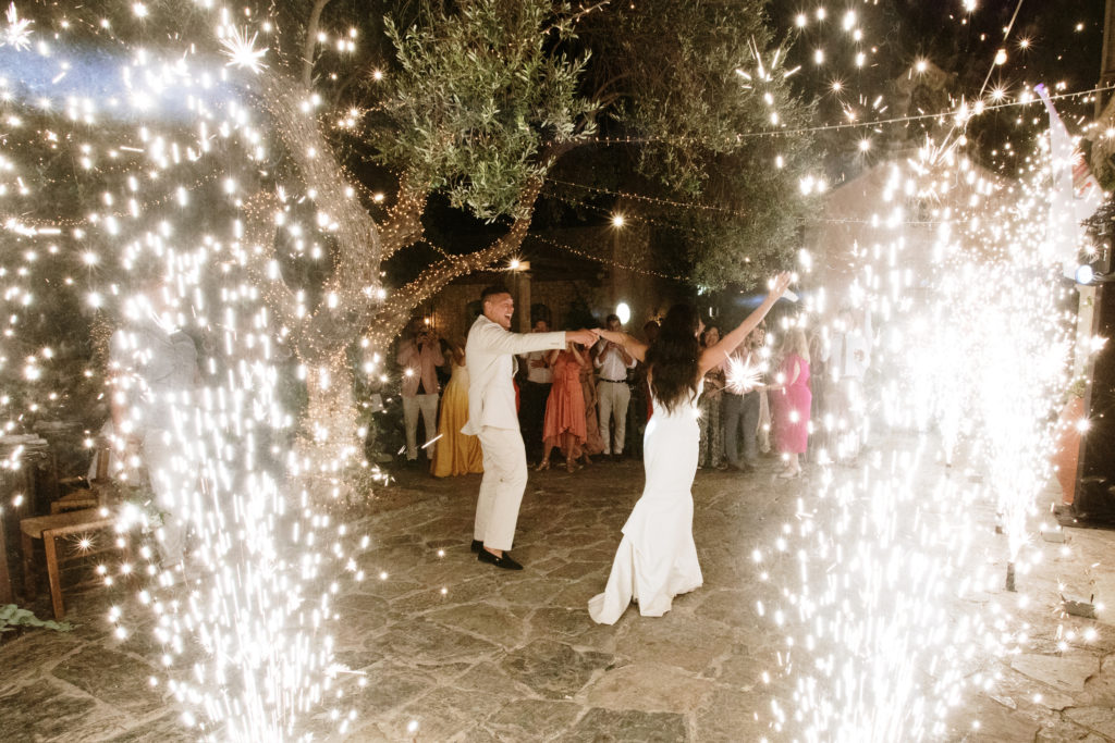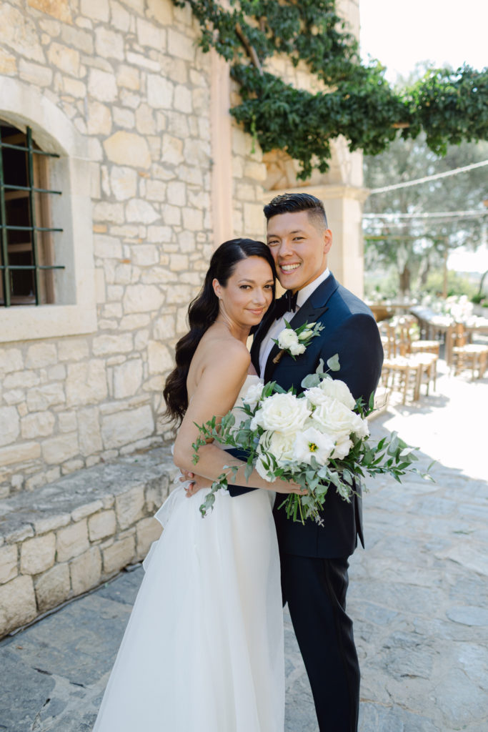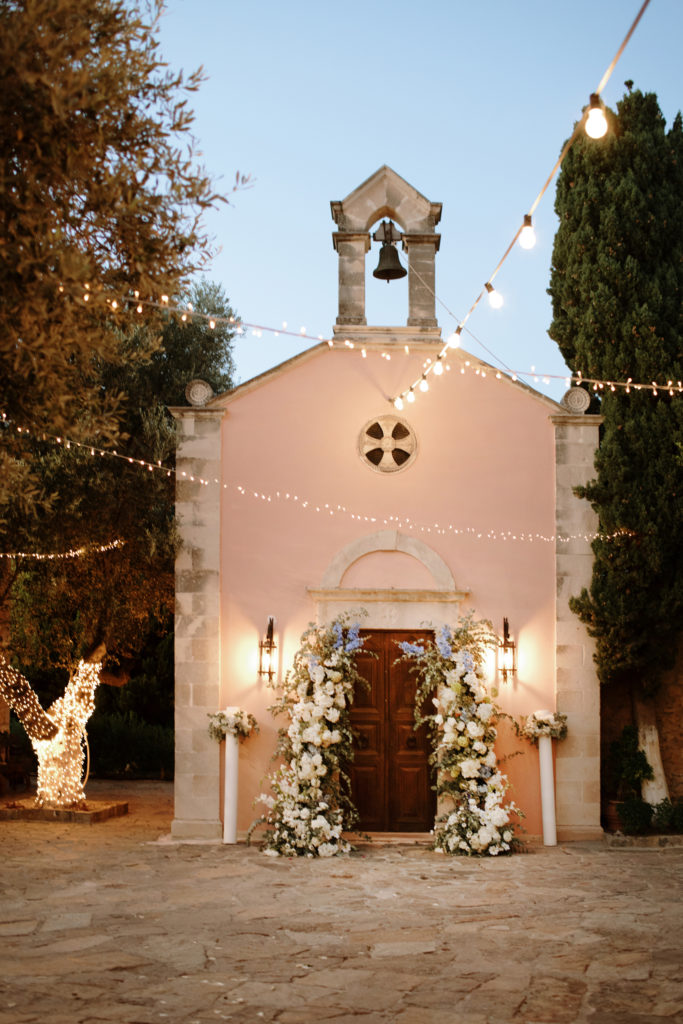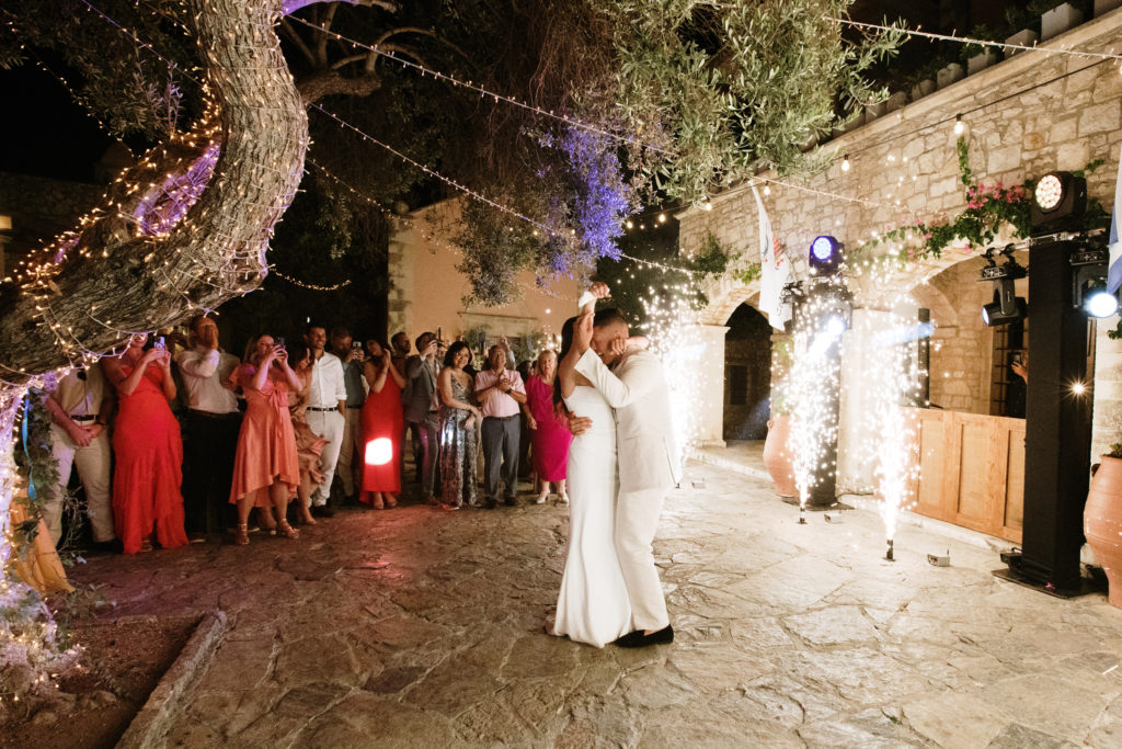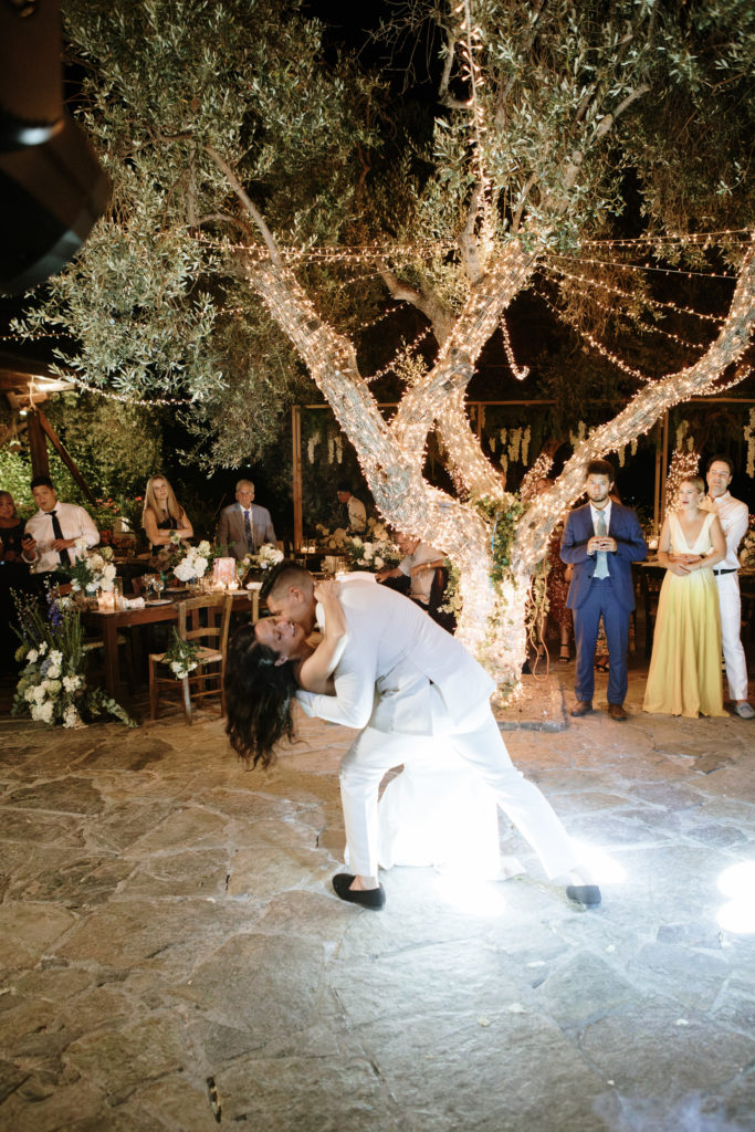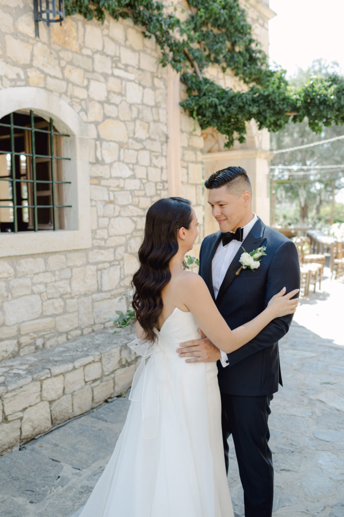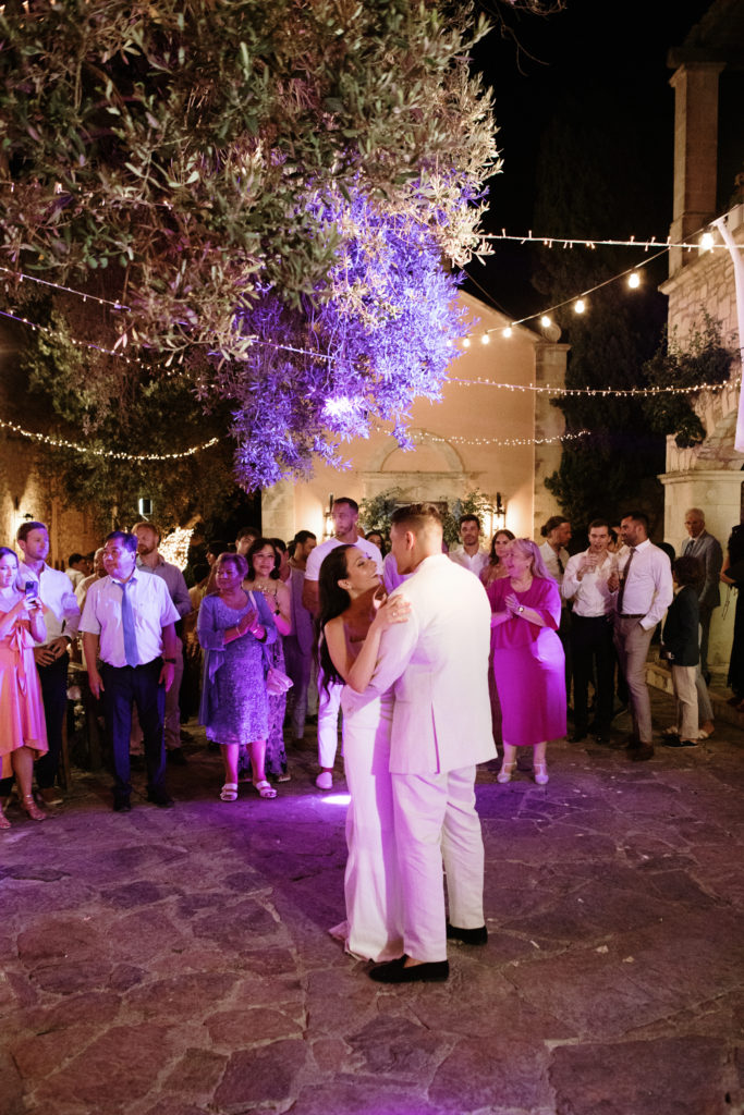 When night embraced the grove, strings of lights shimmered like constellations gathered just for them. Loved ones gathered around the long tables, sharing heartfelt toasts as the couple moved through the reception wrapped in joy. The ancient estate, the fragrant olive trees, and the storybook décor came together to honor a love that felt as enduring as the landscape itself. In this enchanting corner of Crete, their wedding became a living fairytale—one written in flowers, light, and the boundless promise of forever.