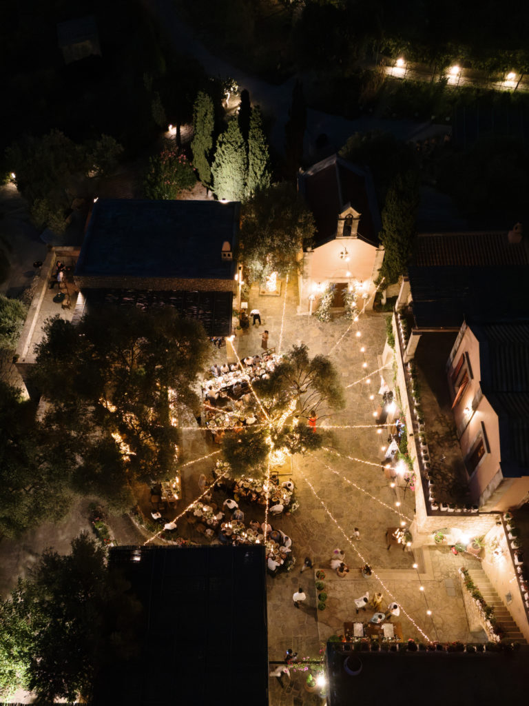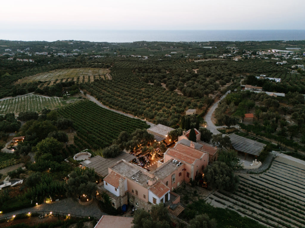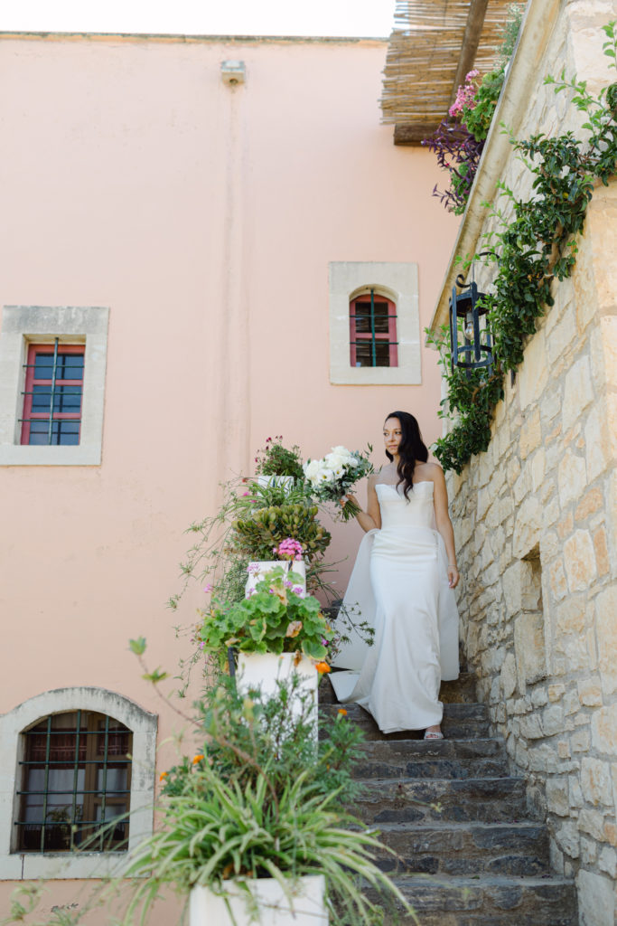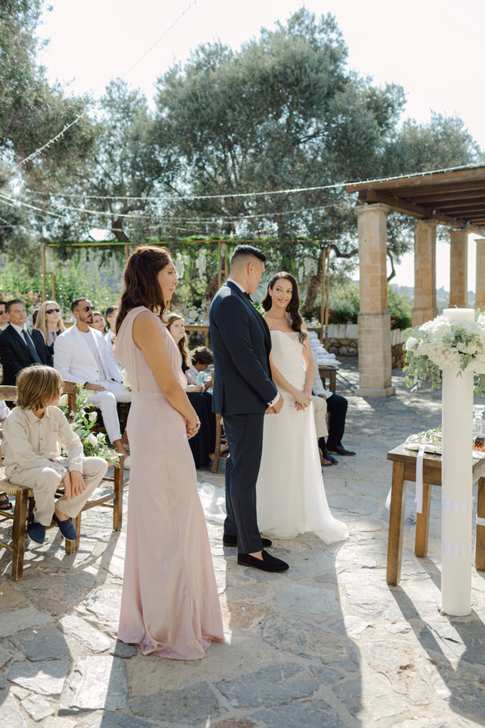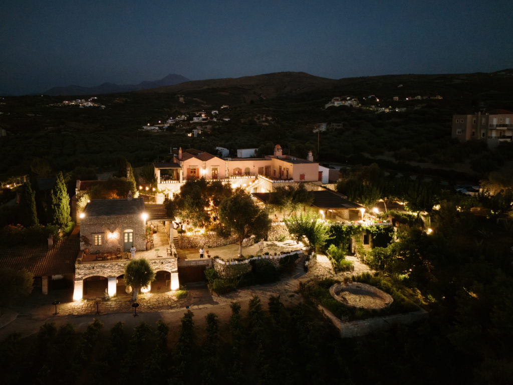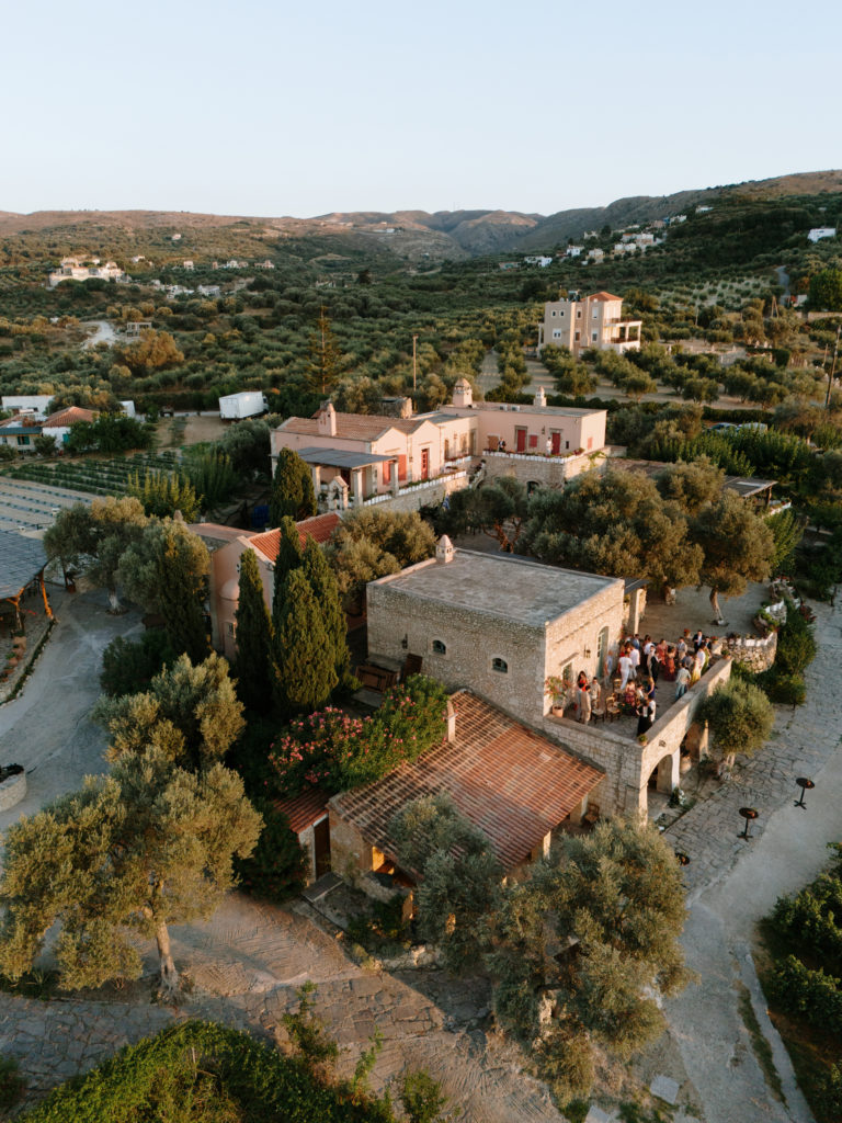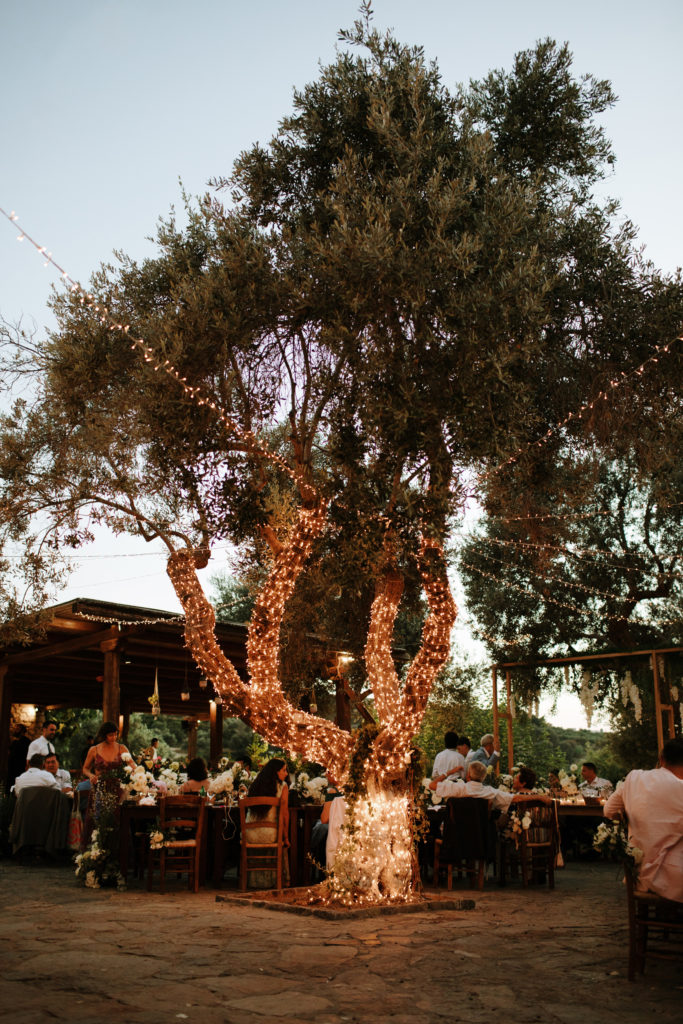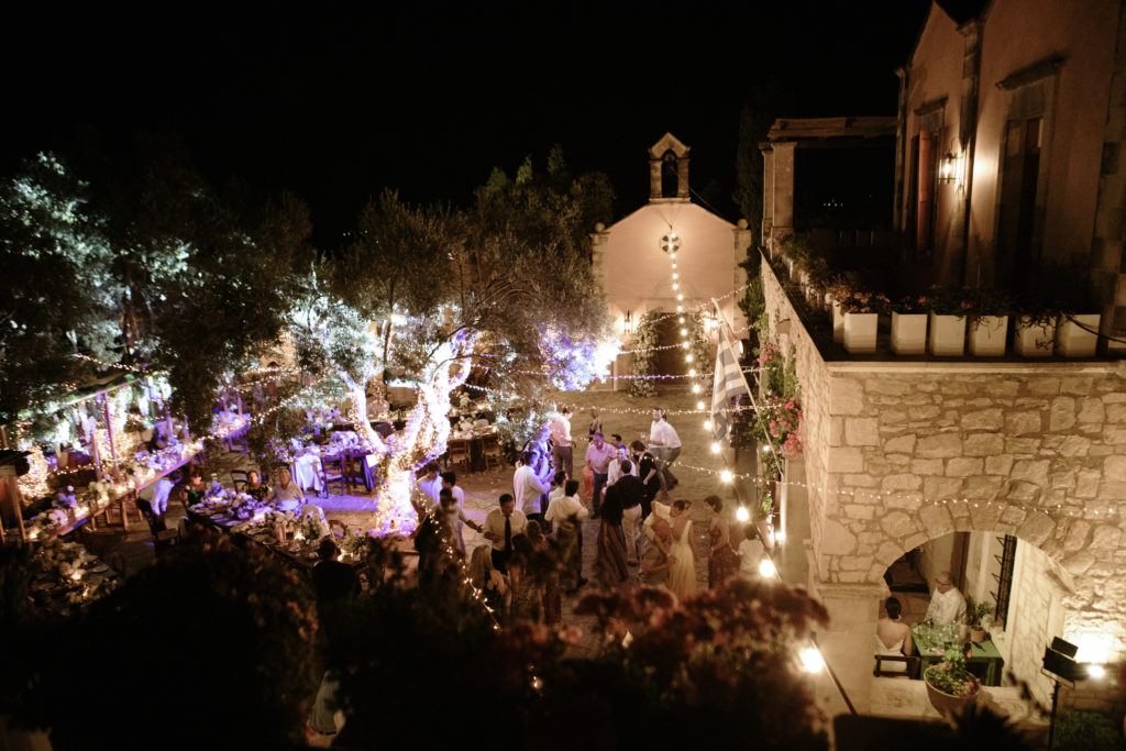 When night embraced the grove, strings of lights shimmered like constellations gathered just for them. Loved ones gathered around the long tables, sharing heartfelt toasts as the couple moved through the reception wrapped in joy. The ancient estate, the fragrant olive trees, and the storybook décor came together to honor a love that felt as enduring as the landscape itself. In this enchanting corner of Crete, their wedding became a living fairytale—one written in flowers, light, and the boundless promise of forever.