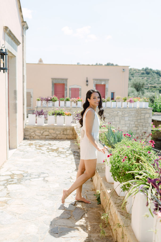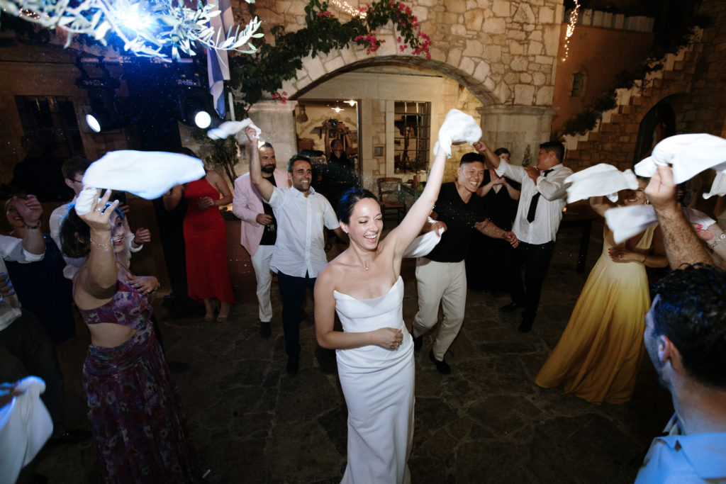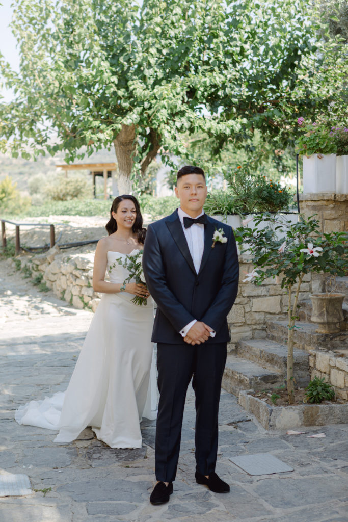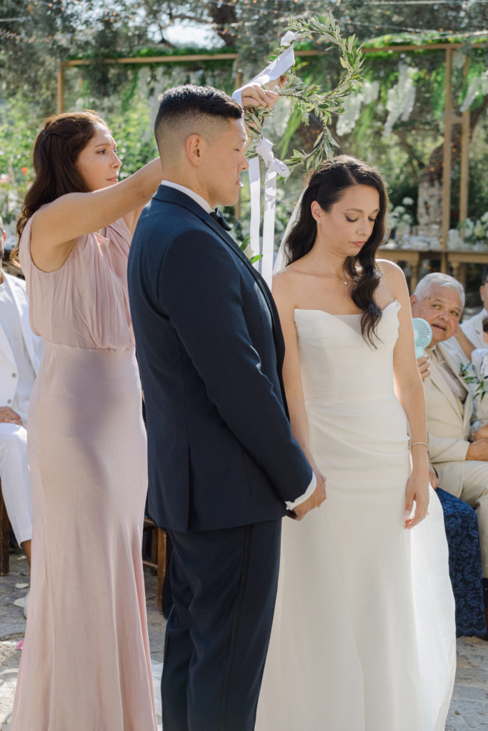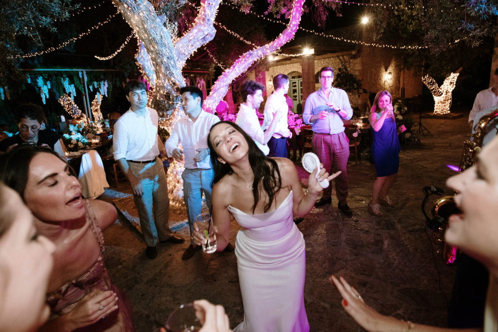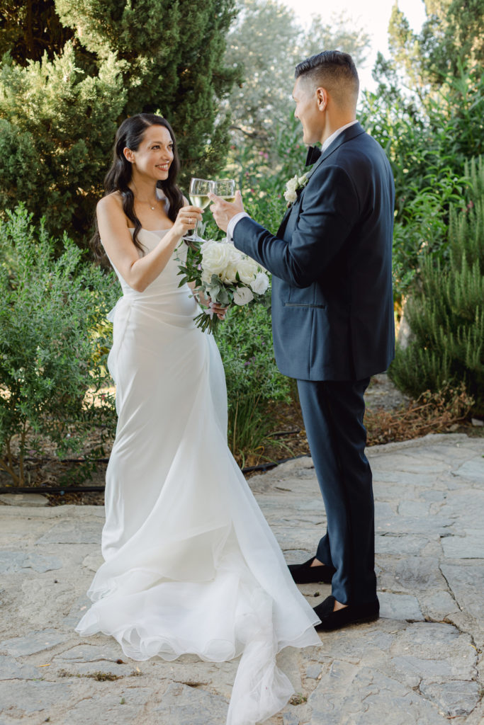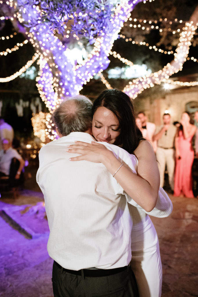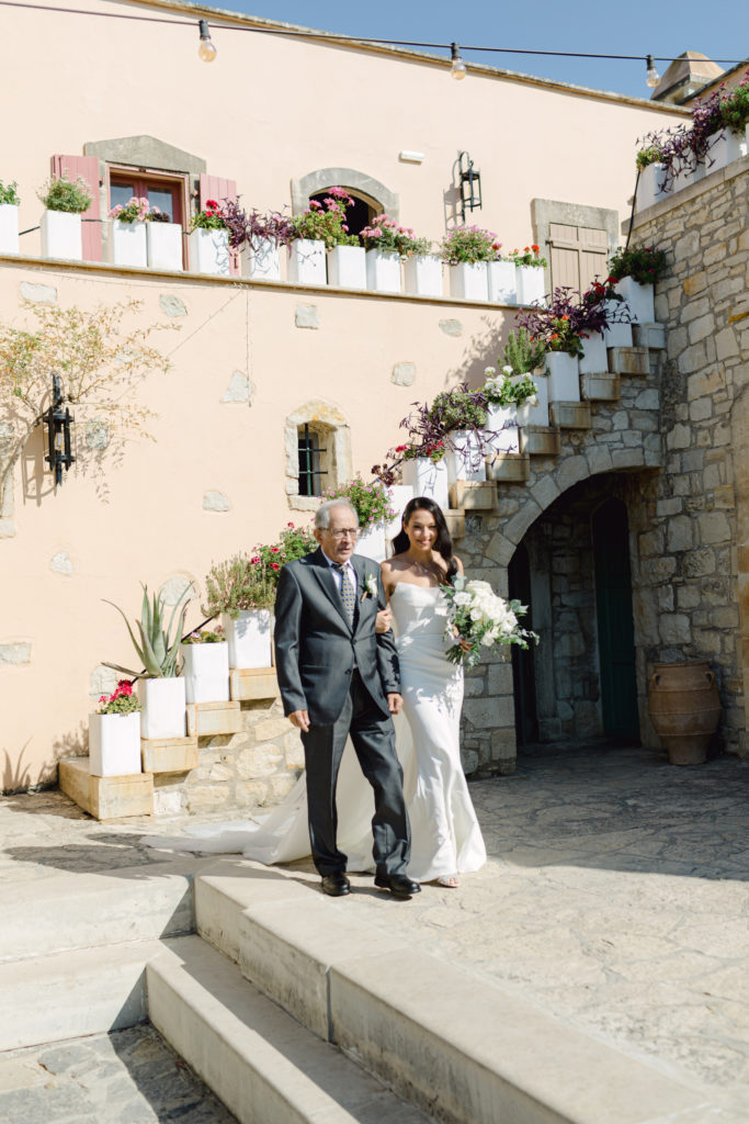 When night embraced the grove, strings of lights shimmered like constellations gathered just for them. Loved ones gathered around the long tables, sharing heartfelt toasts as the couple moved through the reception wrapped in joy. The ancient estate, the fragrant olive trees, and the storybook décor came together to honor a love that felt as enduring as the landscape itself. In this enchanting corner of Crete, their wedding became a living fairytale—one written in flowers, light, and the boundless promise of forever.