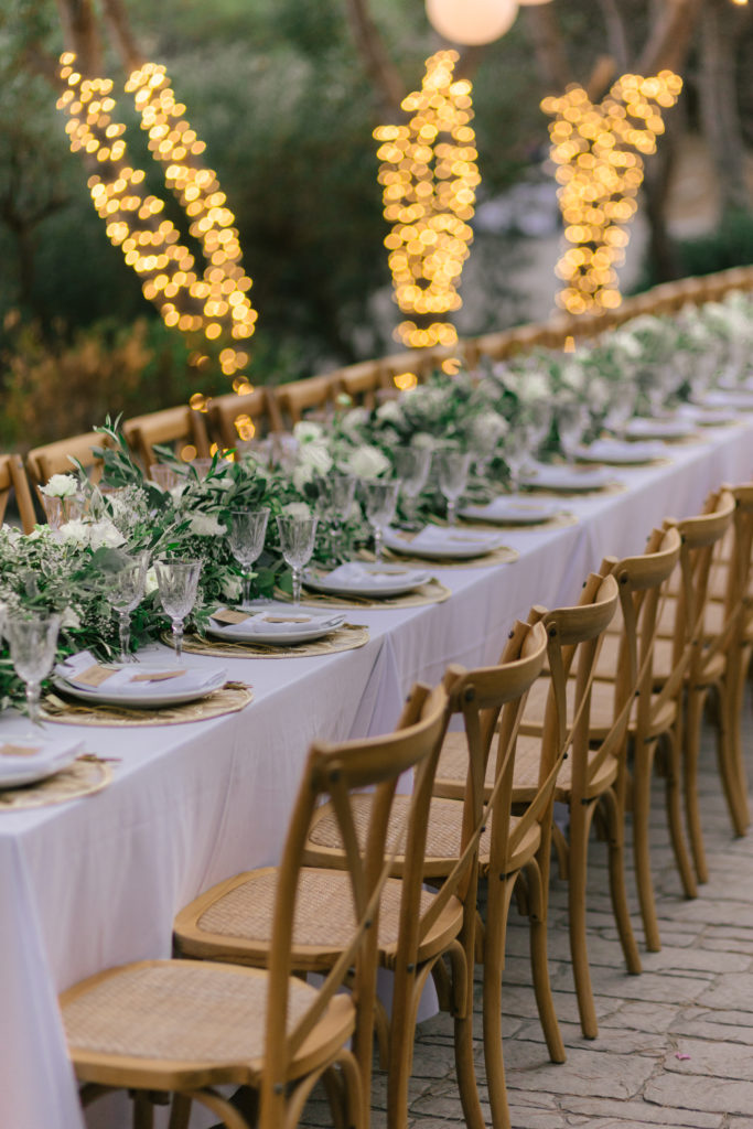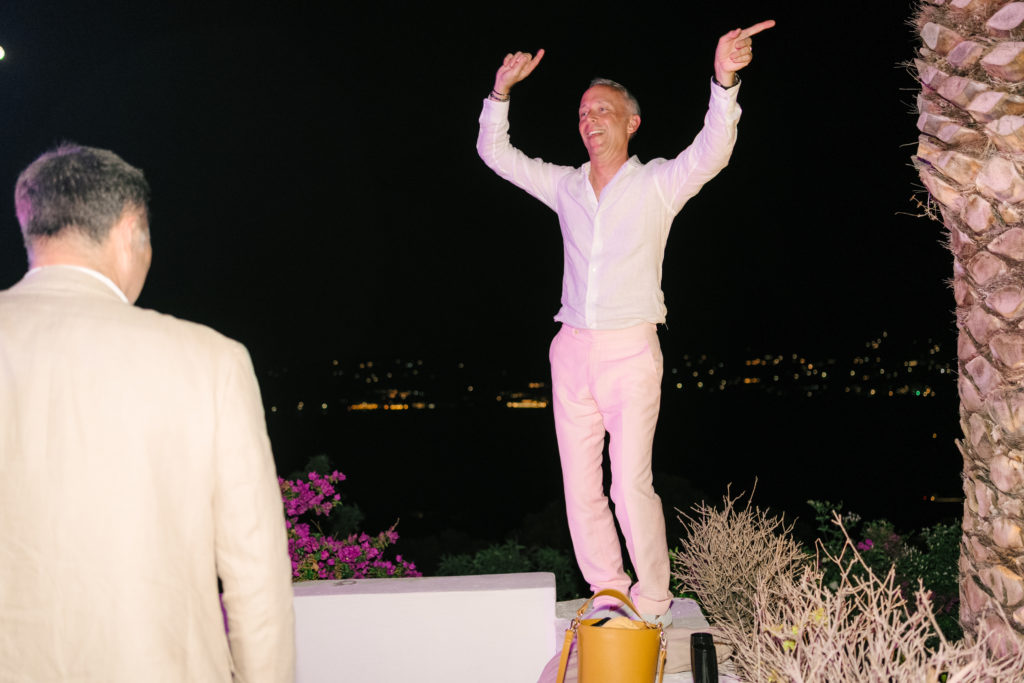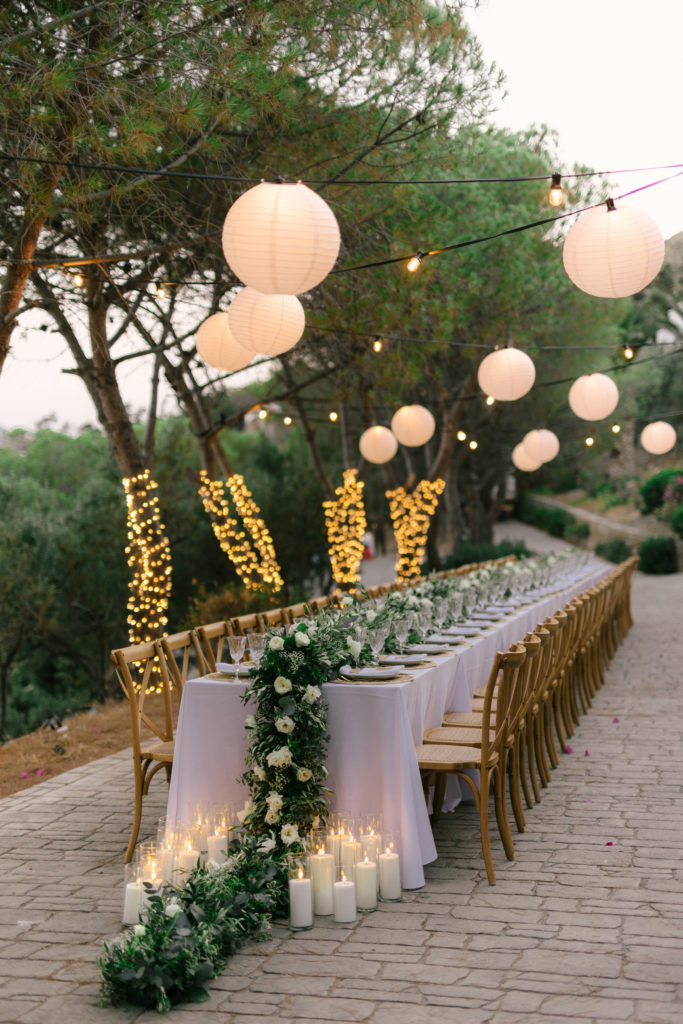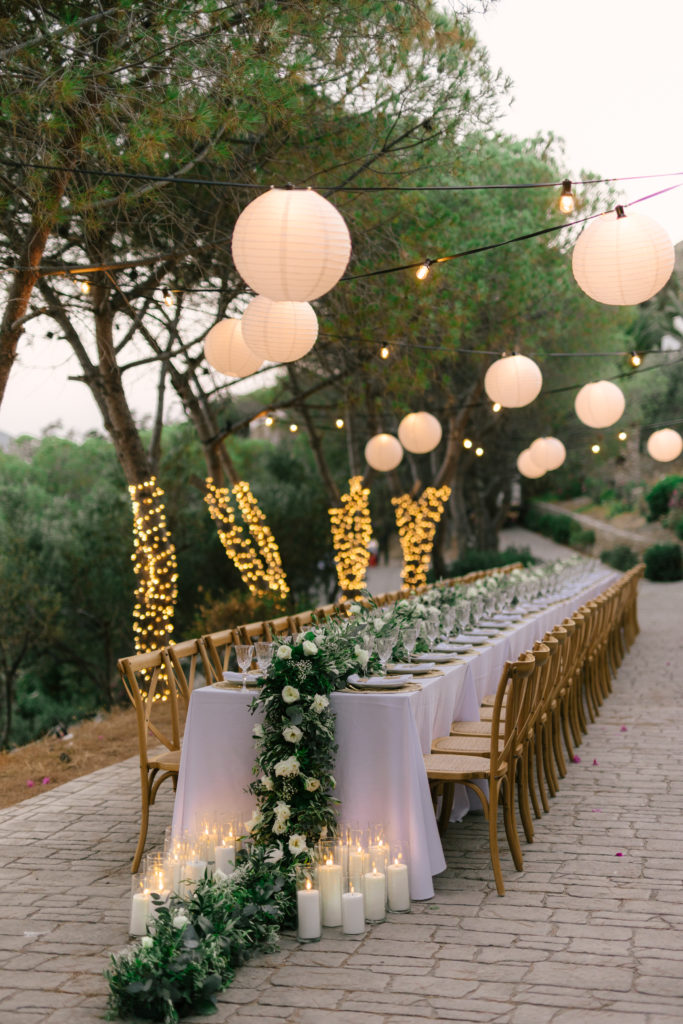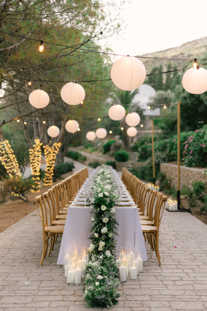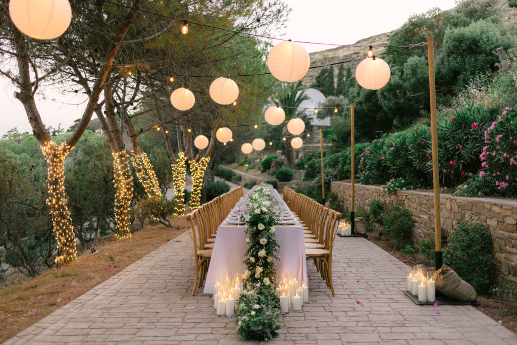 As the sun set, the villa transformed into a glowing oasis with string lights, lanterns, and candle clusters illuminating the outdoor celebration. Guests enjoyed an unforgettable evening under the trees, where the long banquet table became the heart of the celebration. This Paros villa wedding effortlessly blended modern romance with natural island charm — a perfect inspiration for couples dreaming of an elegant destination wedding in Greece.