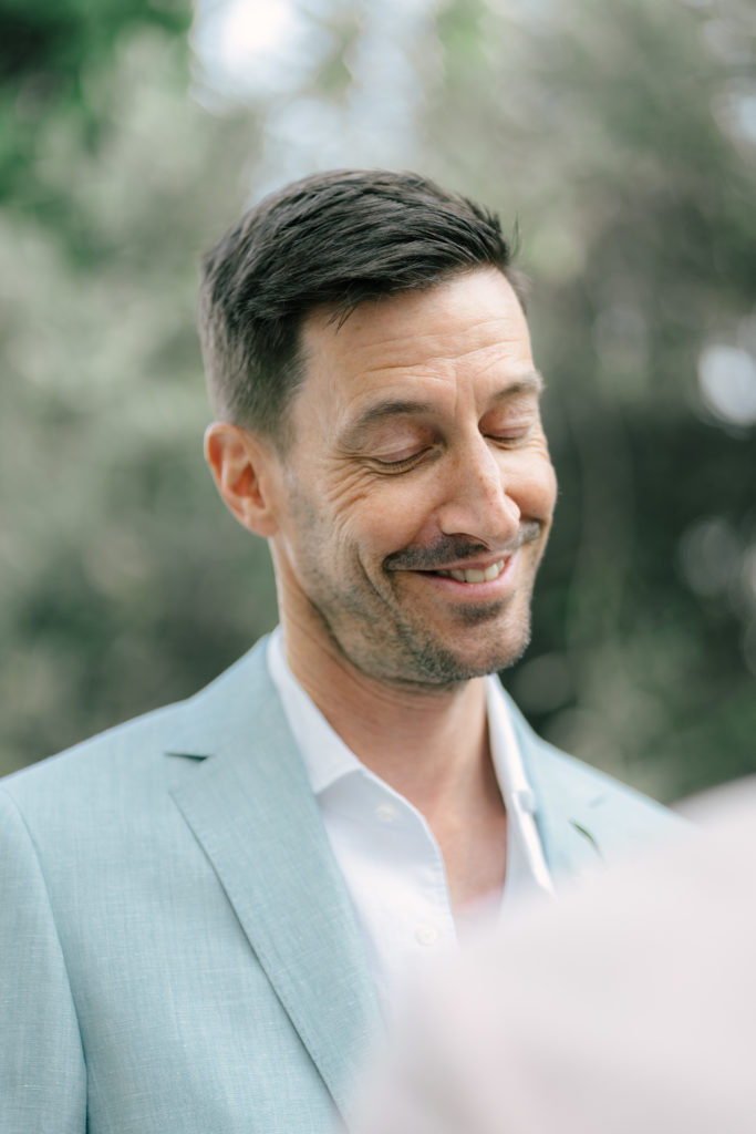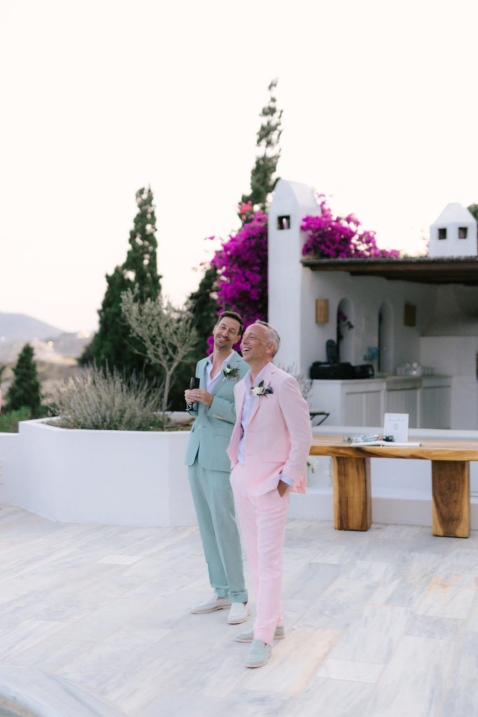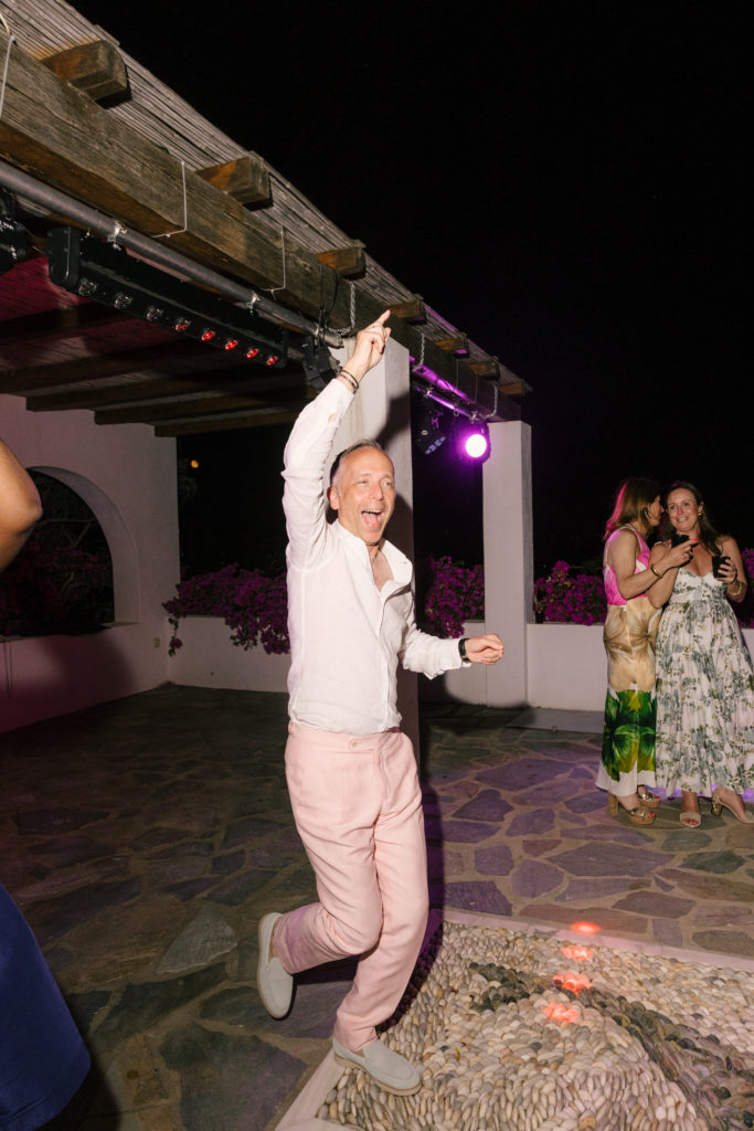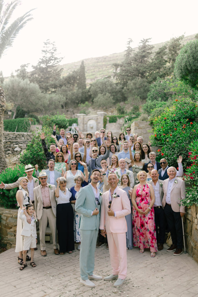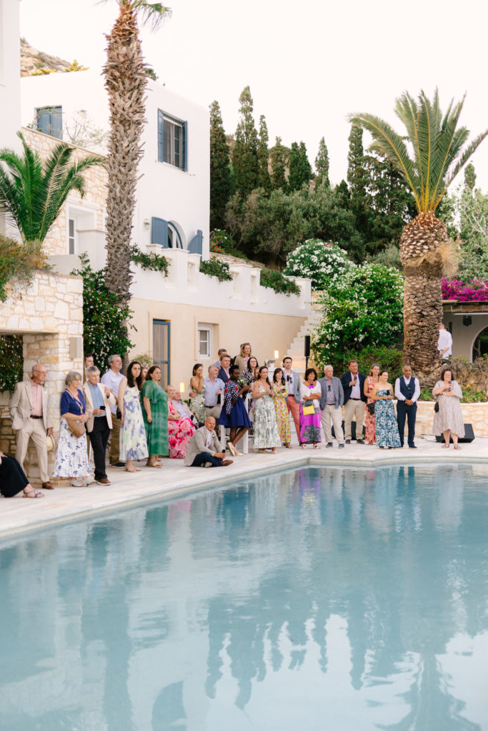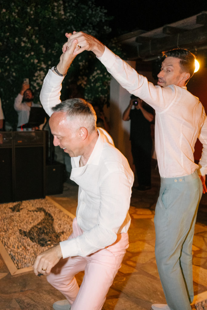 As the sun set, the villa transformed into a glowing oasis with string lights, lanterns, and candle clusters illuminating the outdoor celebration. Guests enjoyed an unforgettable evening under the trees, where the long banquet table became the heart of the celebration. This Paros villa wedding effortlessly blended modern romance with natural island charm — a perfect inspiration for couples dreaming of an elegant destination wedding in Greece.