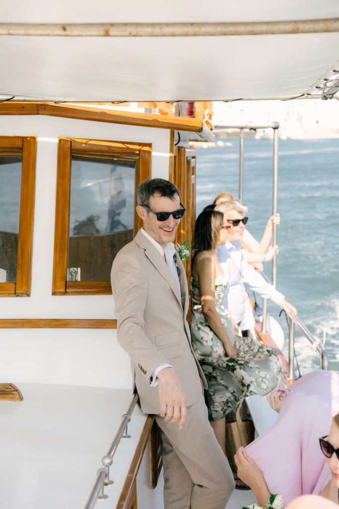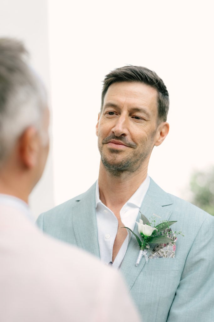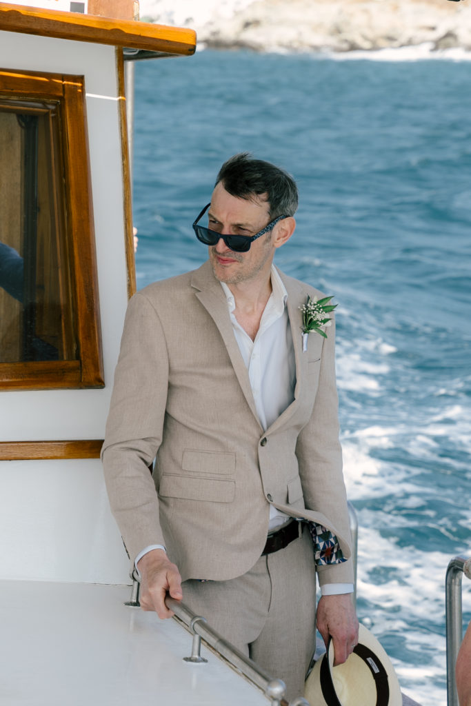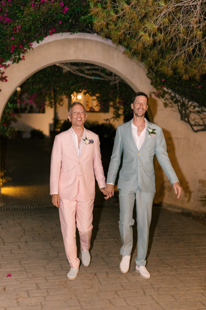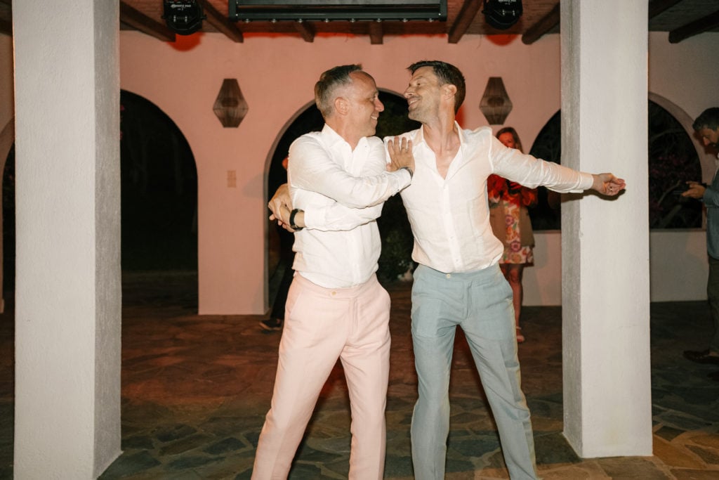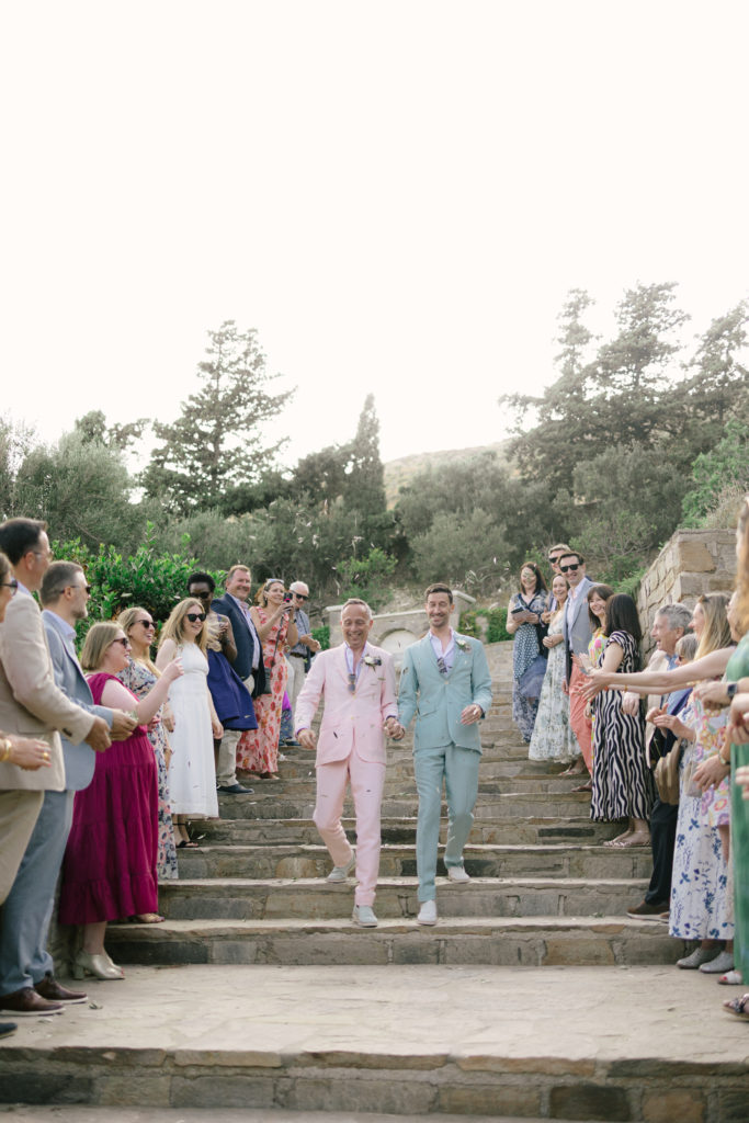 As the sun set, the villa transformed into a glowing oasis with string lights, lanterns, and candle clusters illuminating the outdoor celebration. Guests enjoyed an unforgettable evening under the trees, where the long banquet table became the heart of the celebration. This Paros villa wedding effortlessly blended modern romance with natural island charm — a perfect inspiration for couples dreaming of an elegant destination wedding in Greece.