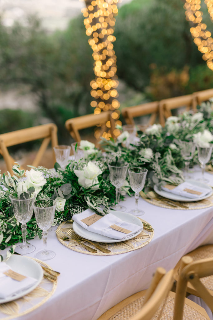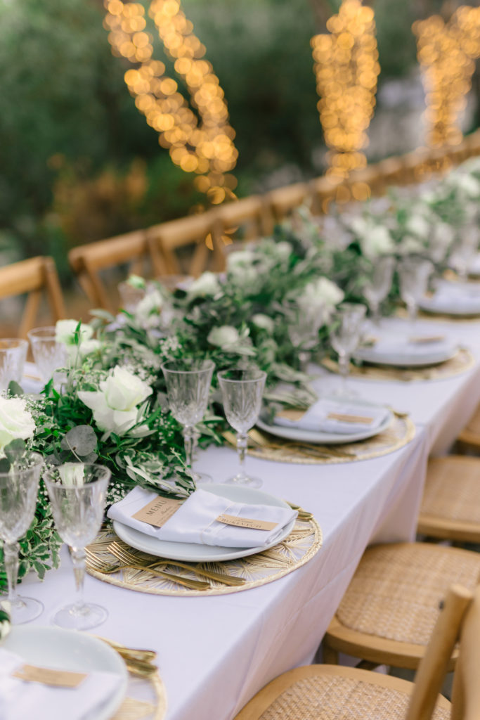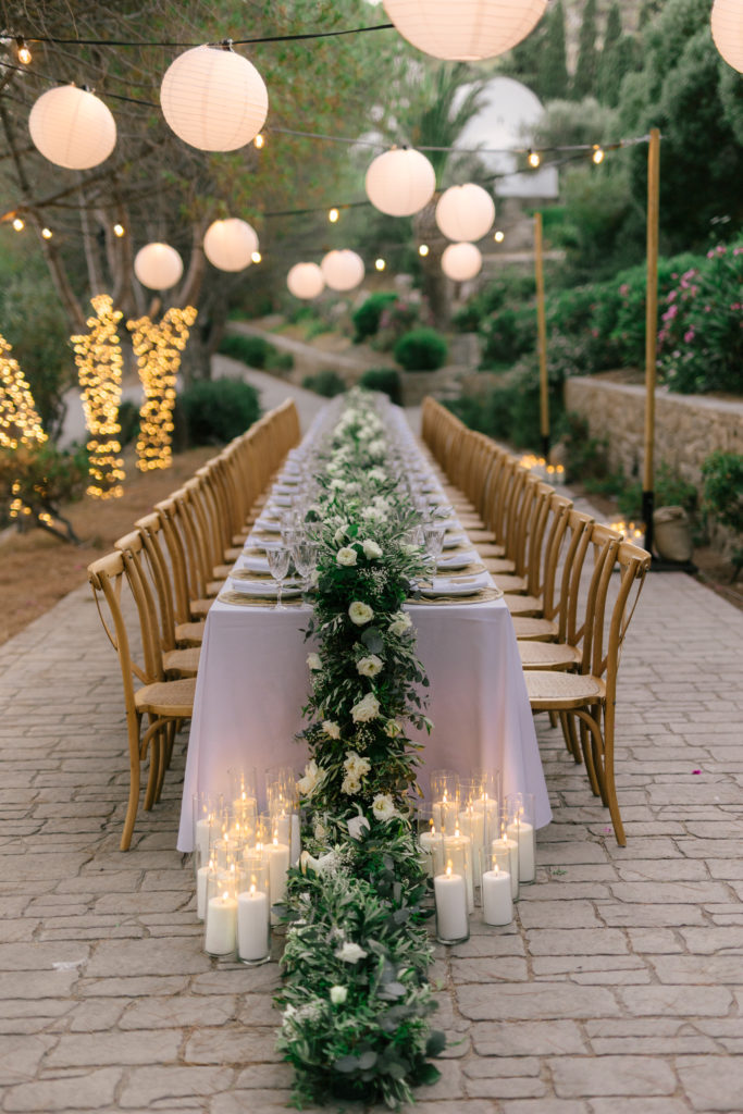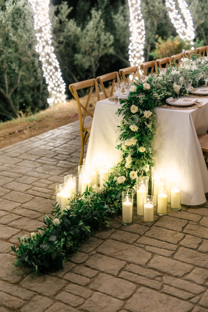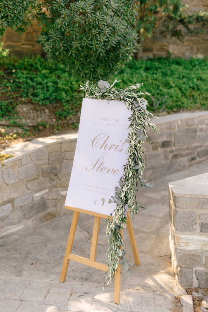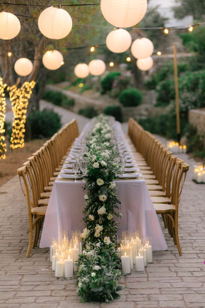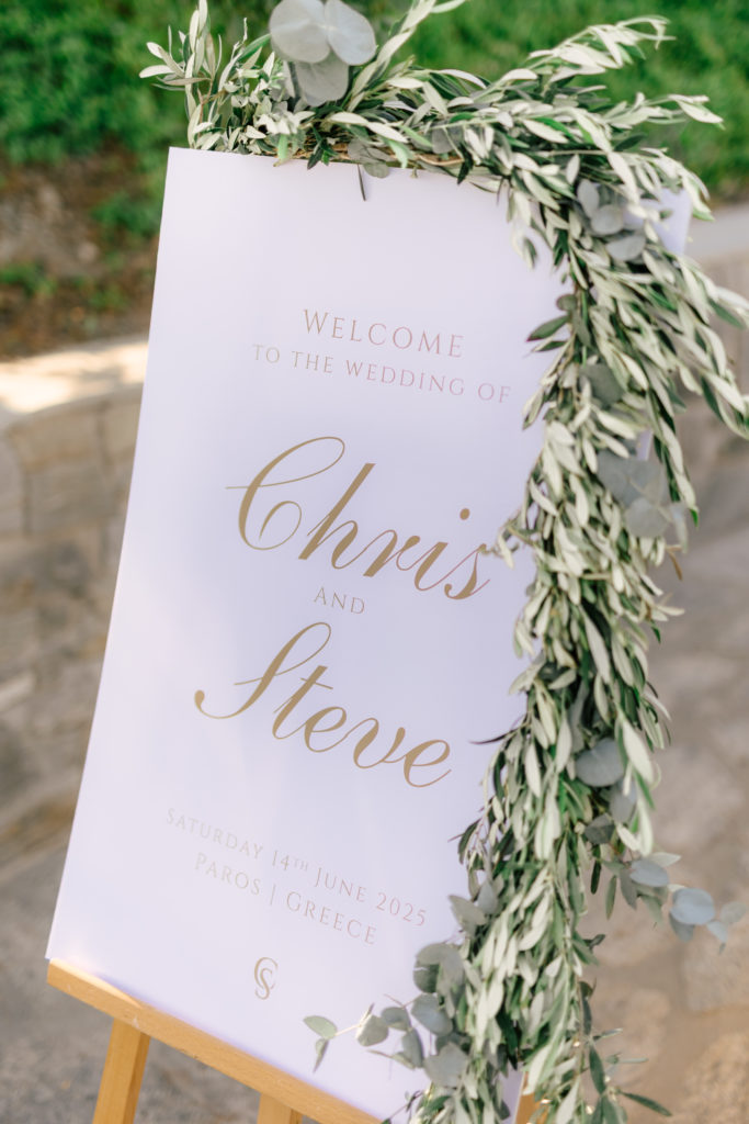 The décor embraced a refined palette of white florals, lush greenery, and gentle natural accents. From the elegant ceremony arrangements to the beautifully styled welcome sign adorned with olive leaves, each detail highlighted the authentic beauty of Paros. Long reception tables were dressed in soft linens and decorated with candlelit pathways, delicate roses, and organic foliage, bringing a romantic chic aesthetic to life.