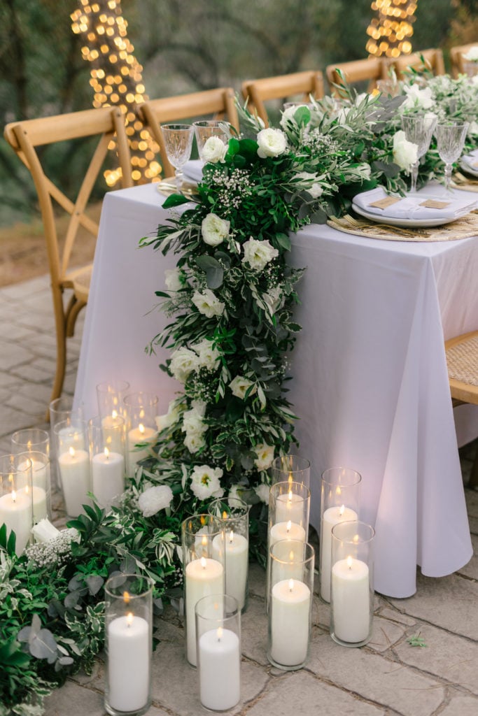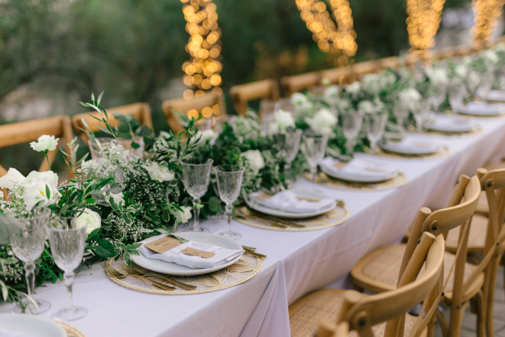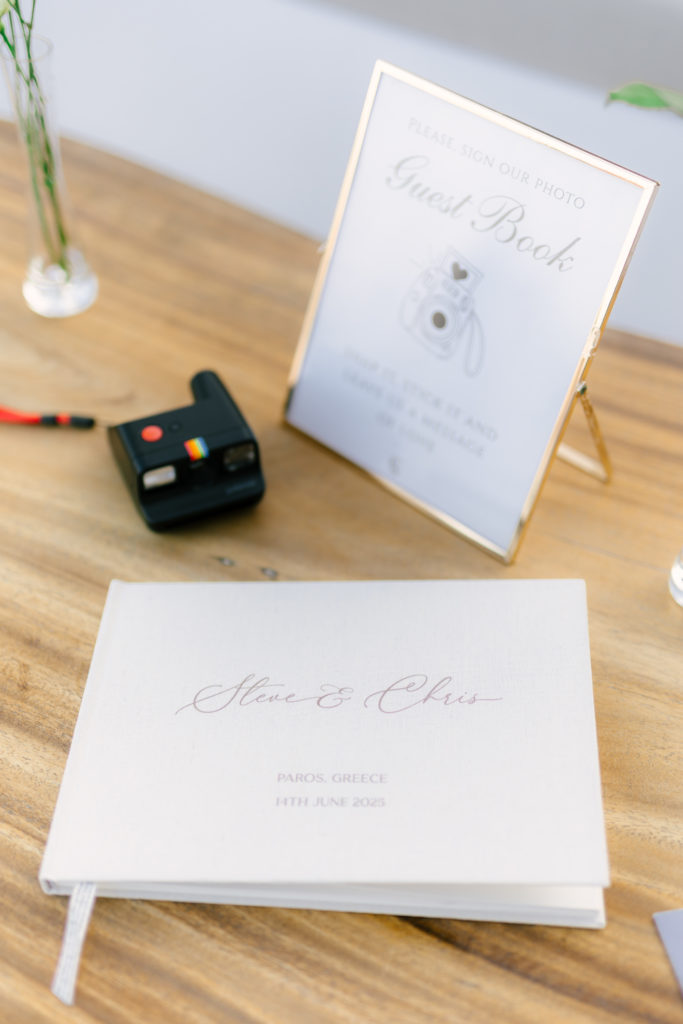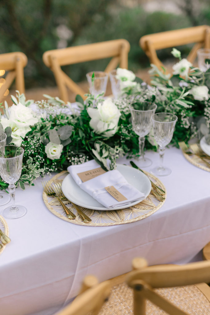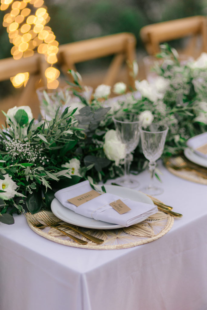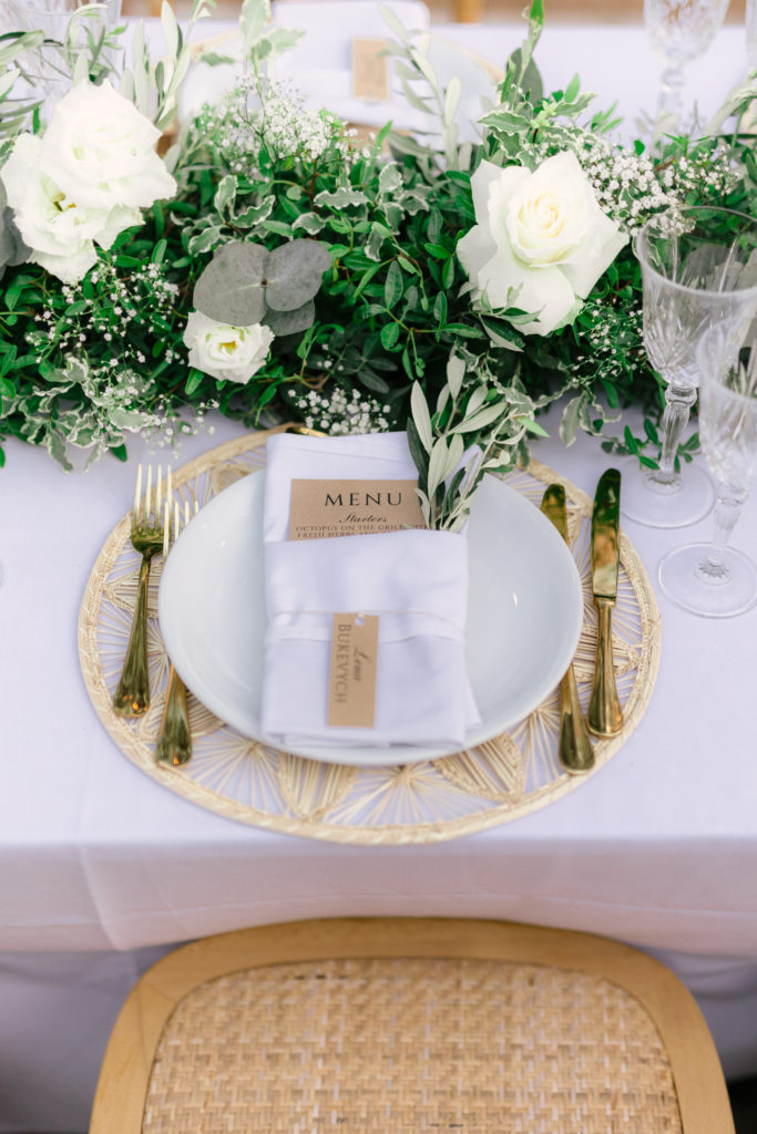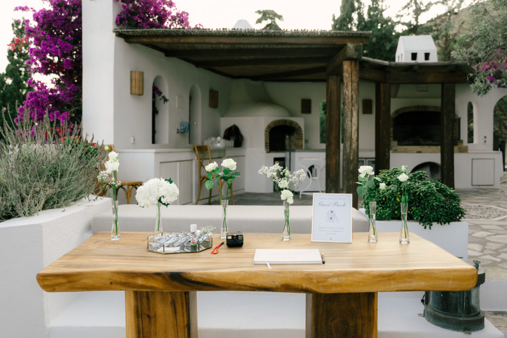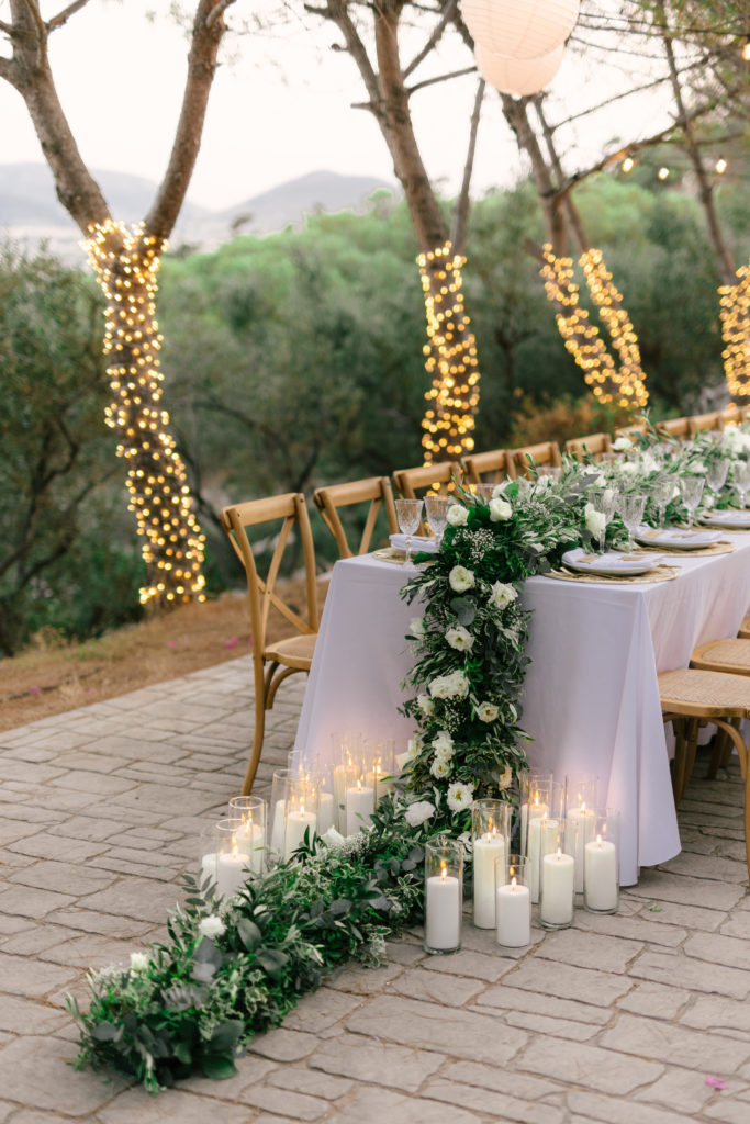 The décor embraced a refined palette of white florals, lush greenery, and gentle natural accents. From the elegant ceremony arrangements to the beautifully styled welcome sign adorned with olive leaves, each detail highlighted the authentic beauty of Paros. Long reception tables were dressed in soft linens and decorated with candlelit pathways, delicate roses, and organic foliage, bringing a romantic chic aesthetic to life.