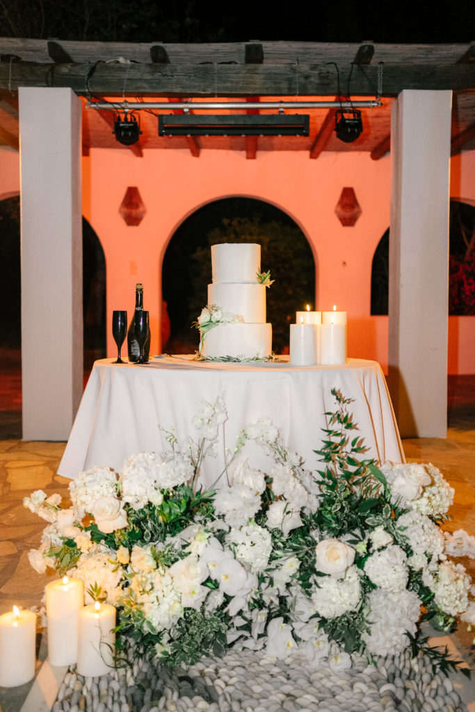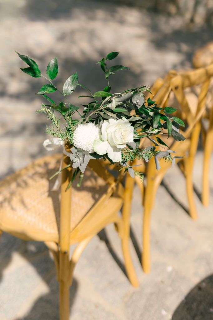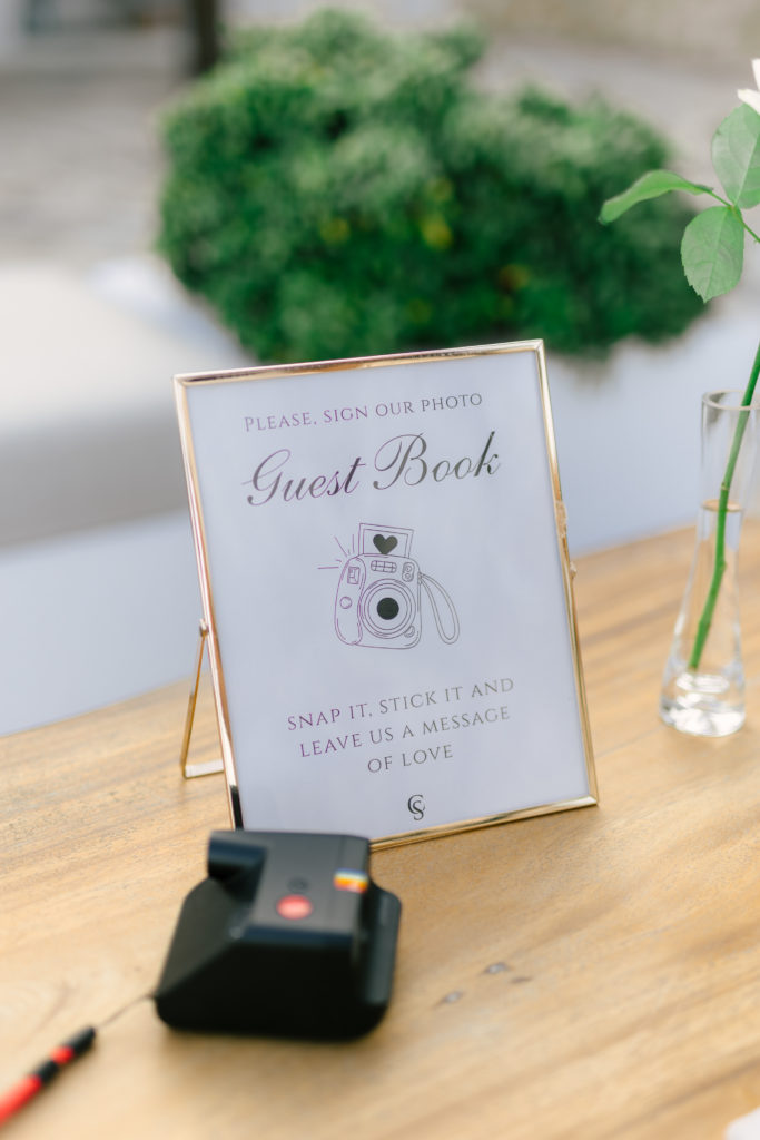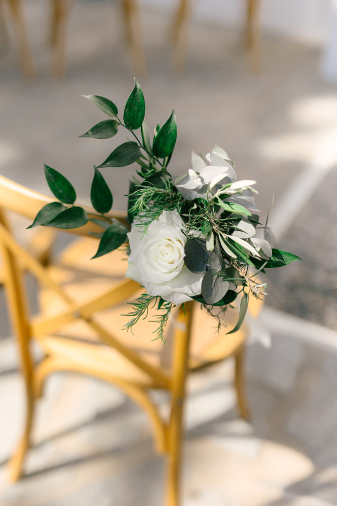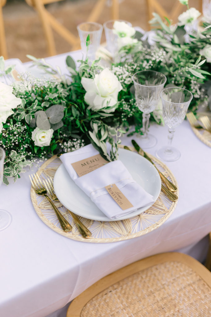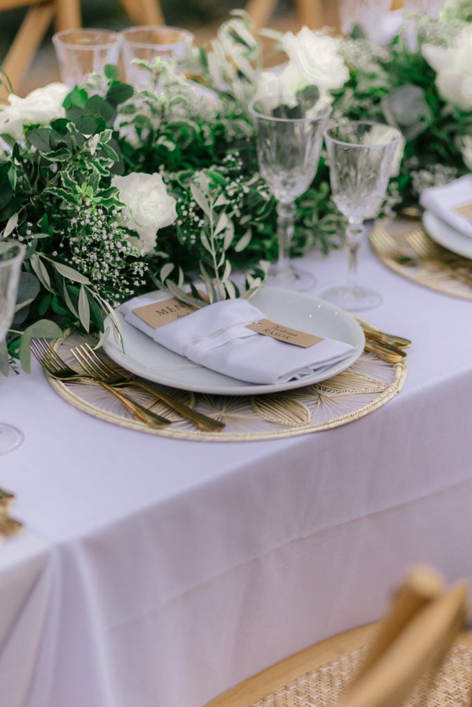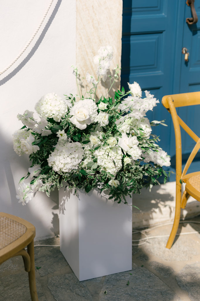 The décor embraced a refined palette of white florals, lush greenery, and gentle natural accents. From the elegant ceremony arrangements to the beautifully styled welcome sign adorned with olive leaves, each detail highlighted the authentic beauty of Paros. Long reception tables were dressed in soft linens and decorated with candlelit pathways, delicate roses, and organic foliage, bringing a romantic chic aesthetic to life.
