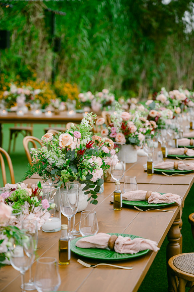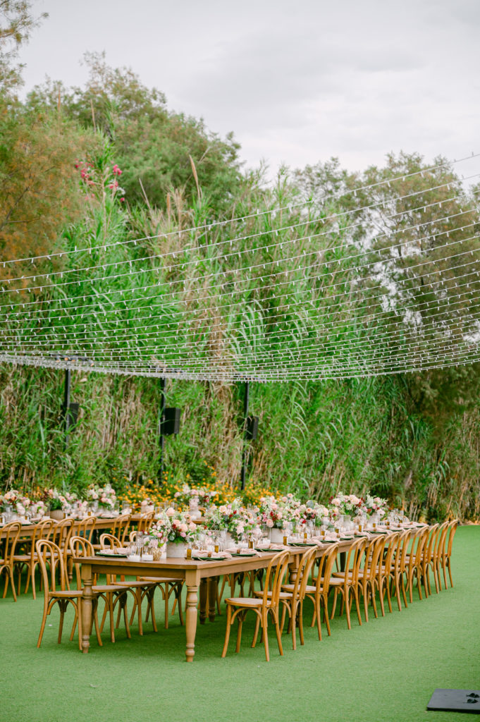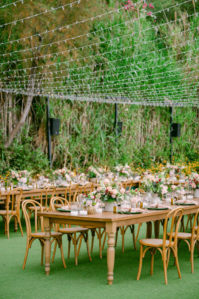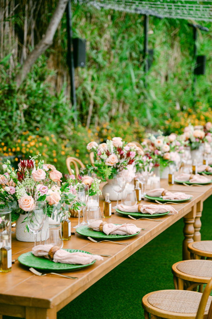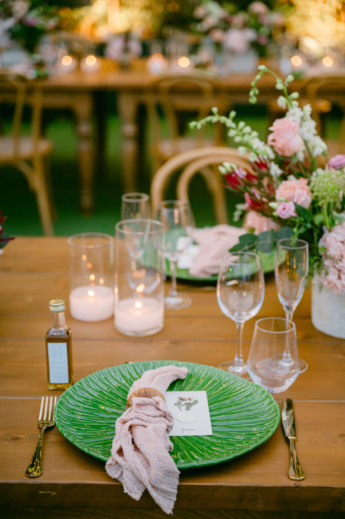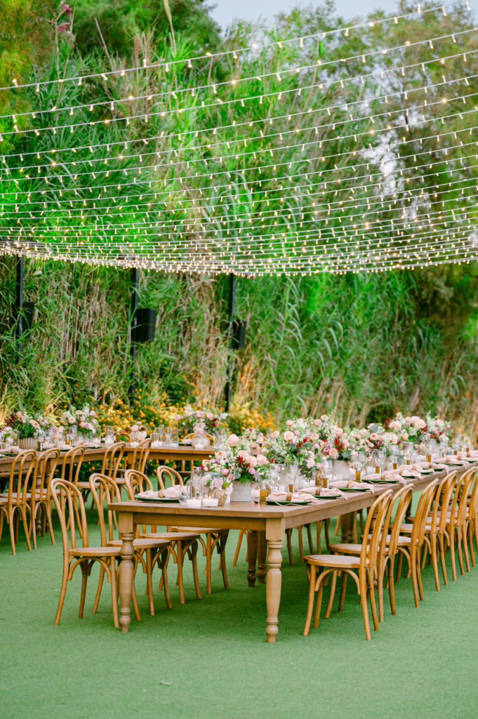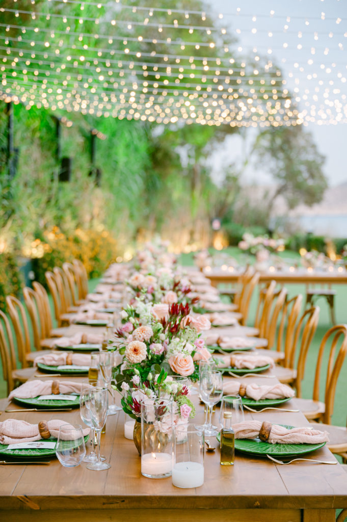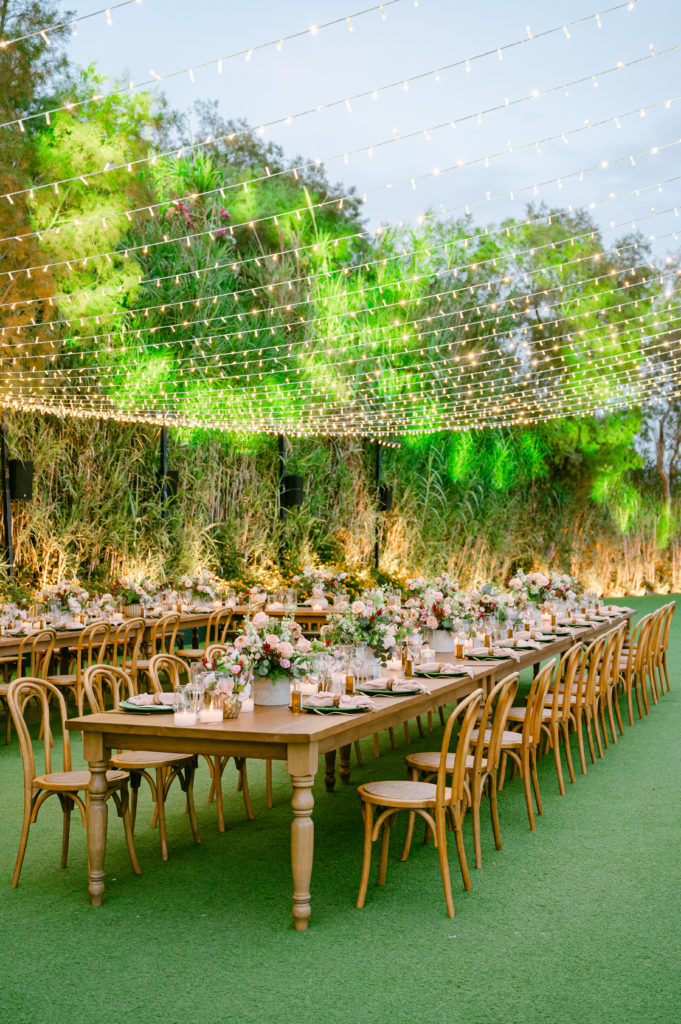 For their vibrant reception, the couple envisioned an atmosphere that was both elegant and alive with emotion. Long wooden tables were dressed with green charger plates, delicate pastel floral arrangements, and gold cutlery that added a touch of refined luxury. Guests dined beneath a canopy of twinkling fairy lights as the sky shifted from sunset to starlit blue, creating an unforgettable mood that blended romance with joyful energy.