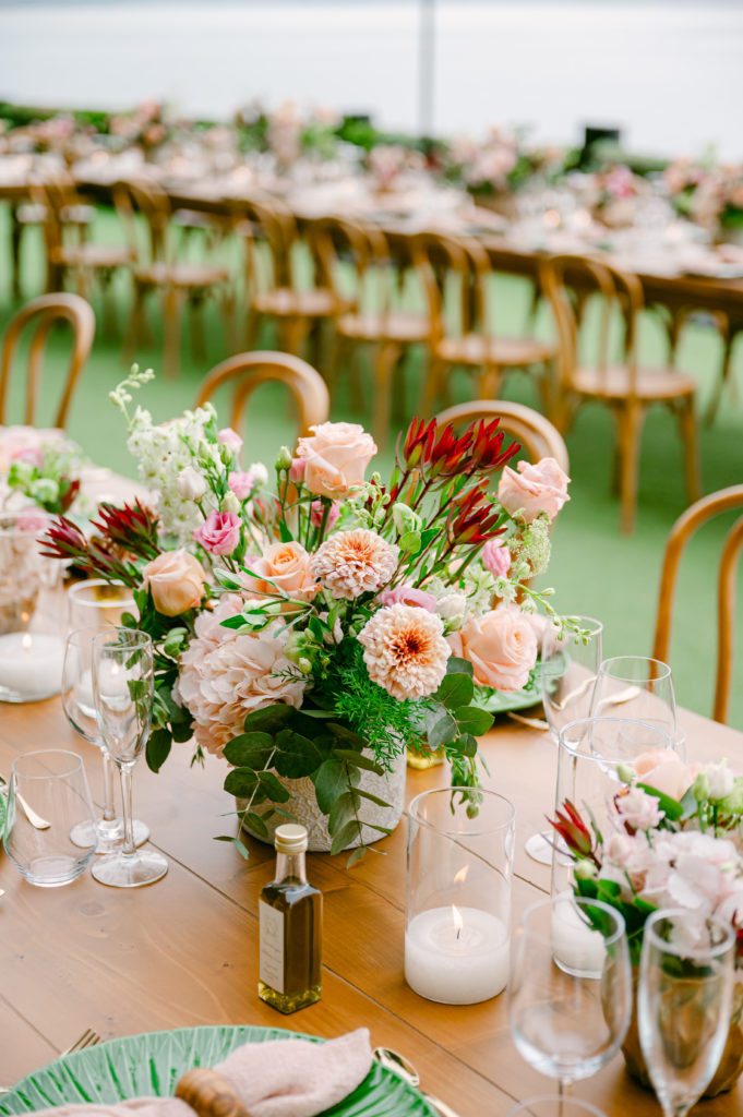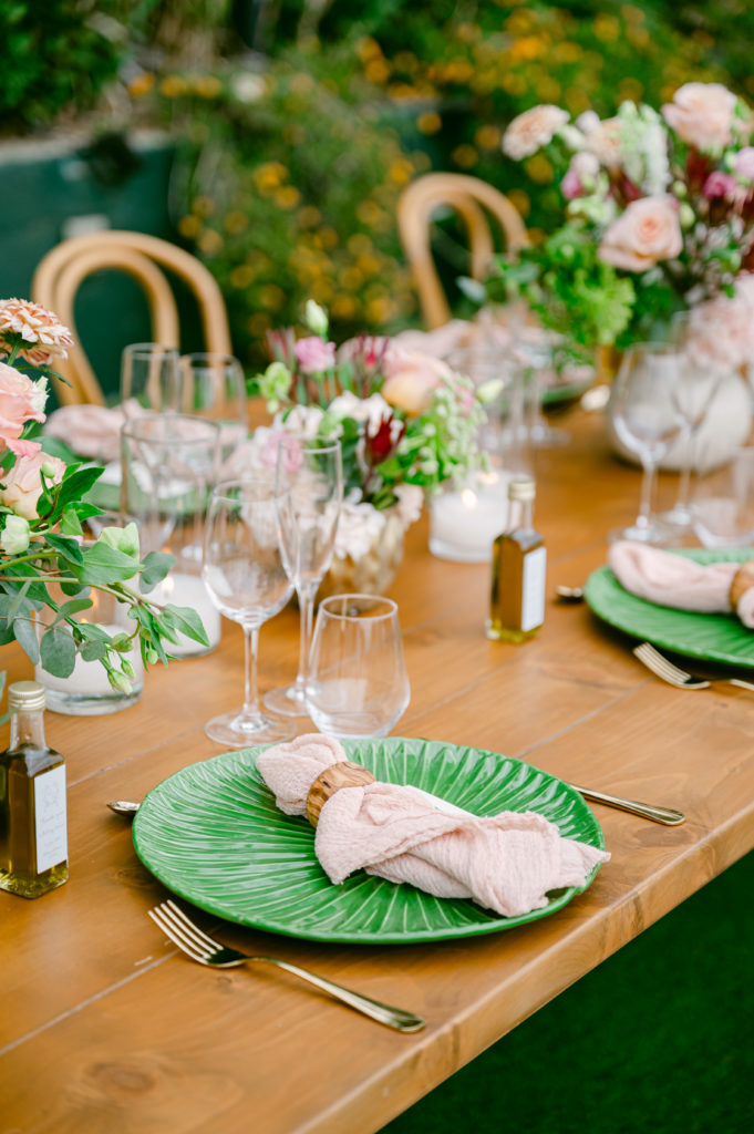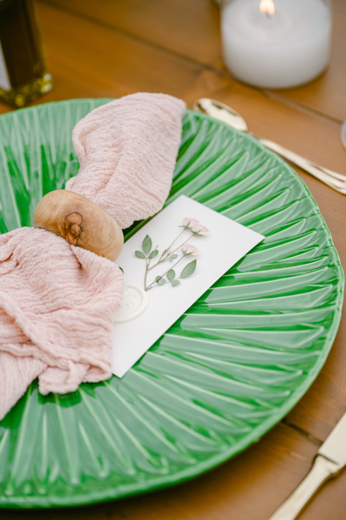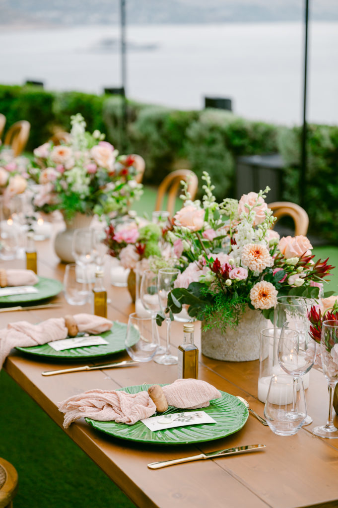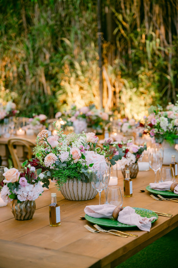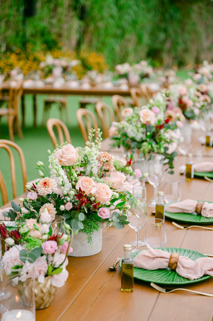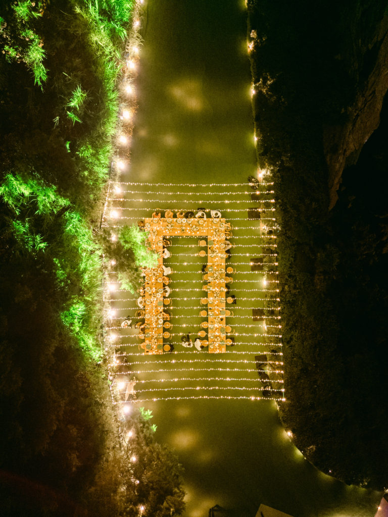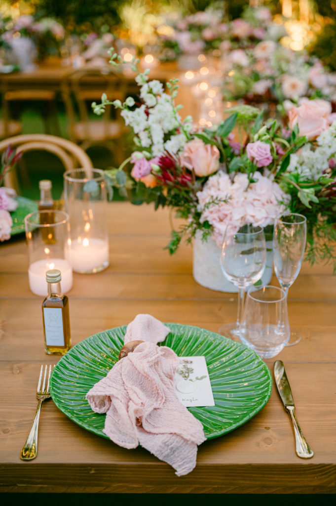 For their vibrant reception, the couple envisioned an atmosphere that was both elegant and alive with emotion. Long wooden tables were dressed with green charger plates, delicate pastel floral arrangements, and gold cutlery that added a touch of refined luxury. Guests dined beneath a canopy of twinkling fairy lights as the sky shifted from sunset to starlit blue, creating an unforgettable mood that blended romance with joyful energy.