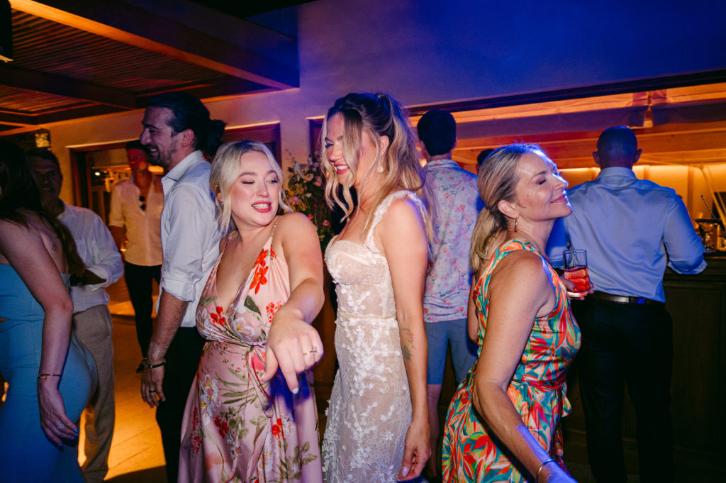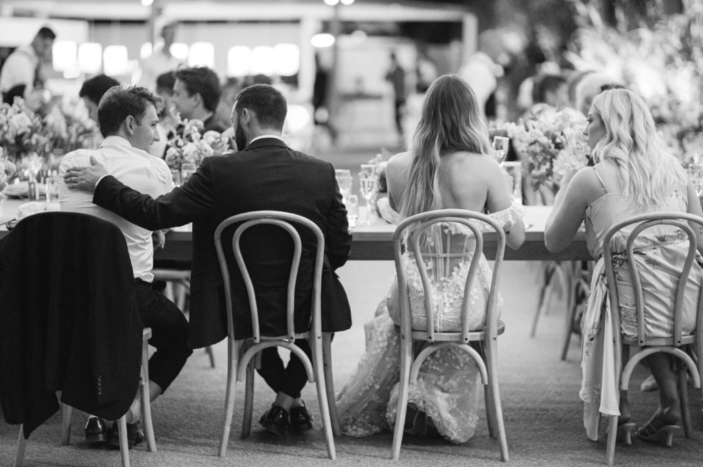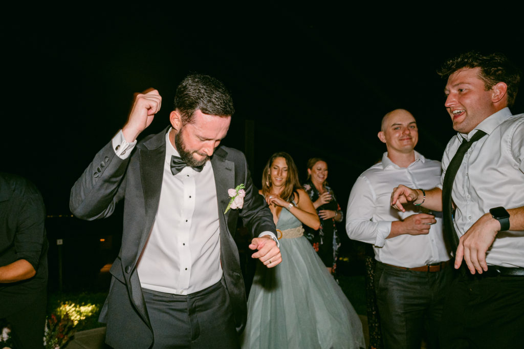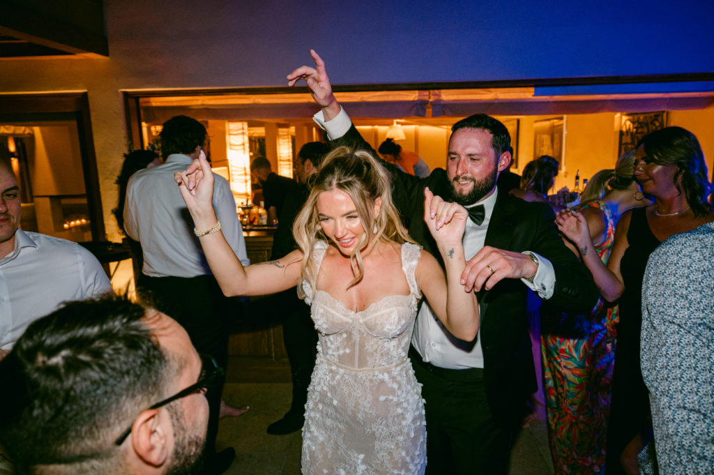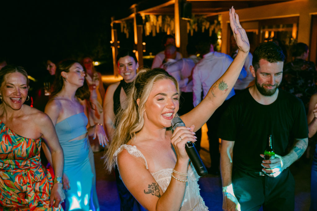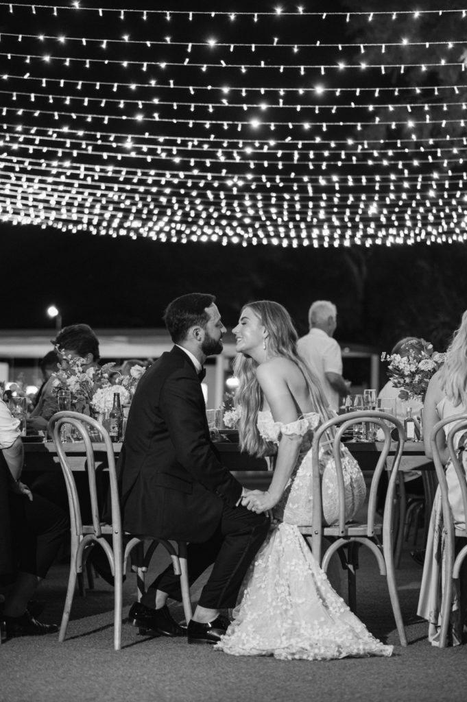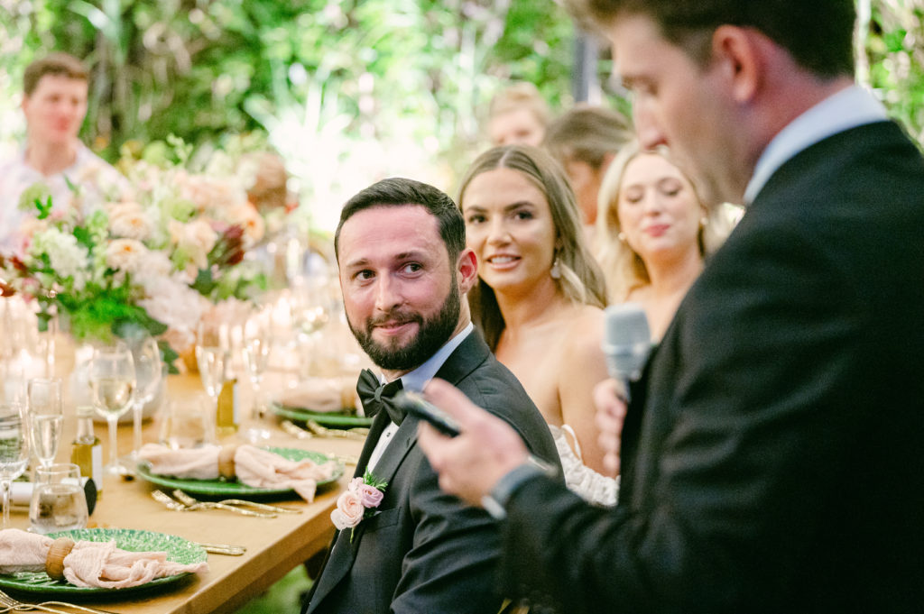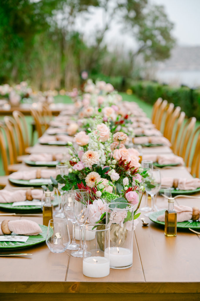 For their vibrant reception, the couple envisioned an atmosphere that was both elegant and alive with emotion. Long wooden tables were dressed with green charger plates, delicate pastel floral arrangements, and gold cutlery that added a touch of refined luxury. Guests dined beneath a canopy of twinkling fairy lights as the sky shifted from sunset to starlit blue, creating an unforgettable mood that blended romance with joyful energy.