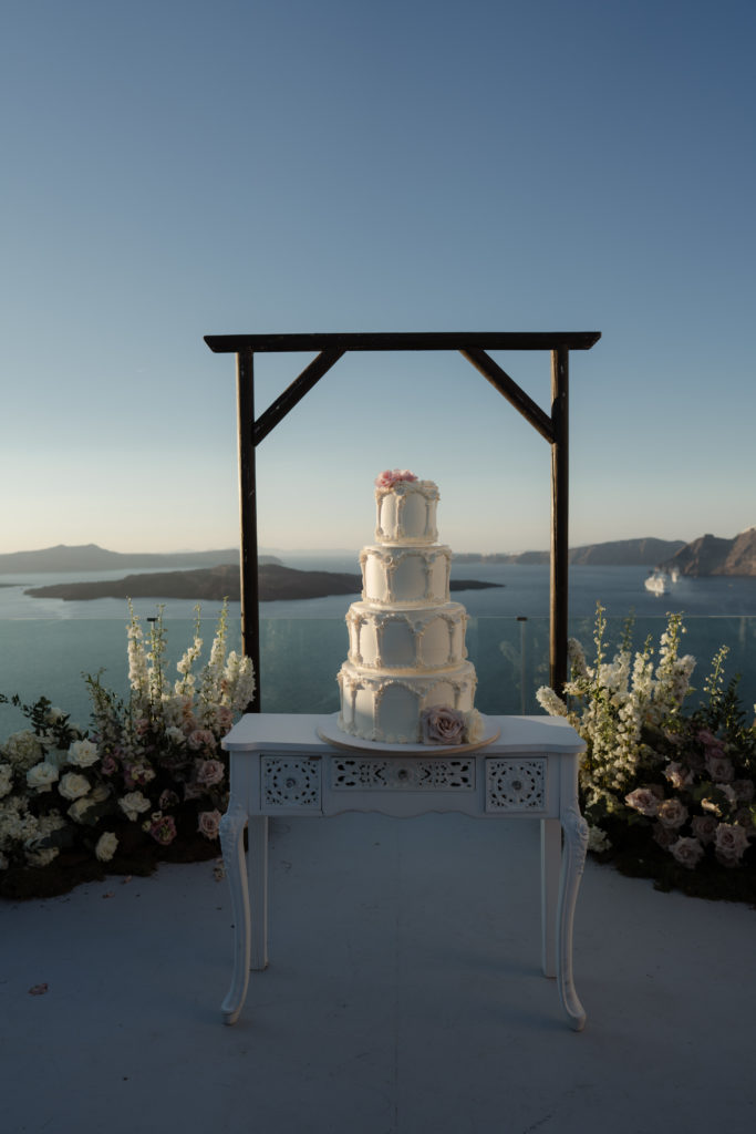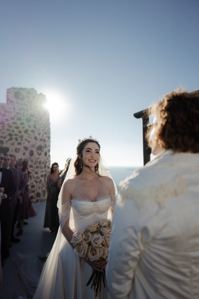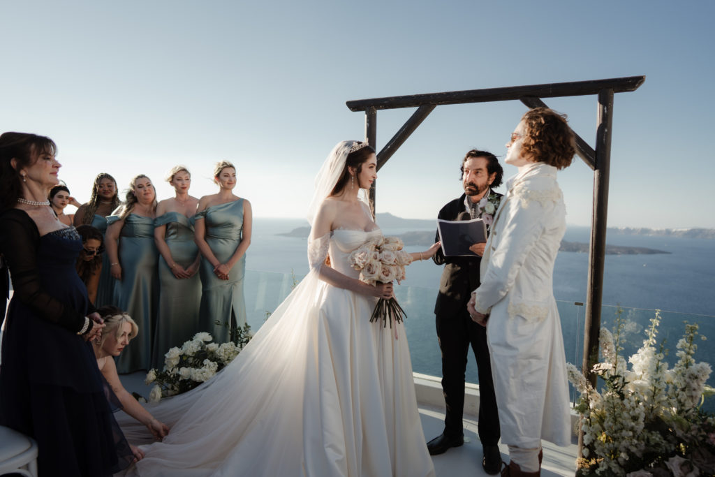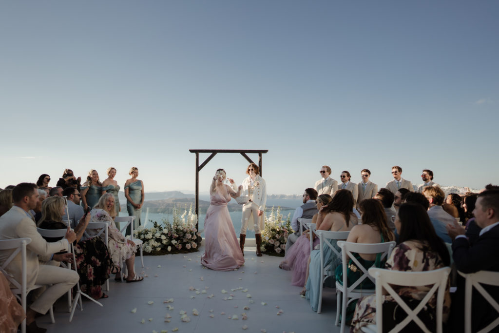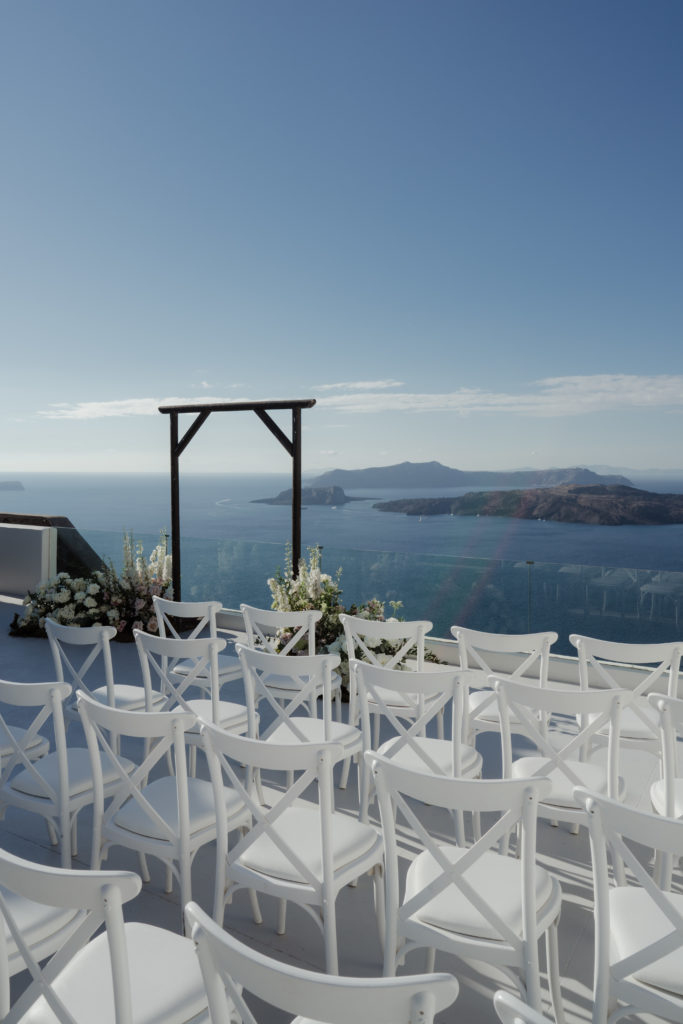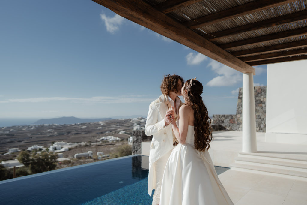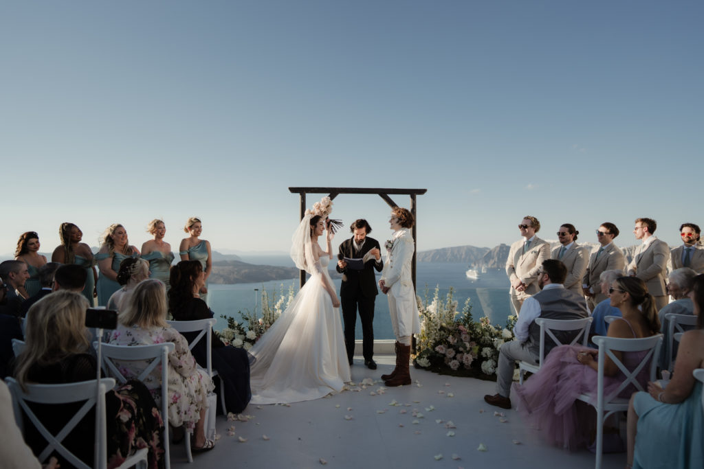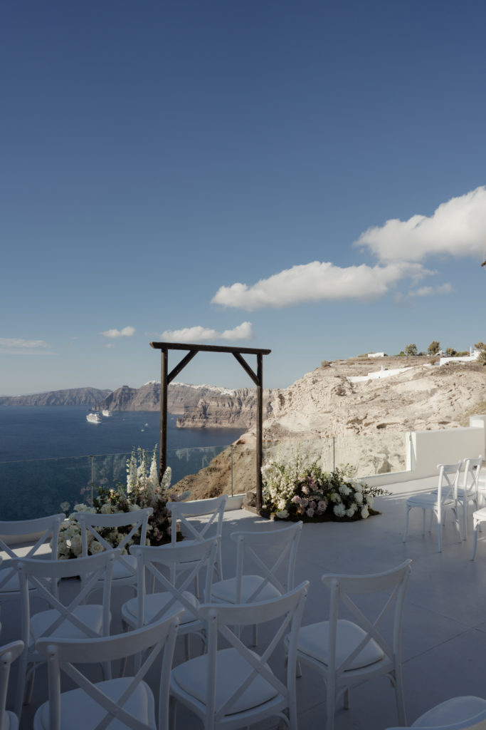 Perched atop the iconic cliffs of Santorini, this romantic destination wedding captured the essence of elegance and Mediterranean charm. The ceremony took place overlooking the sparkling caldera, where soft breezes and sweeping sea views created an unforgettable backdrop for the couple’s heartfelt vows. Surrounded by family and friends, the bride and groom exchanged “I do’s” in a perfectly serene setting that blended natural beauty with refined sophistication.