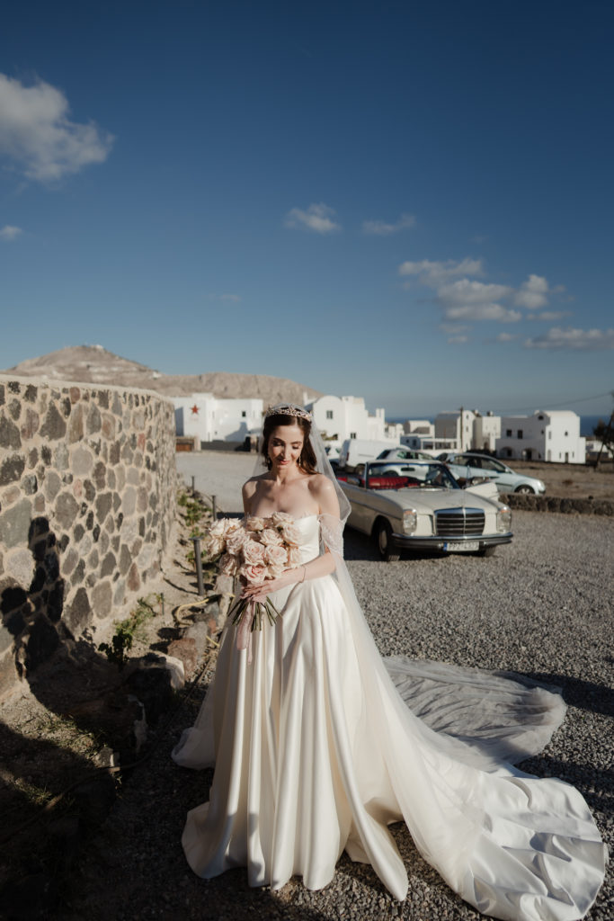 The floral palette featured delicate blush, ivory, and soft rose tones—harmonizing beautifully with the island’s warm light and pastel skyline. Arrangements of garden roses, lisianthus, and seasonal blooms framed the ceremony arch, while the bridesmaids’ muted sea-foam dresses complemented the Aegean blue below. The bride carried a bouquet of blush roses with romantic textures, adding a soft, dreamy touch to her regal bridal look and flowing gown.