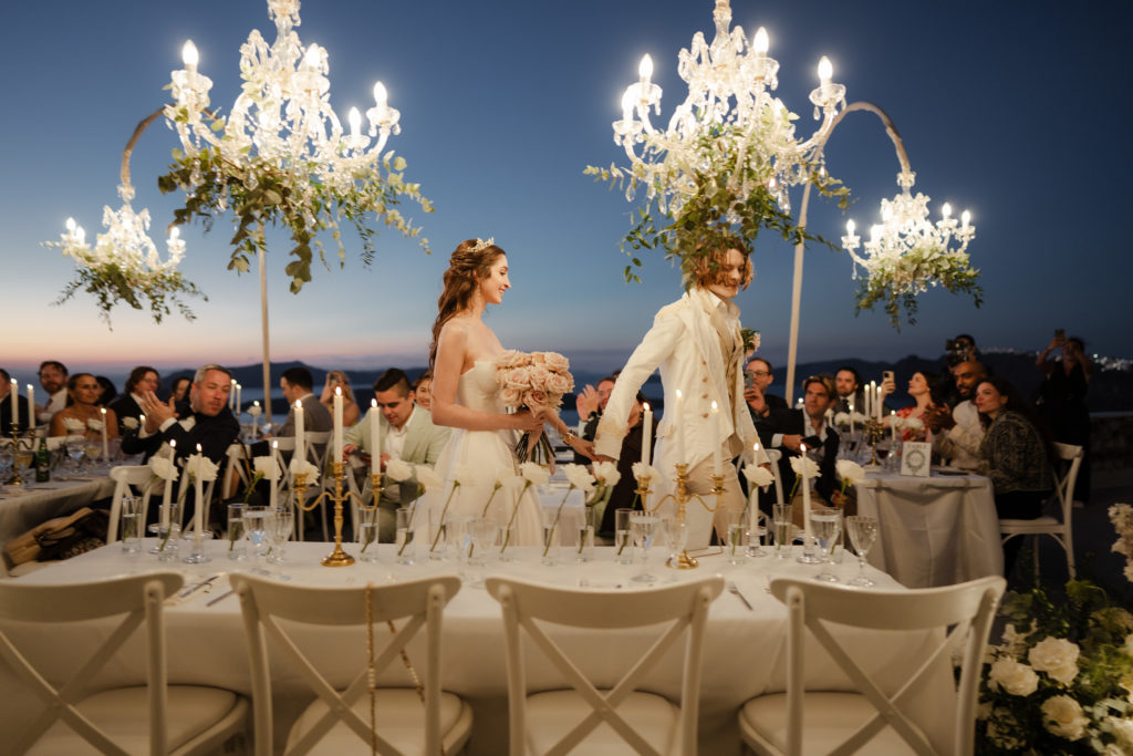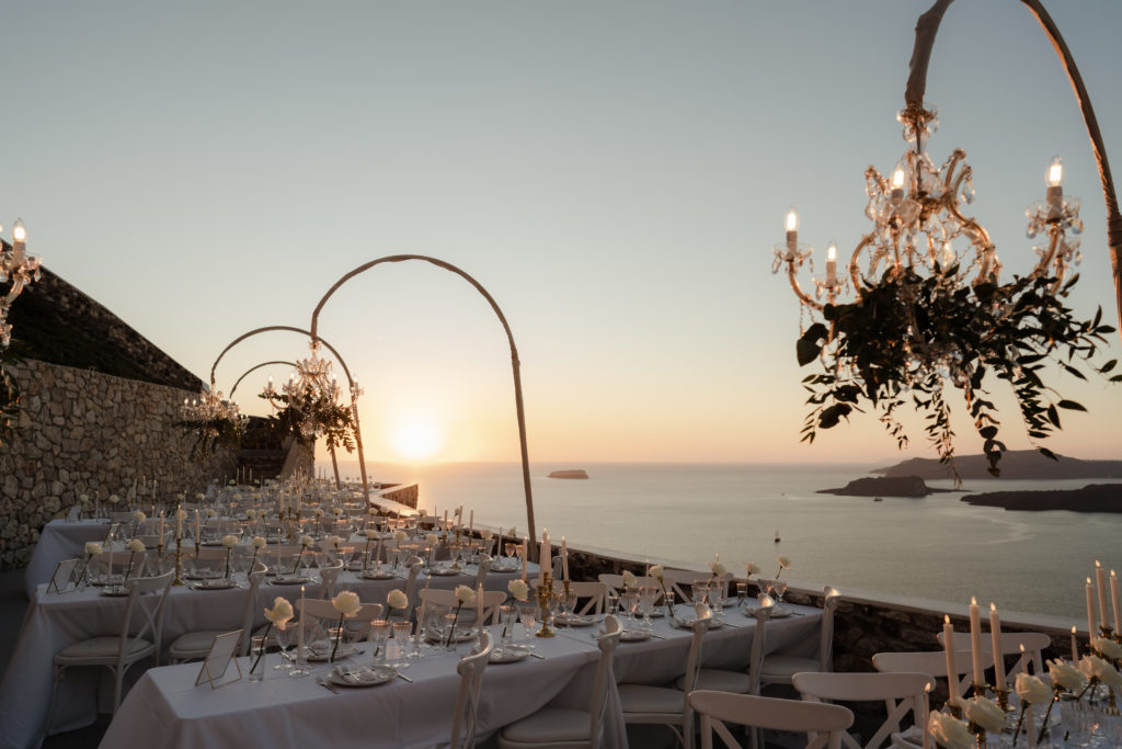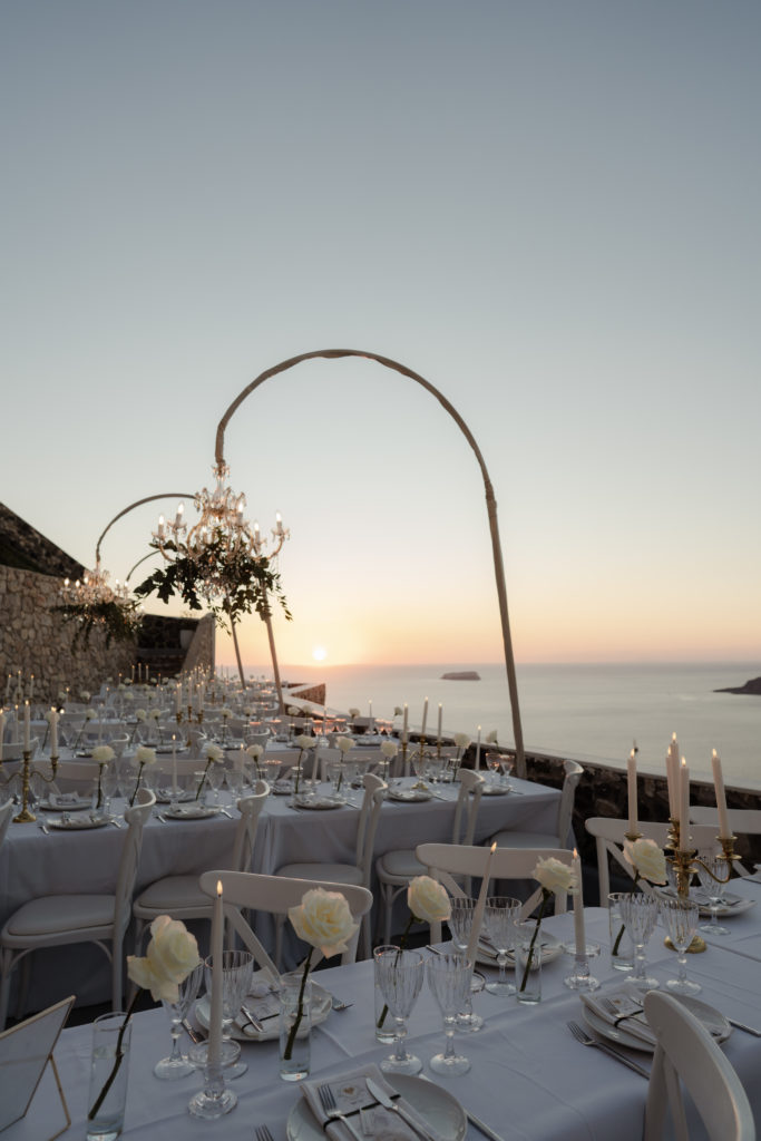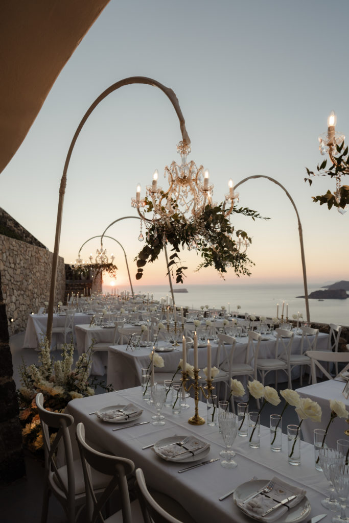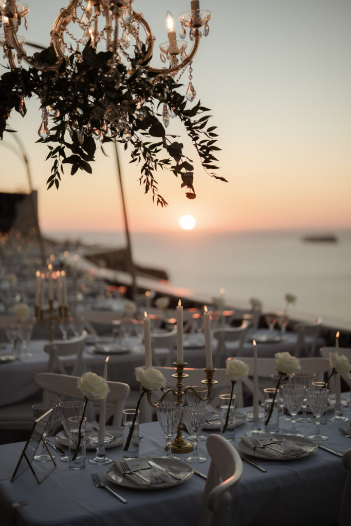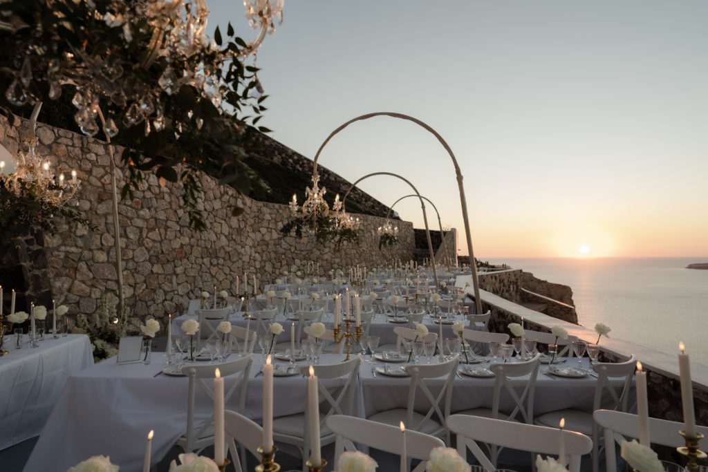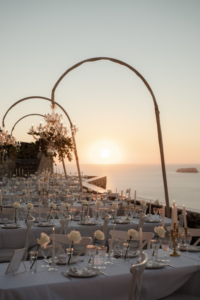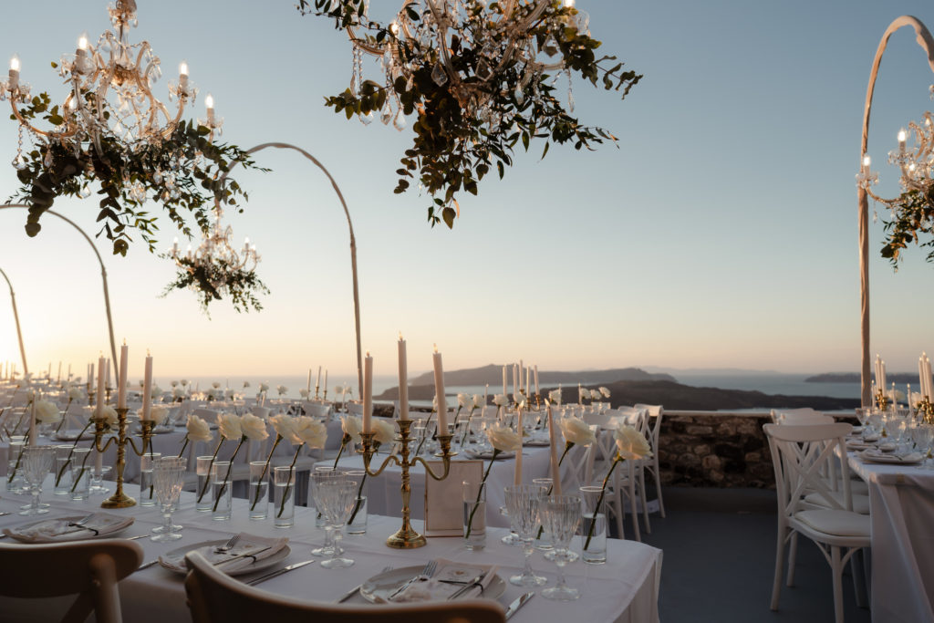 For the reception, long white tables lined the cliffside, styled with crystal chandeliers, tapered candles, and elegant gold accents that glowed as the sun dipped beneath the horizon. Chic white roses stood in minimalist vases, maintaining a clean and luxurious atmosphere. As night fell, candlelight sparkled beneath the stars, creating an ambiance of romance and celebration that perfectly reflected the magic of a Santorini destination wedding.