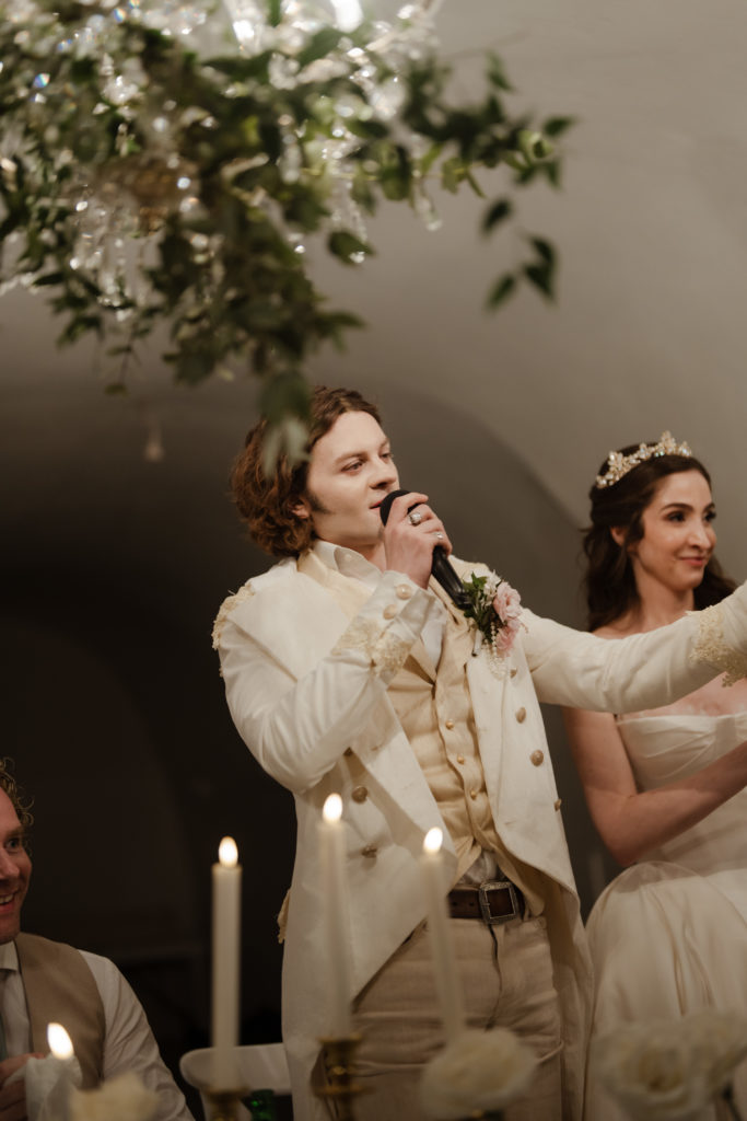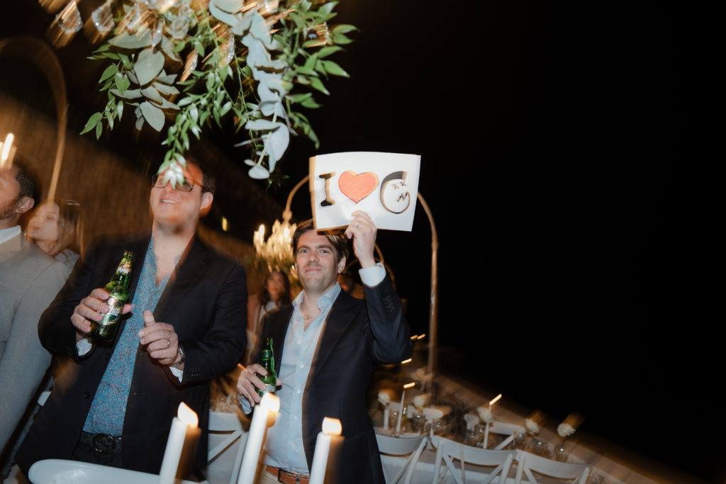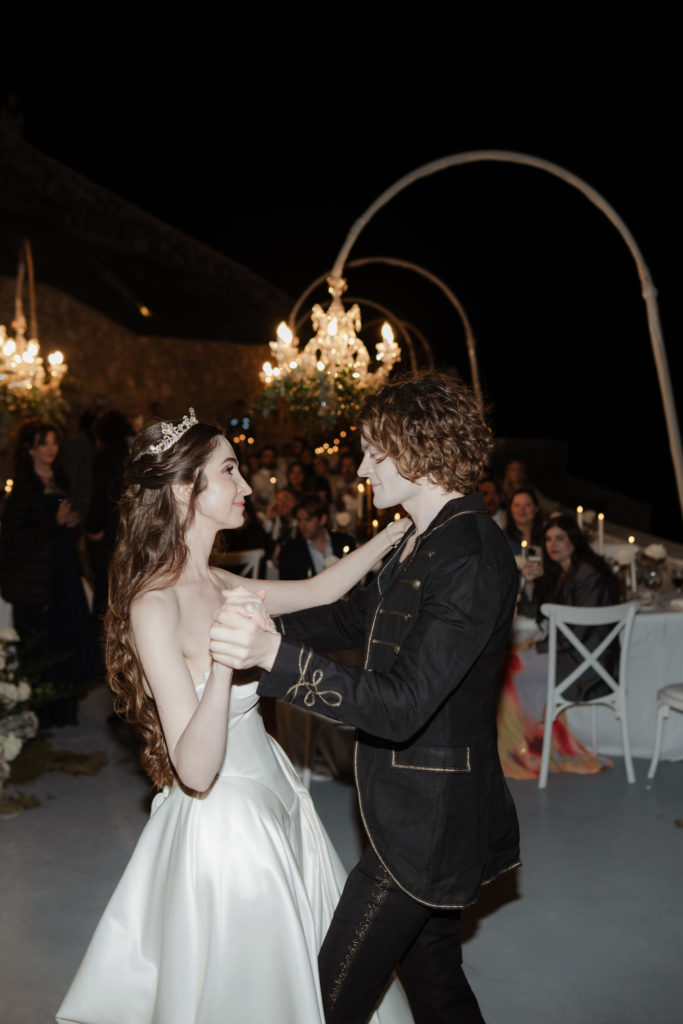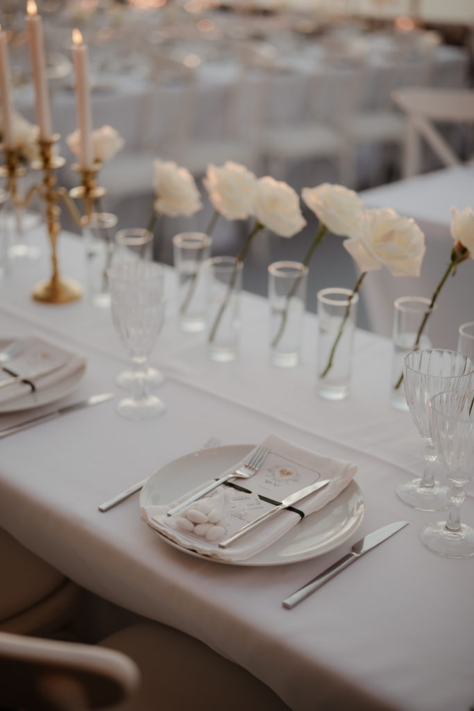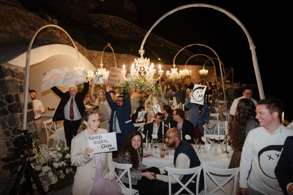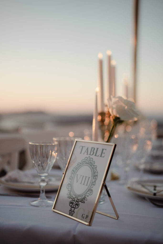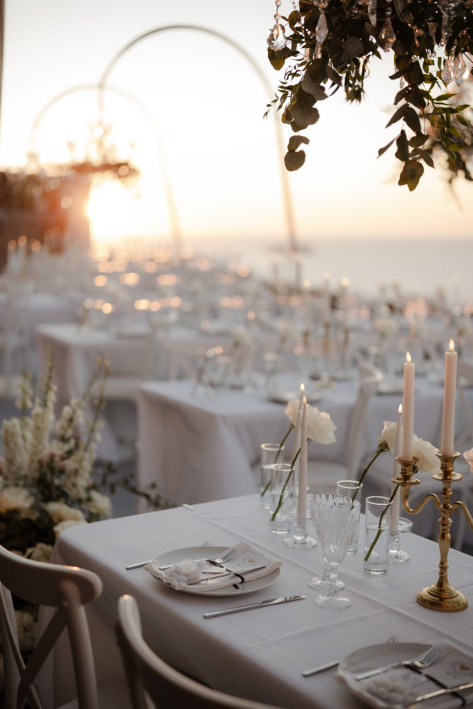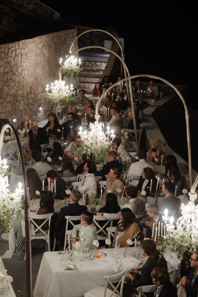 For the reception, long white tables lined the cliffside, styled with crystal chandeliers, tapered candles, and elegant gold accents that glowed as the sun dipped beneath the horizon. Chic white roses stood in minimalist vases, maintaining a clean and luxurious atmosphere. As night fell, candlelight sparkled beneath the stars, creating an ambiance of romance and celebration that perfectly reflected the magic of a Santorini destination wedding.