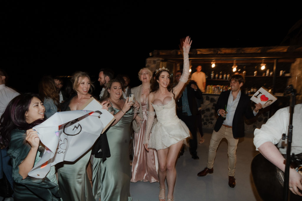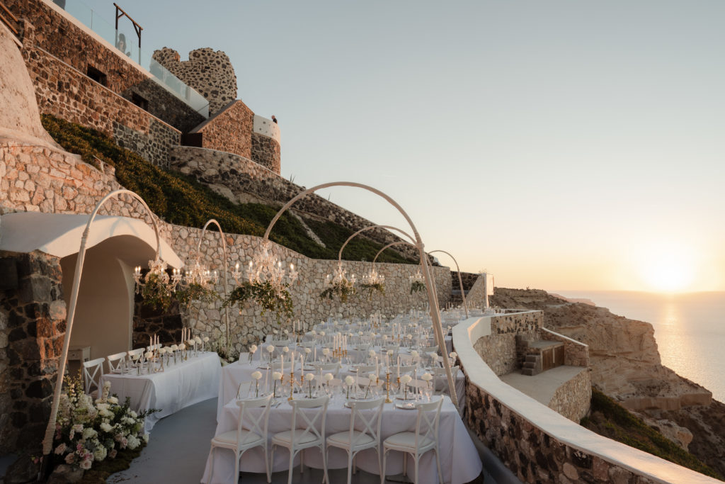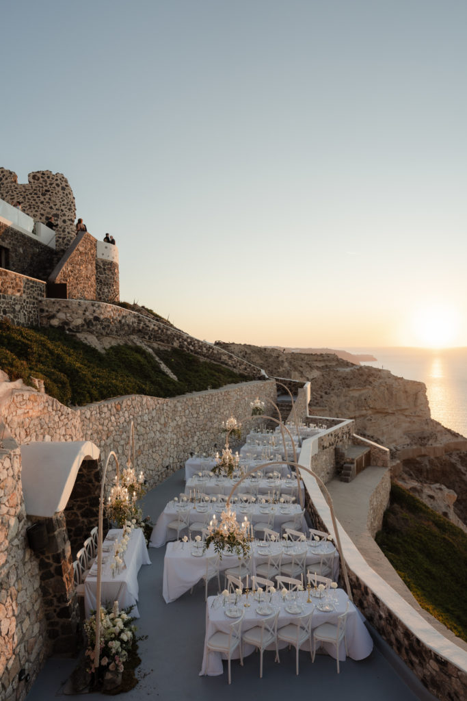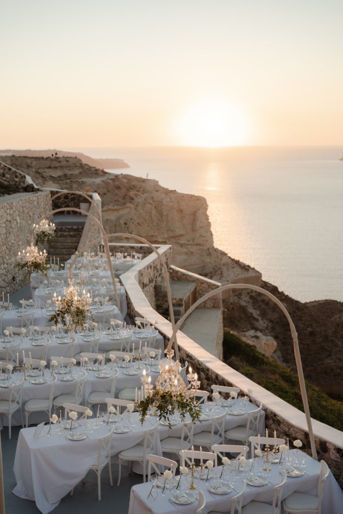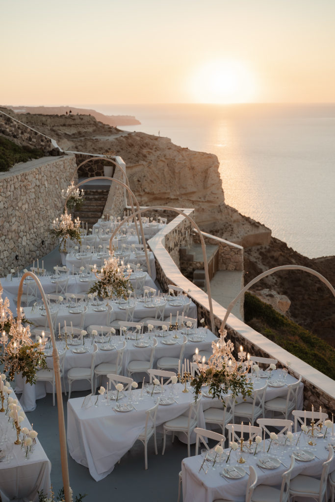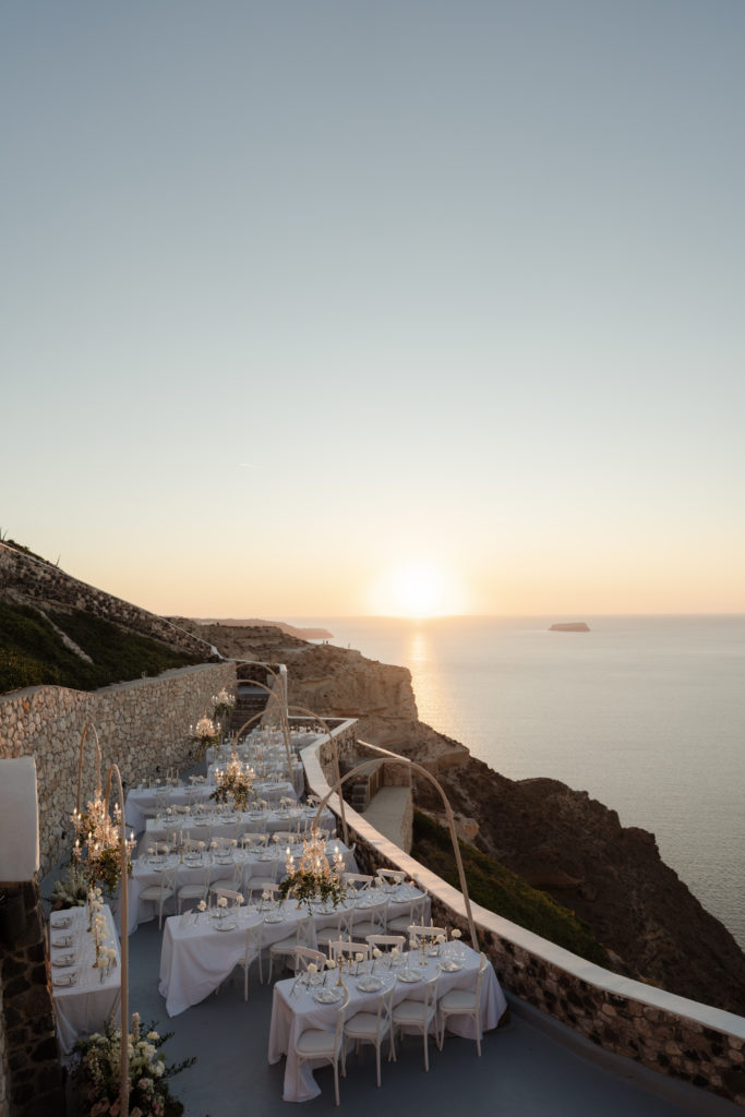 This breathtaking Santorini wedding unfolded high above the caldera, where golden sunset views met soft romantic styling. With chic florals, elegant details, and a mesmerizing cliffside atmosphere, the celebration felt like a true fairytale in the Aegean.