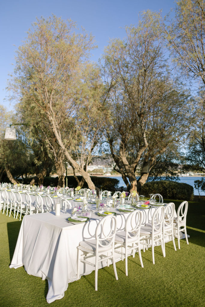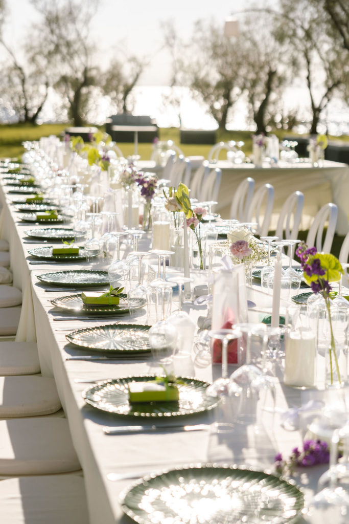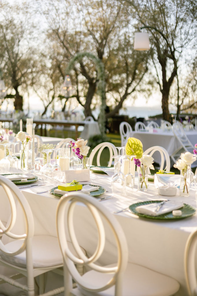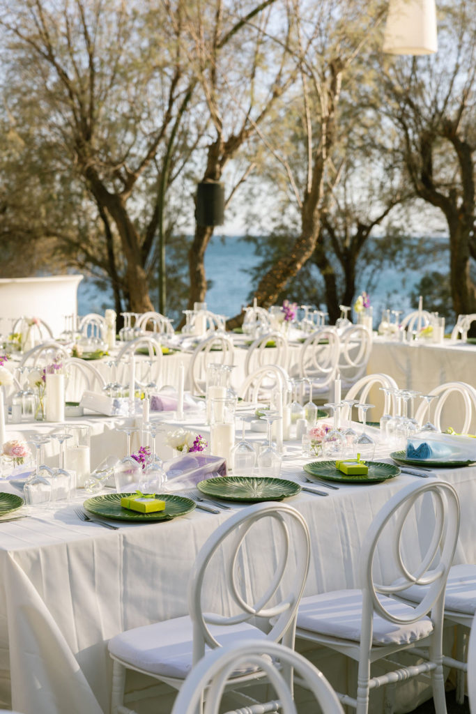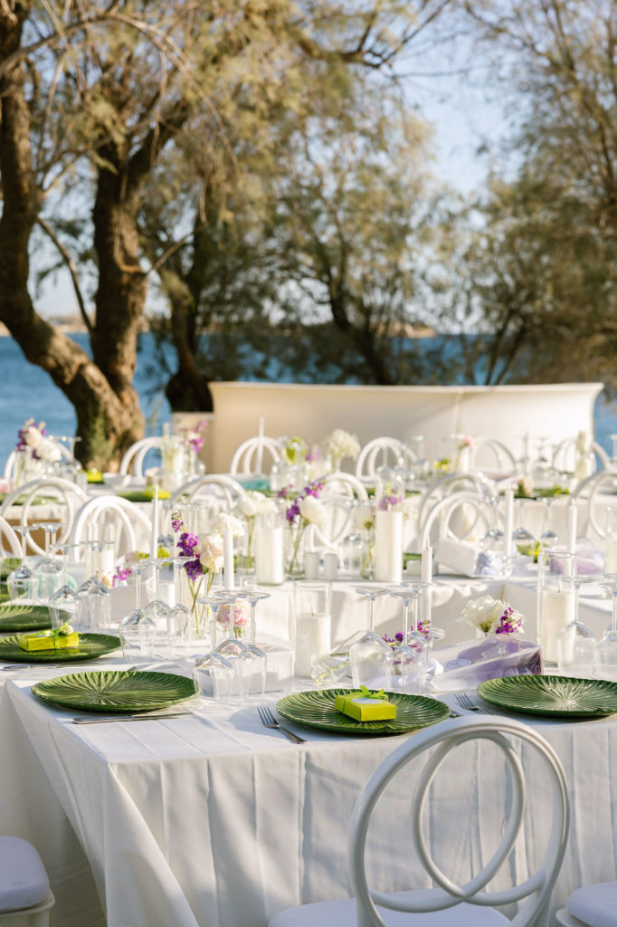 The setting is a pristine stretch along the Athens Riviera, where a long, weathered wooden table rests on a lush green lawn facing the Aegean. Emerald charger plates anchor each place setting beneath crisp ivory linens, while a pristine white napkin folds beneath a lime-green gift box, adding a playful, modern touch to the refined color story. White roses mingle with delicate baby’s breath in intimate arrangements, punctuated by sprigs of purple blooms that echo the sea’s depths, creating a palette that feels both soulful and buoyant. Glassware gleams in the sunlight, and soft candlelight will later invite a warm glow, enhancing the archways and garlands that frame the horizon.