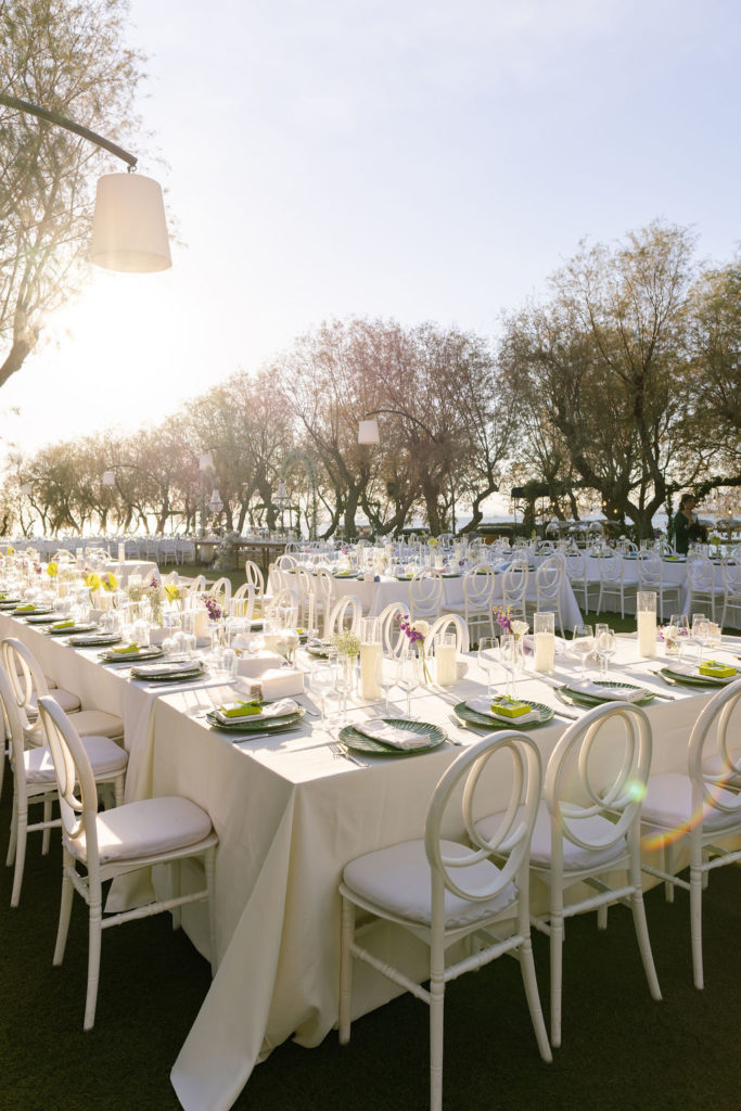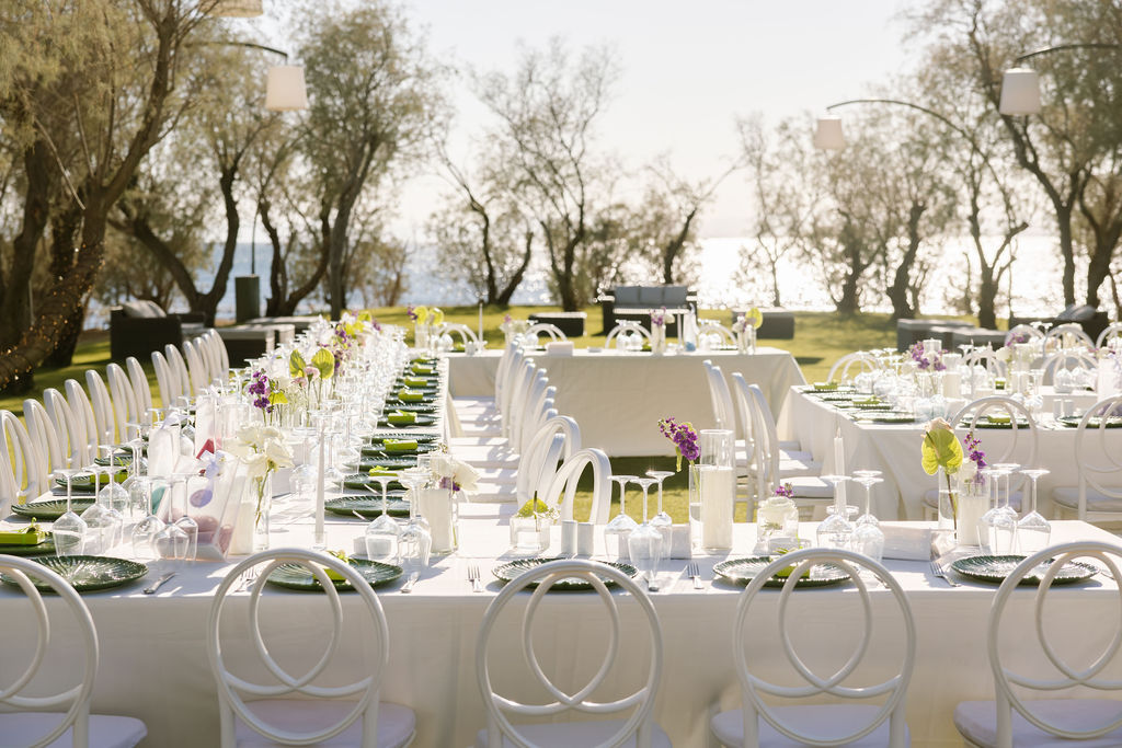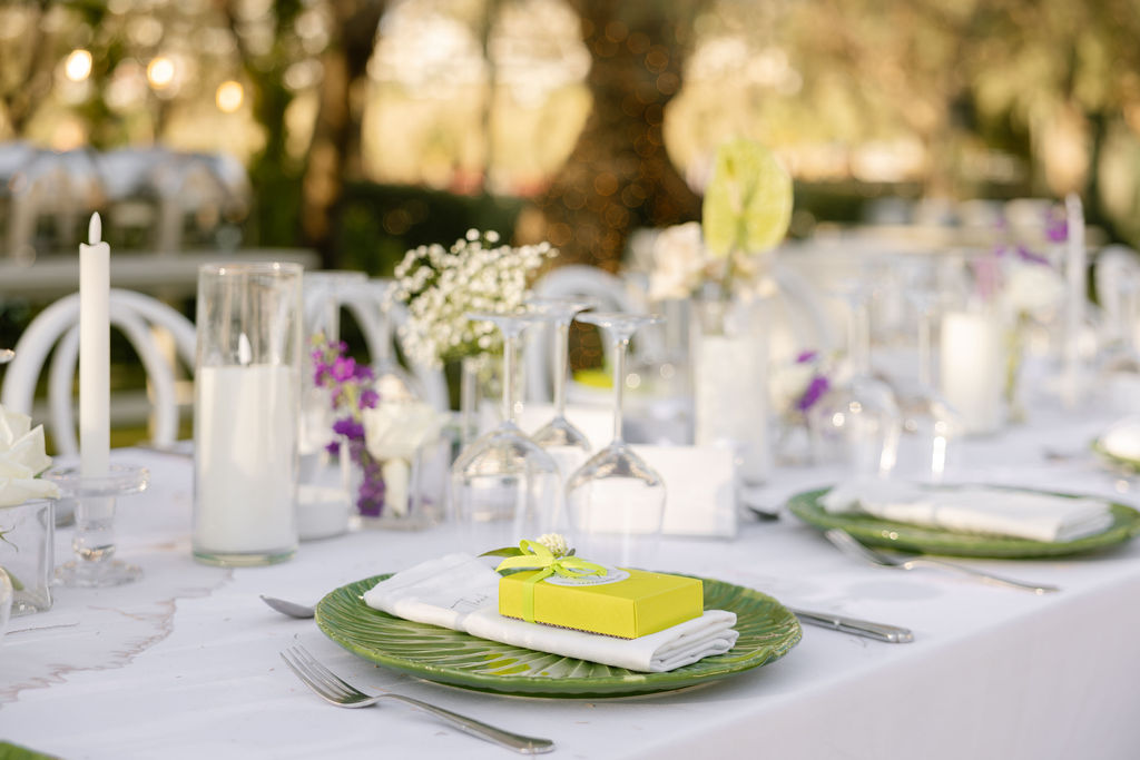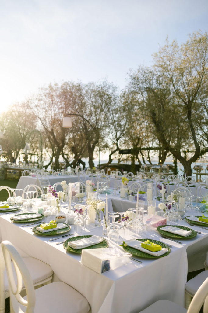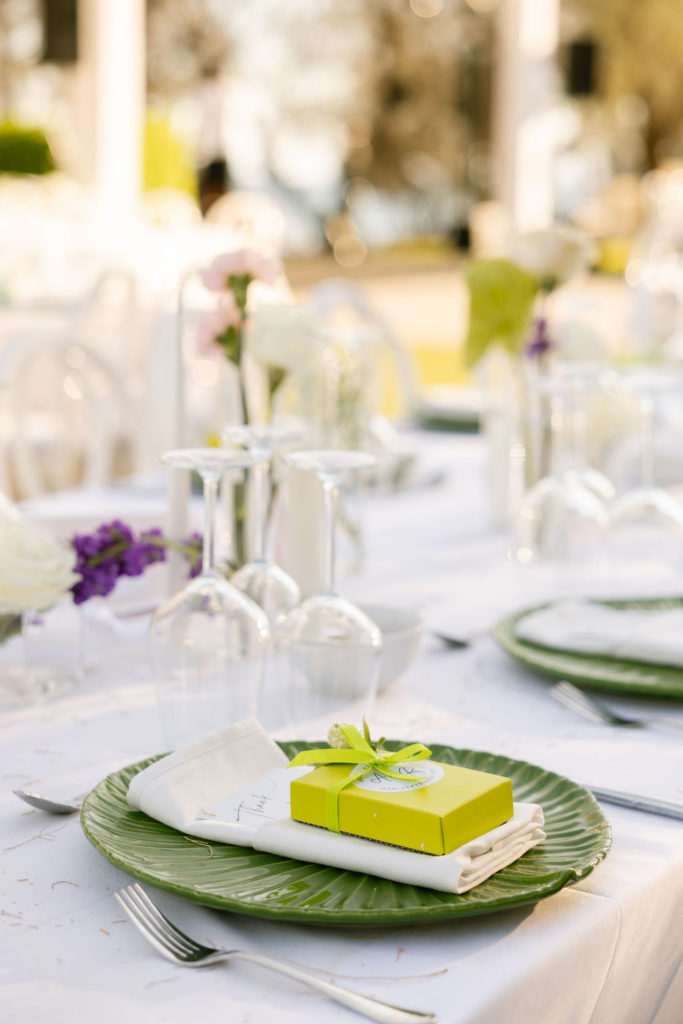 The setting is a pristine stretch along the Athens Riviera, where a long, weathered wooden table rests on a lush green lawn facing the Aegean. Emerald charger plates anchor each place setting beneath crisp ivory linens, while a pristine white napkin folds beneath a lime-green gift box, adding a playful, modern touch to the refined color story. White roses mingle with delicate baby’s breath in intimate arrangements, punctuated by sprigs of purple blooms that echo the sea’s depths, creating a palette that feels both soulful and buoyant. Glassware gleams in the sunlight, and soft candlelight will later invite a warm glow, enhancing the archways and garlands that frame the horizon.