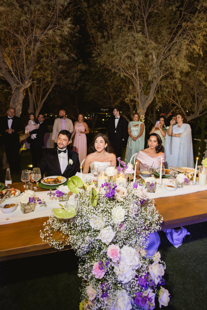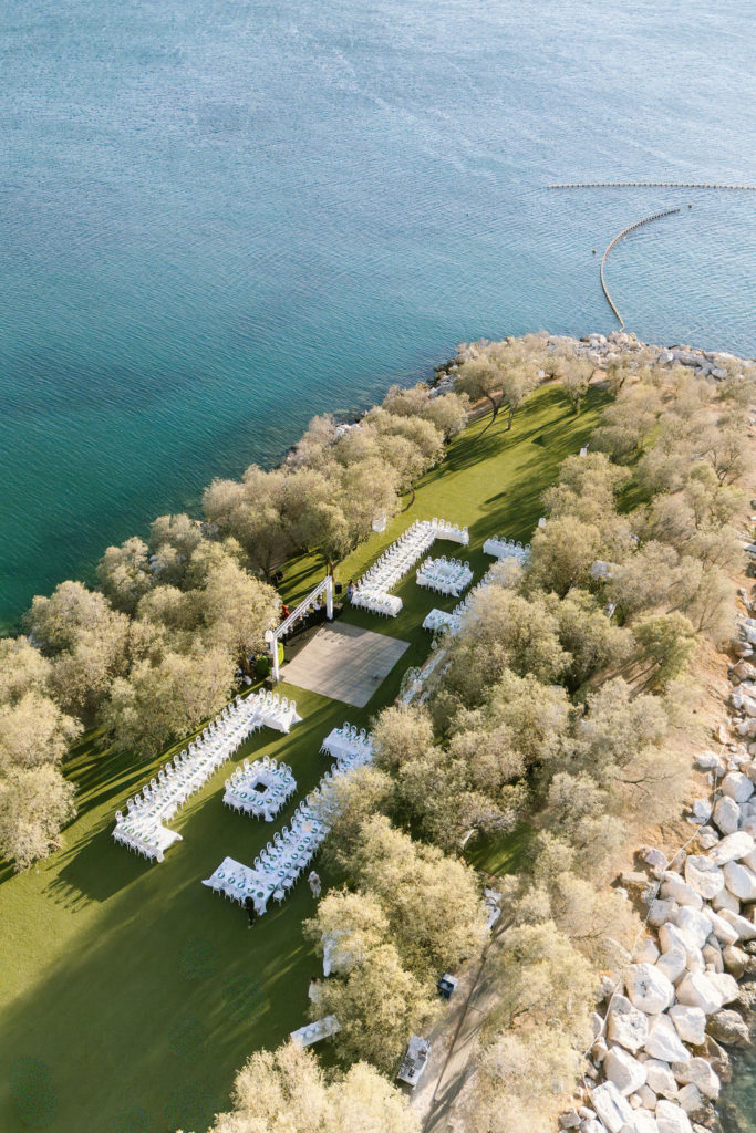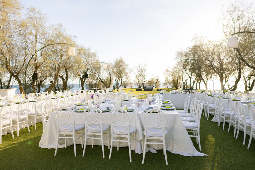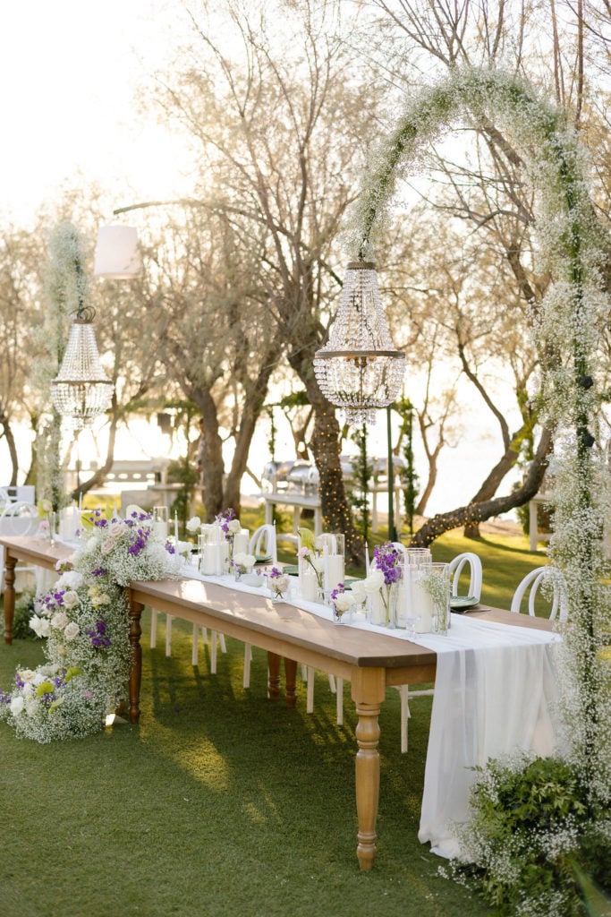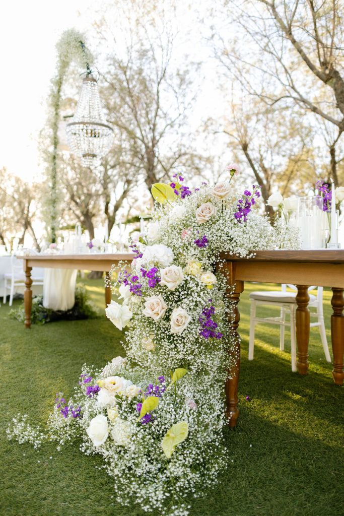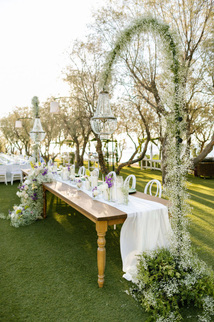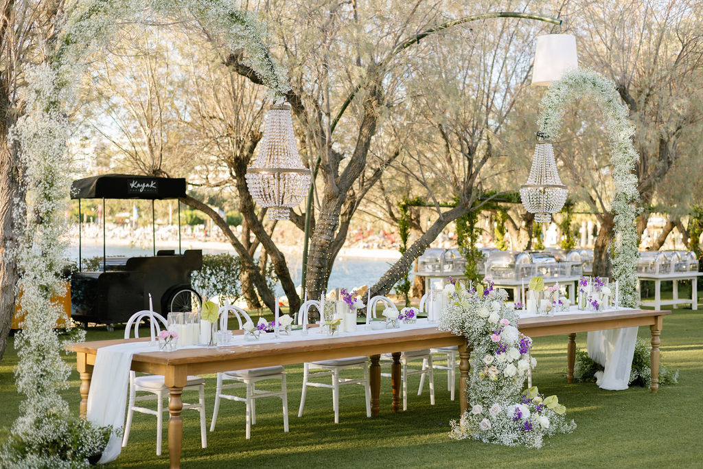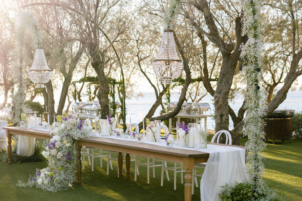 Overhead, floral garlands cascade along the terraces and wooden structures, with clusters of white roses, baby’s breath, and accents of vivid purple blooms. The centerpiece clusters are complemented by the delicate, airy feel of the arrangement—white blooms punctuated by lavender-hued florals that bring a romantic, overseas vibe to the ceremony and reception. An elegant arch, lush with greenery and blooms, acts as a focal point for vows, while the sea breeze carries the scent of the florals through the open space. Lightweight glass vases and floating candles add a layer of graceful texture, harmonizing with the clean lines of the white chairs and the subtle glow of lanterns—an ambience that blends Arabic hospitality with the light-hearted, sun-drenched wonder of the Greek coast.