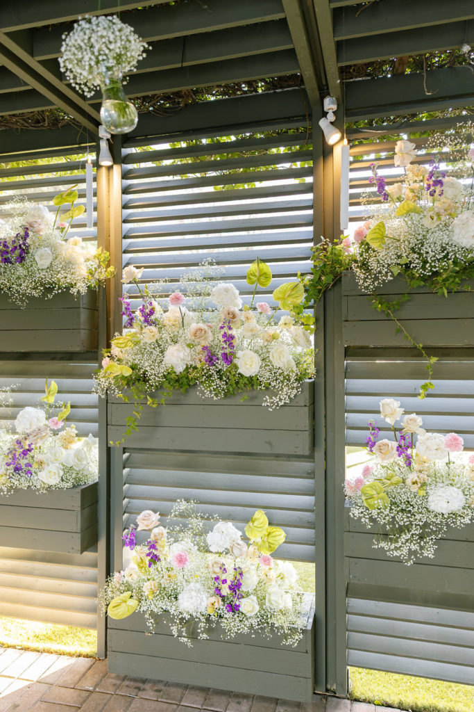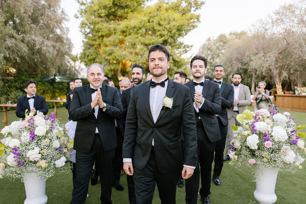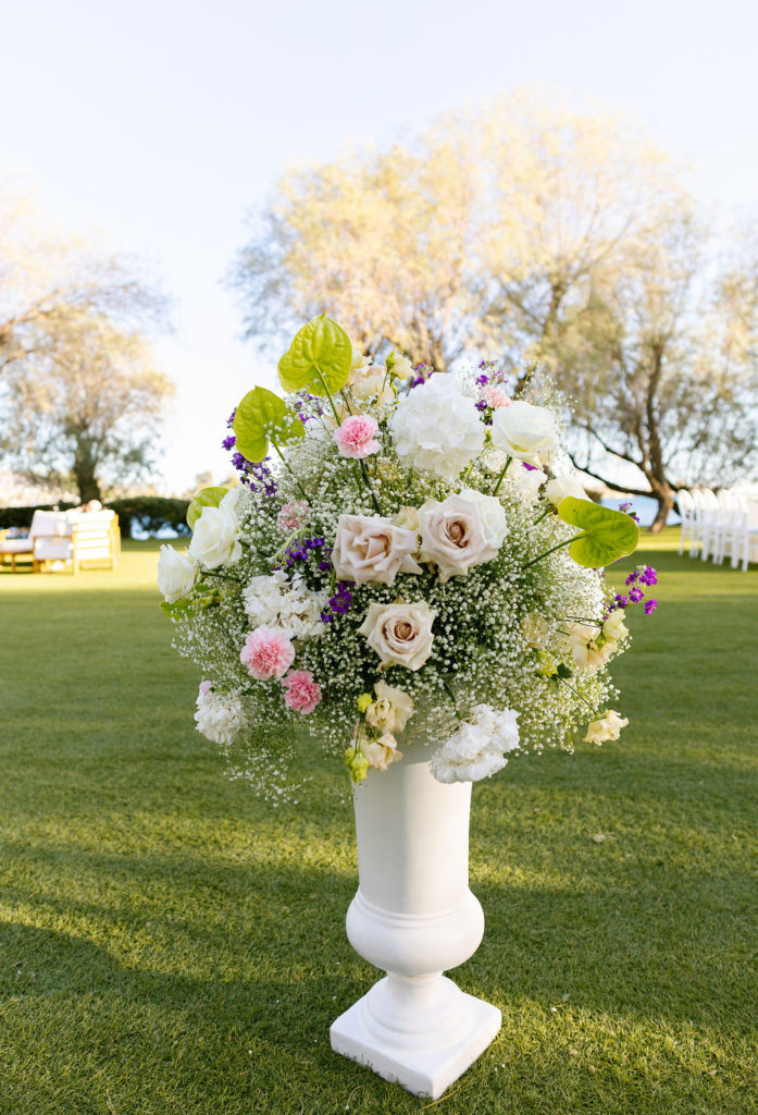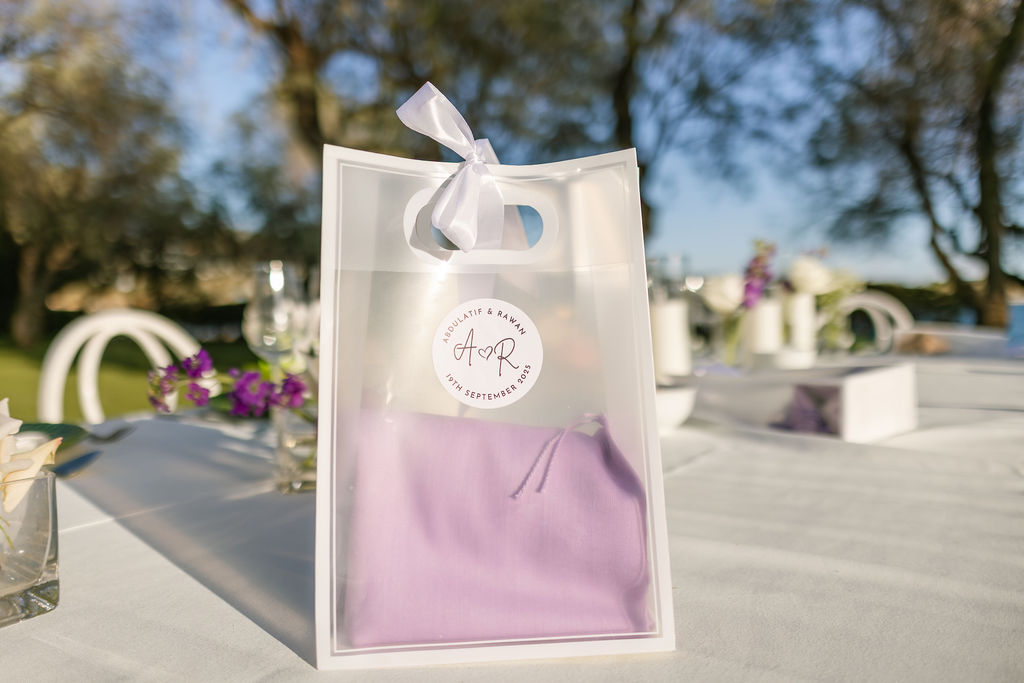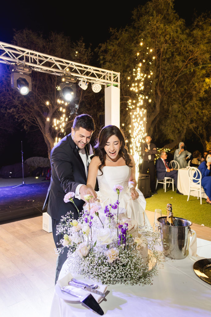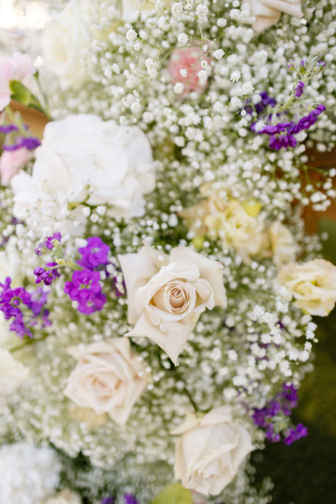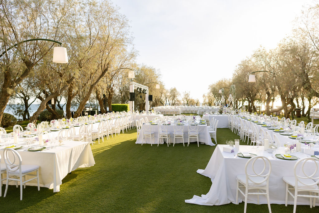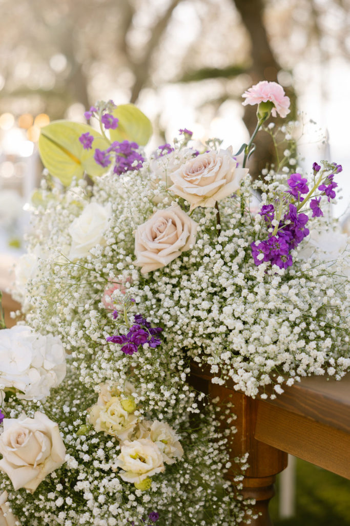Overhead, floral garlands cascade along the terraces and wooden structures, with clusters of white roses, baby’s breath, and accents of vivid purple blooms. The centerpiece clusters are complemented by the delicate, airy feel of the arrangement—white blooms punctuated by lavender-hued florals that bring a romantic, overseas vibe to the ceremony and reception. An elegant arch, lush with greenery and blooms, acts as a focal point for vows, while the sea breeze carries the scent of the florals through the open space. Lightweight glass vases and floating candles add a layer of graceful texture, harmonizing with the clean lines of the white chairs and the subtle glow of lanterns—an ambience that blends Arabic hospitality with the light-hearted, sun-drenched wonder of the Greek coast.