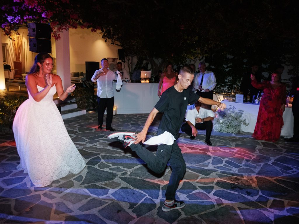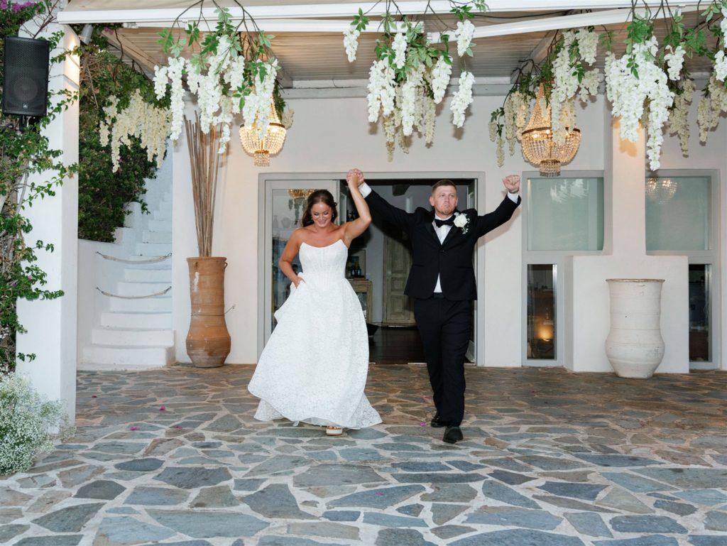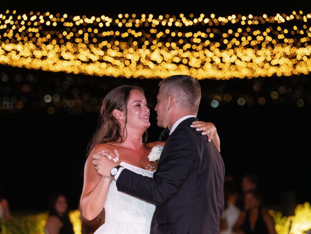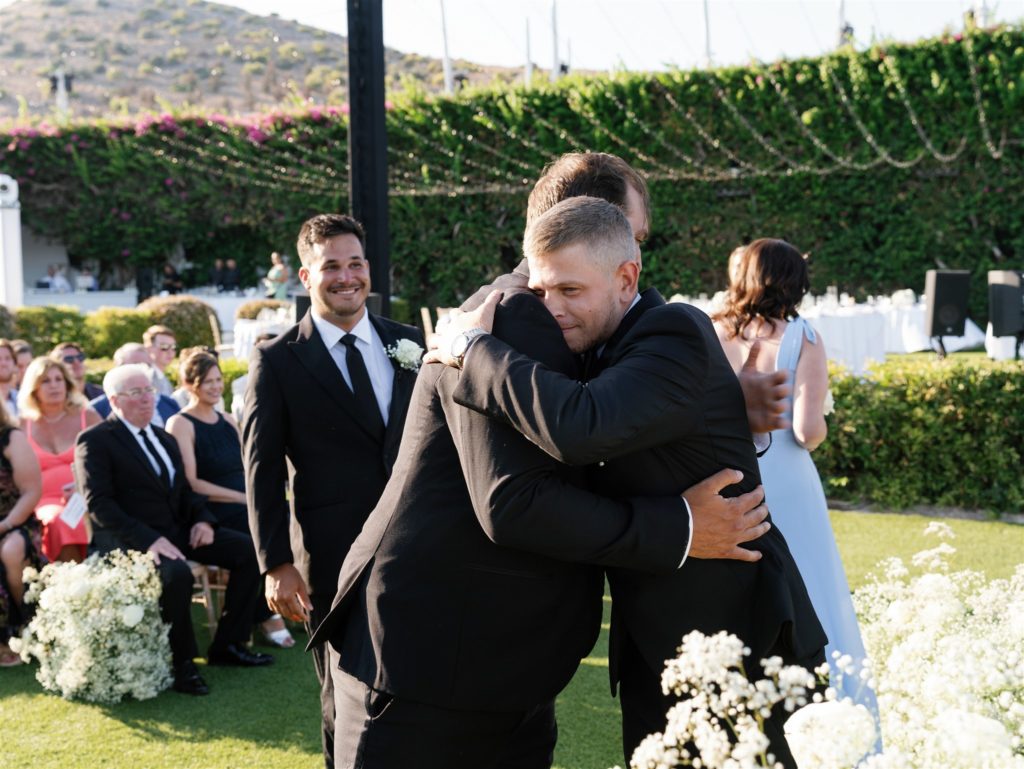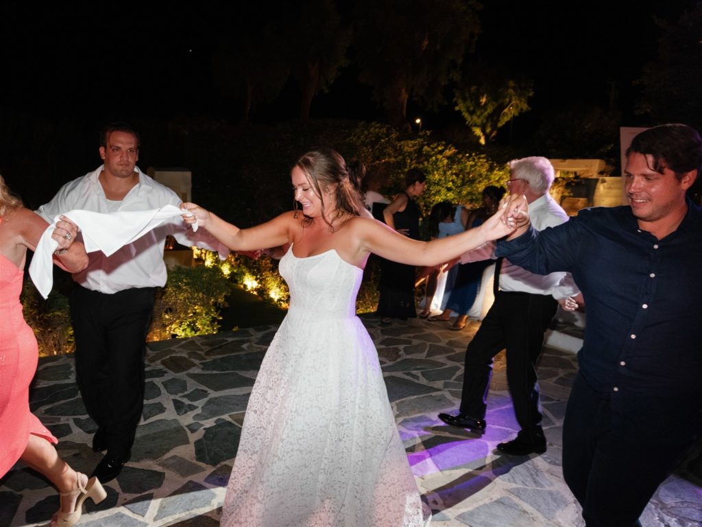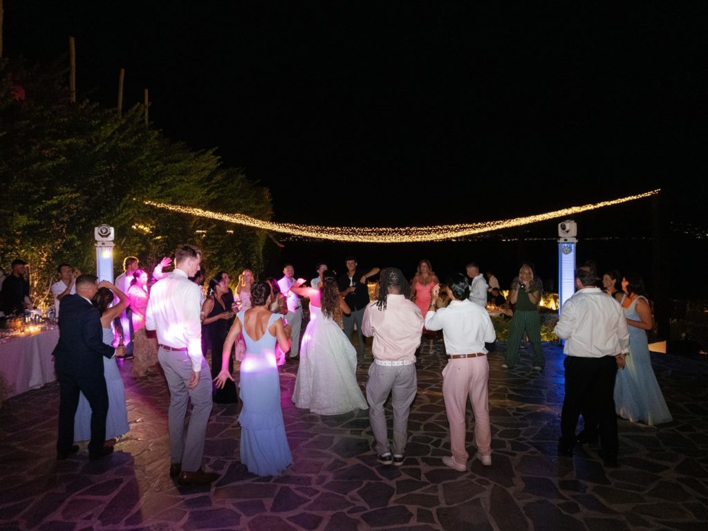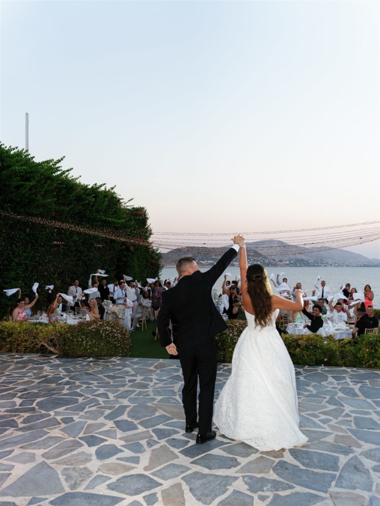 For the reception, the couple celebrated beneath cascading white florals and warm ambient lighting that created a magical evening atmosphere. Guests enjoyed a stylish outdoor dining setup, where elegant tablescapes, crystal glassware, and glowing candles set the tone for an intimate and joyful celebration. As a luxury wedding planning agency, we curated every element with precision—from décor styling to layout design—ensuring that this Athens Riviera wedding felt both personal and truly unforgettable.