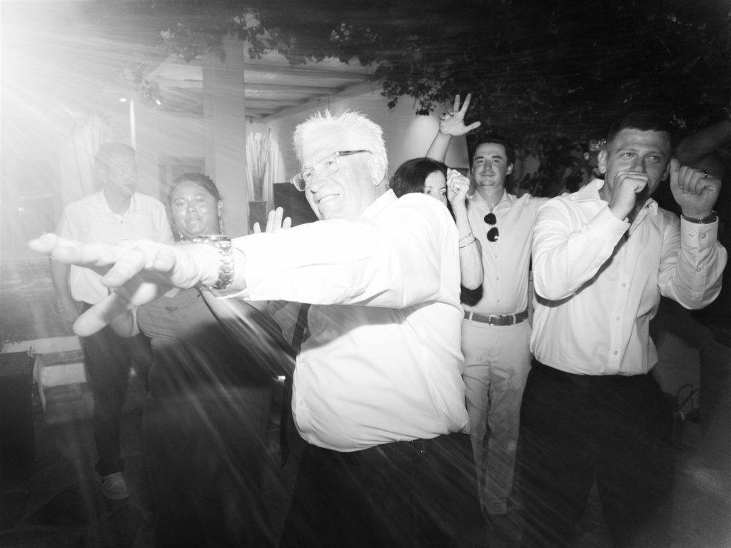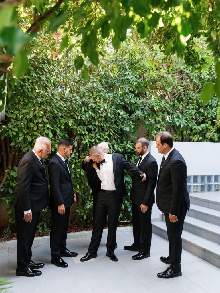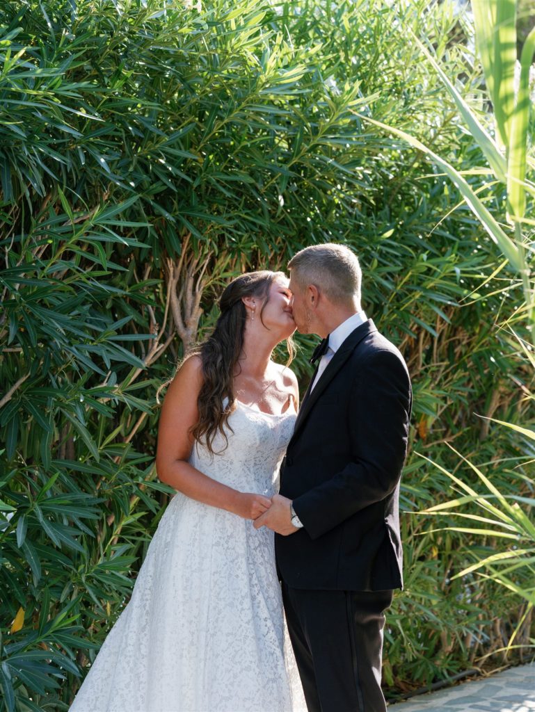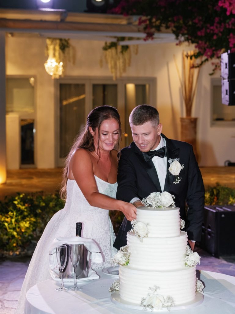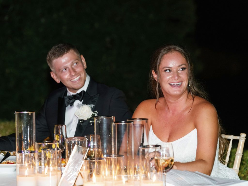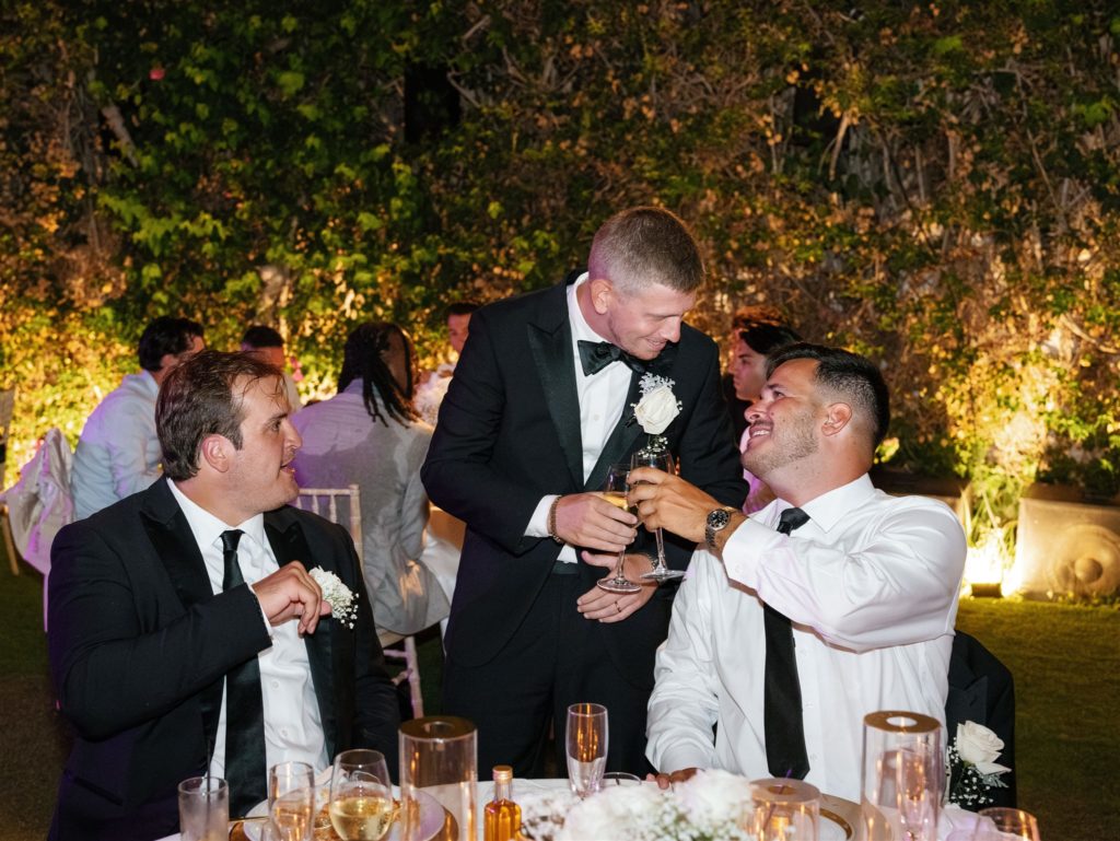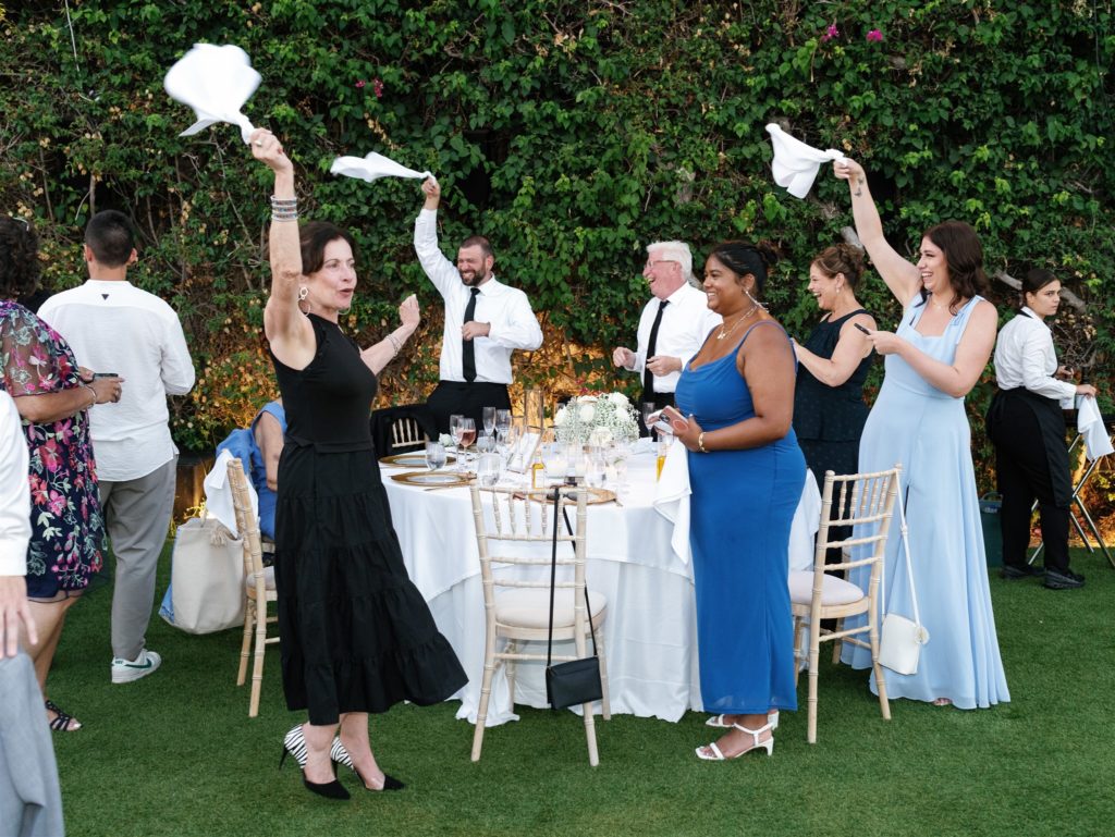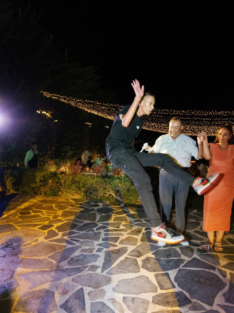 For the reception, the couple celebrated beneath cascading white florals and warm ambient lighting that created a magical evening atmosphere. Guests enjoyed a stylish outdoor dining setup, where elegant tablescapes, crystal glassware, and glowing candles set the tone for an intimate and joyful celebration. As a luxury wedding planning agency, we curated every element with precision—from décor styling to layout design—ensuring that this Athens Riviera wedding felt both personal and truly unforgettable.