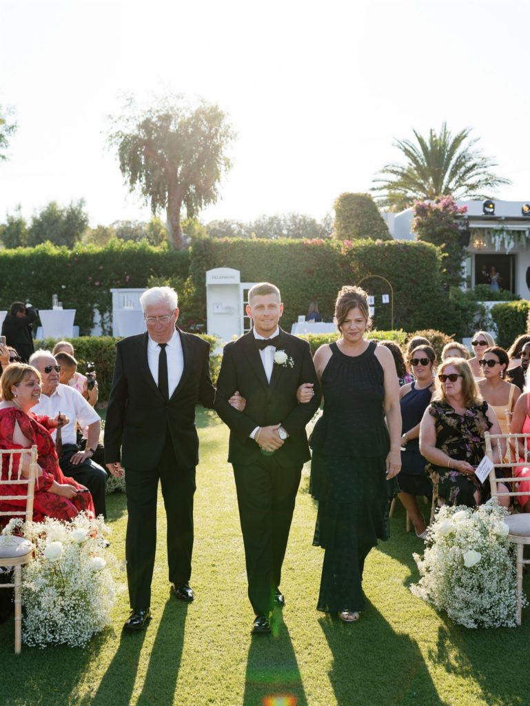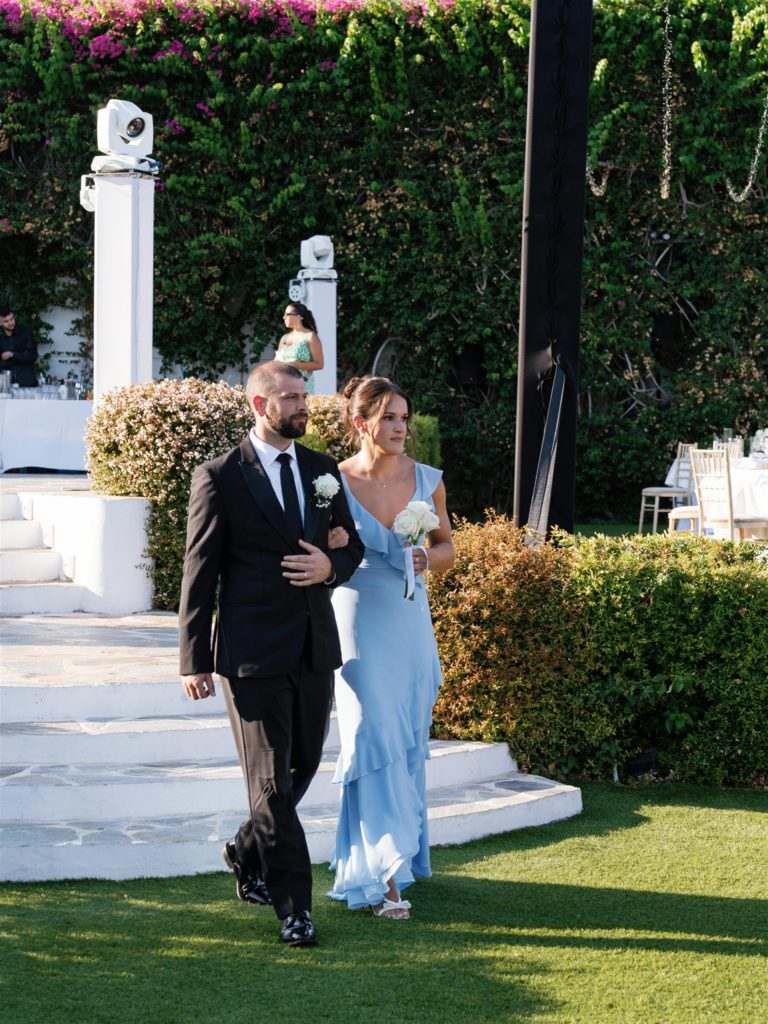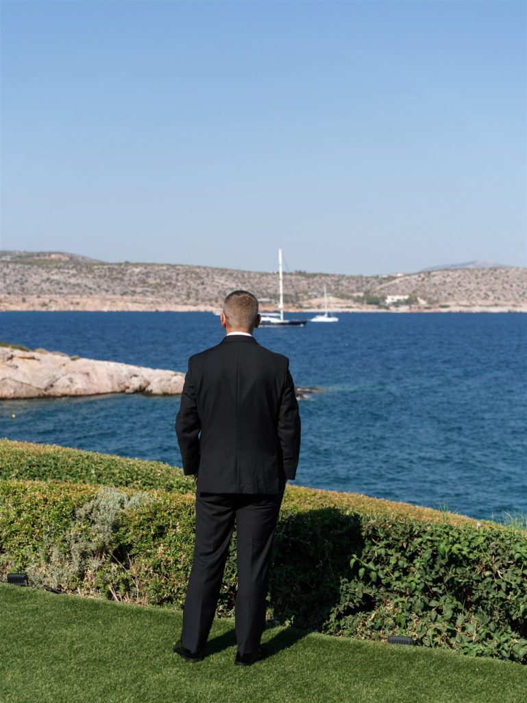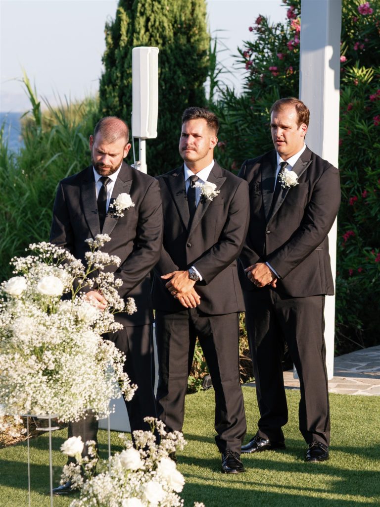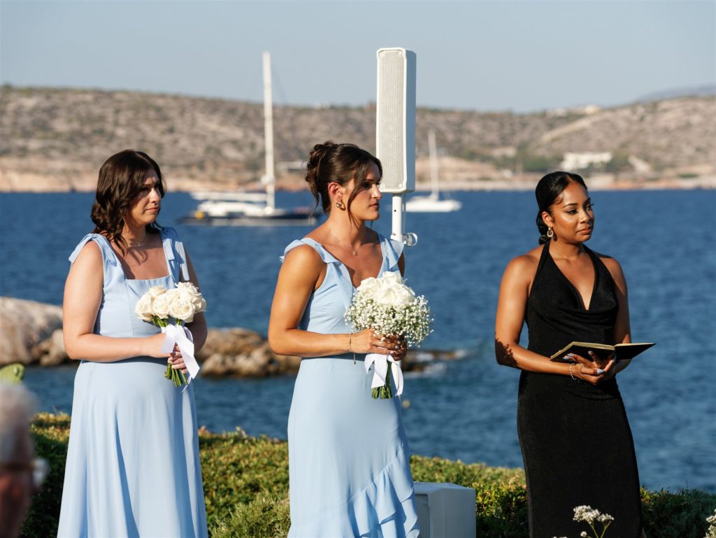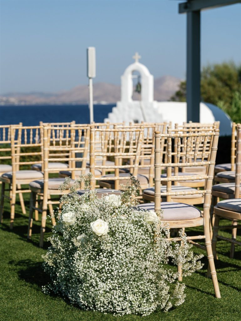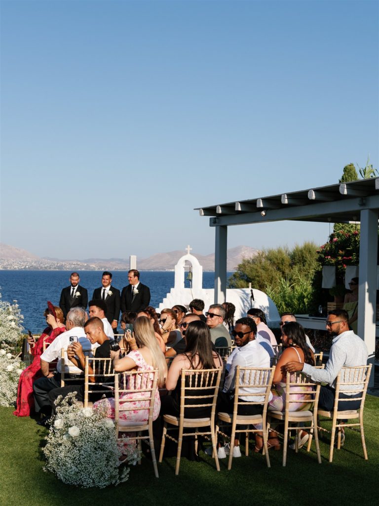 This unforgettable wedding took place on the glamorous Athens Riviera, a destination known for its serene beaches, golden light, and luxurious coastal venues. The ceremony space overlooked the deep blue Aegean Sea, creating a breathtaking natural backdrop for the couple’s vows. Soft white florals, airy greenery, and natural textures blended seamlessly with the landscape, highlighting the beauty of the venue without overpowering it. Every detail was designed to reflect understated romance and modern Greek elegance.