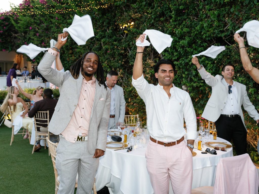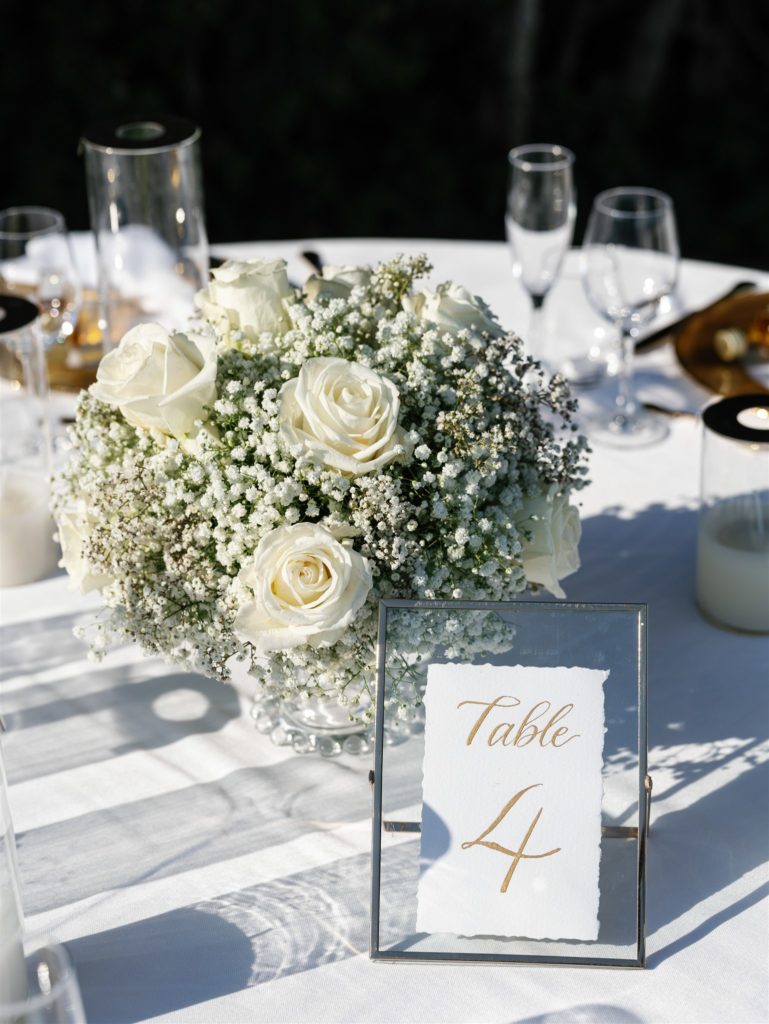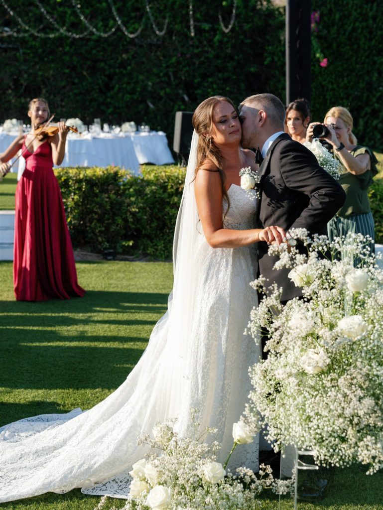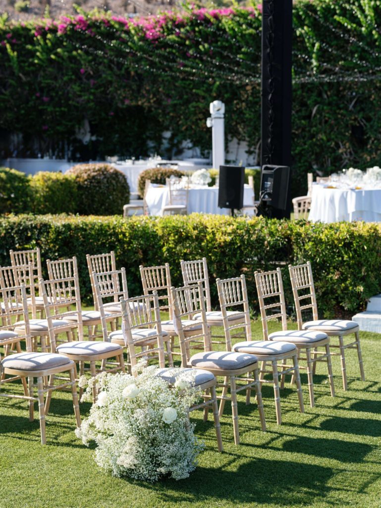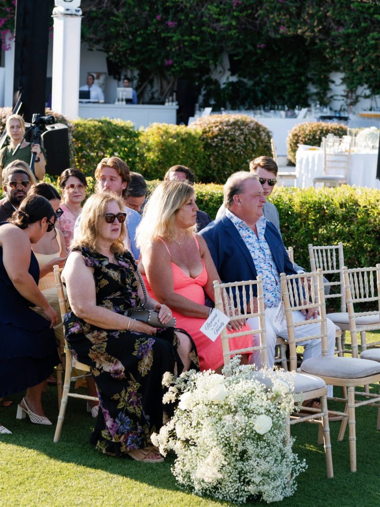 The floral design focused on a palette of white roses, baby’s breath, and gentle greenery—creating a look that was fresh, timeless, and effortlessly chic. The ceremony featured thoughtfully placed floral clouds and aisle arrangements, enhancing the open-air ambiance with soft organic shapes. Subtle decorative elements such as natural wood chairs, Mediterranean pottery, and textured linens added layers of sophistication while maintaining a relaxed coastal aesthetic. These romantic touches complemented the gentle seaside breeze and sunlit views of the Riviera.